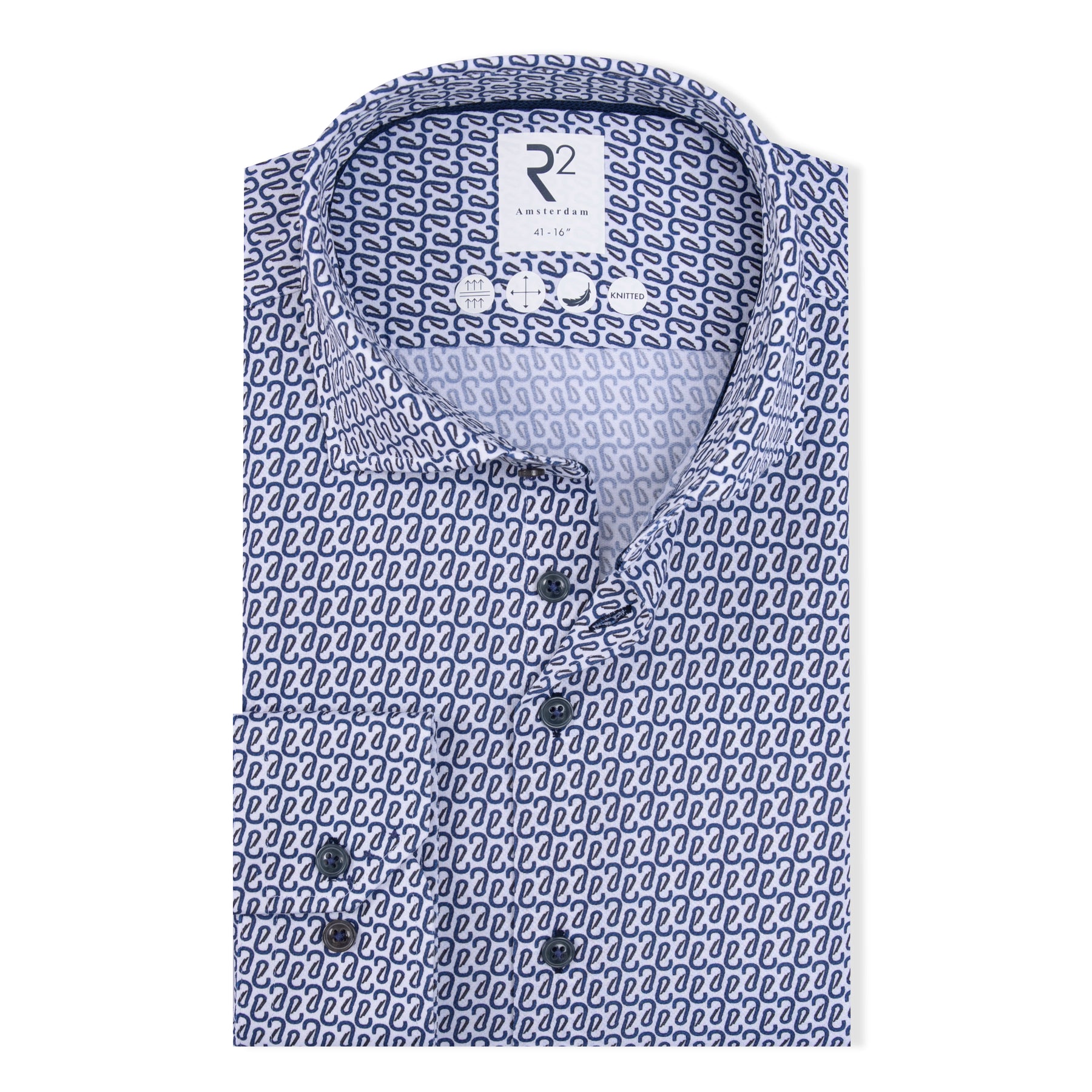 Nowoczesna koszula męska z geometrycznym wzorem w odcieniach granatu i bieli. Wykonana z elastycznej, dzianinowej tkaniny typu knitted, która zapewnia komfort, przewiewność i idealne dopasowanie do sylwetki. Model wyróżnia się klasycznym kołnierzykiem, granatowymi guzikami oraz kontrastowym obszyciem wnętrza kołnierza. Subtelny, powtarzalny wzór nadaje koszuli charakteru — łącząc elegancję z nowoczesnym, swobodnym stylem. Świetnie sprawdzi się zarówno w stylizacjach biurowych, jak i casualowych — w zestawie z chinosami, jeansami lub marynarką.
