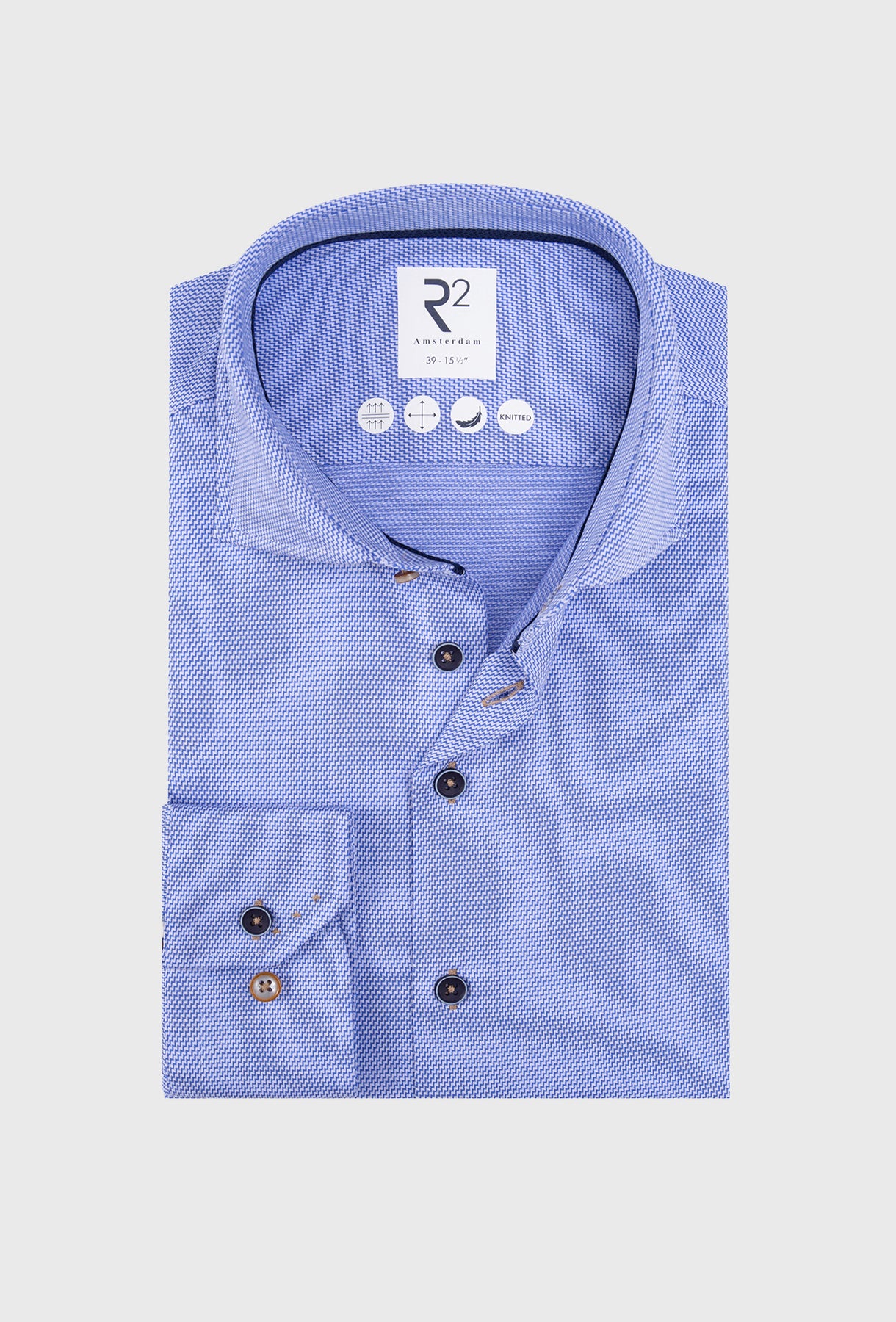 Klasyczna koszula męska w odcieniu jasnego niebieskiego, wykonana z elastycznej dzianiny typu knitted, która łączy elegancję z najwyższym komfortem noszenia. Delikatny, drobny splot tkaniny nadaje jej wyjątkową strukturę i subtelny charakter. Model posiada klasyczny kołnierzyk, kontrastowe guziki w odcieniach granatu i brązu oraz drobne detale wykończeniowe wewnątrz kołnierza. Koszula świetnie dopasowuje się do sylwetki, zapewniając swobodę ruchów i elegancki wygląd w każdej sytuacji. Uniwersalny design sprawia, że idealnie sprawdzi się zarówno w stylizacjach biznesowych, jak i codziennych — w zestawie z marynarką, chinosami lub jeansami.