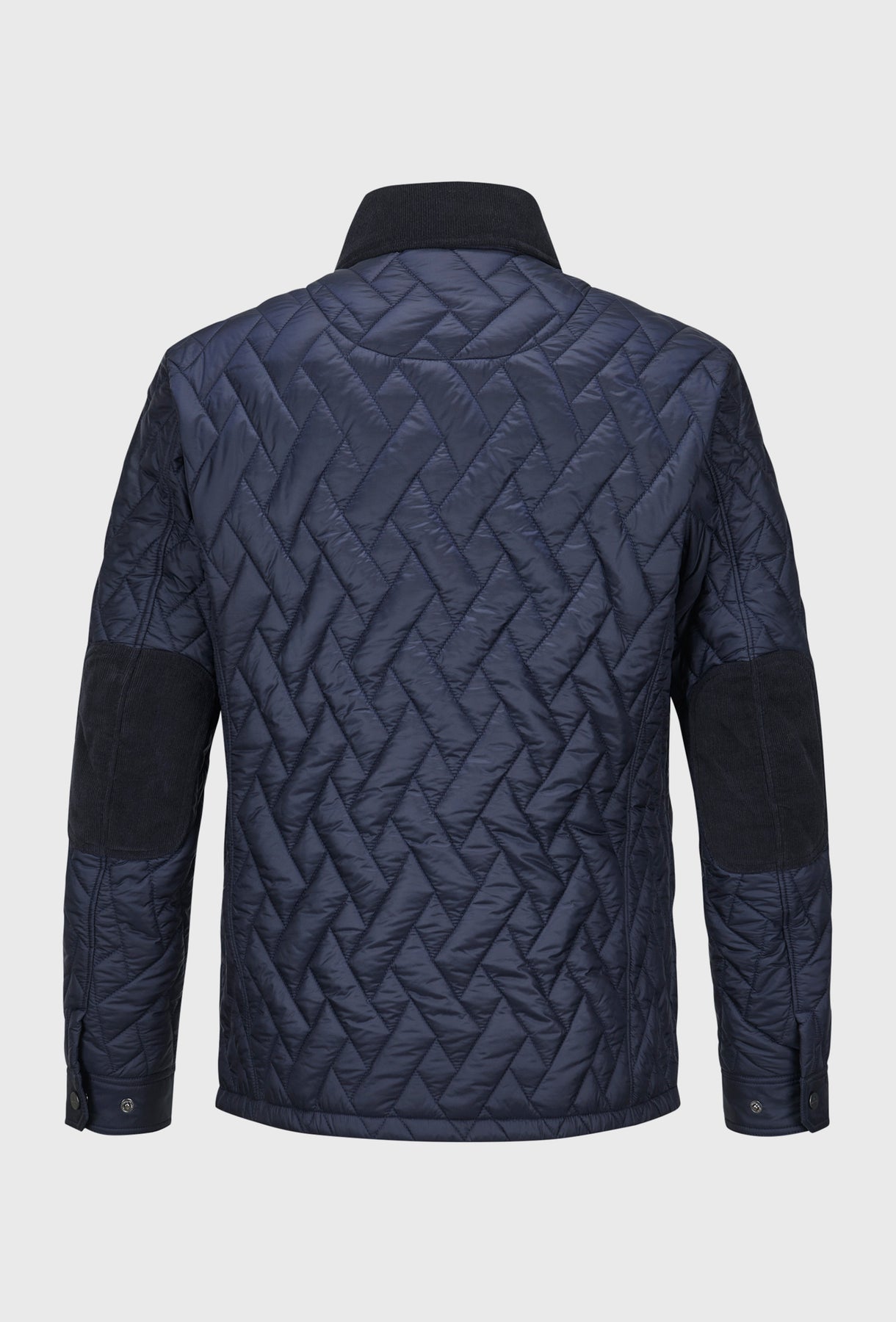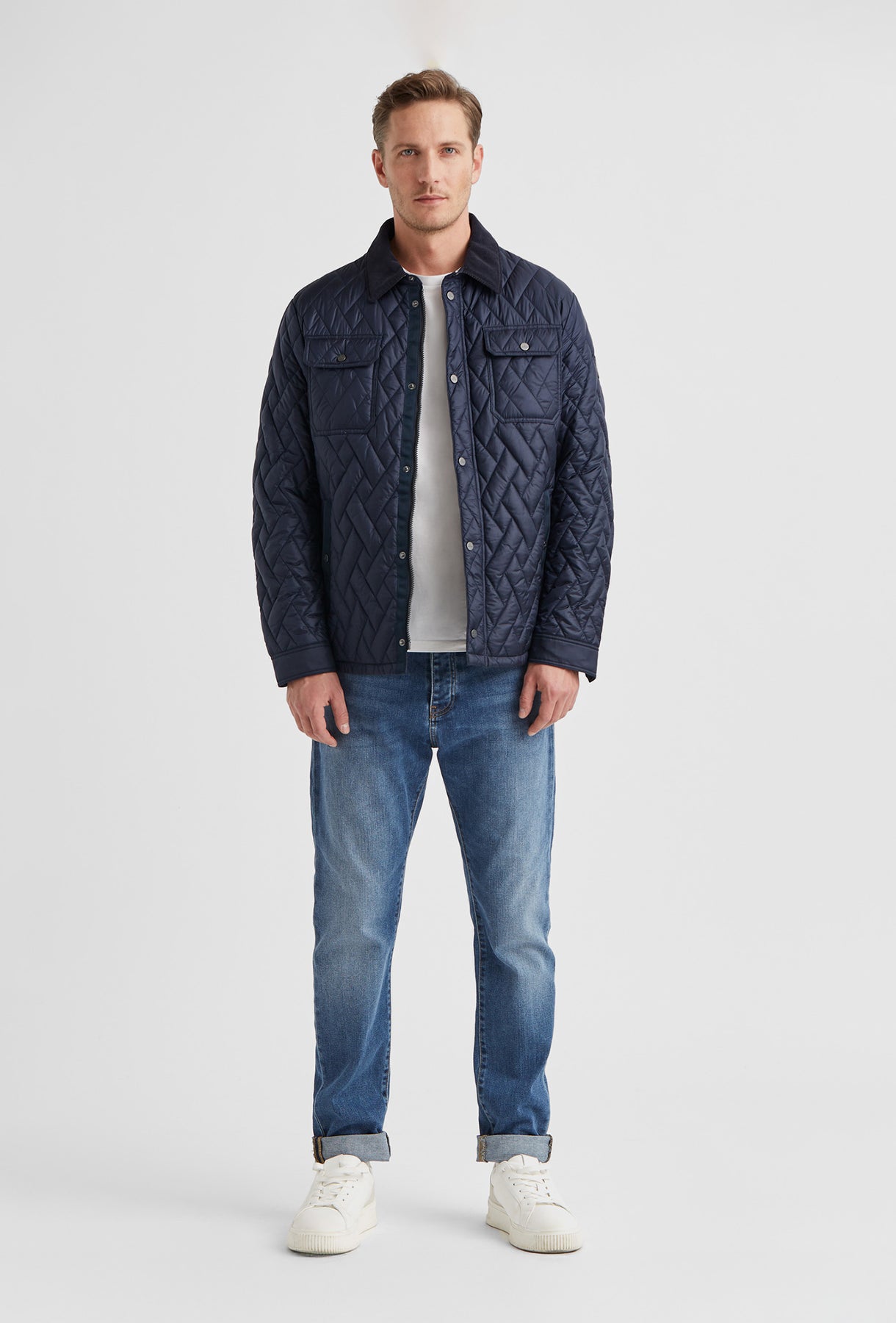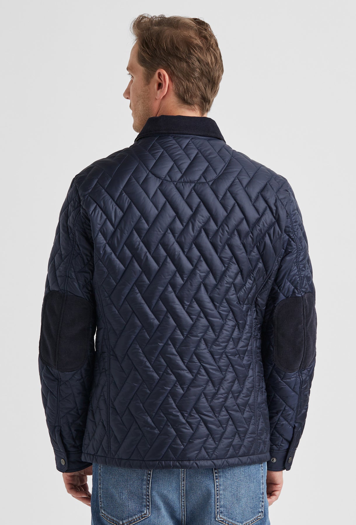 Ta elegancka kurtka przejściowa o klasycznym fasonie łączy w sobie ponadczasowy styl z nowoczesną funkcjonalnością. Głęboki granatowy kolor materiału został zestawiony z kontrastowym, sztruksowym kołnierzem oraz stylowymi łatami na łokciach, co nadaje jej szlachetnego charakteru. Model wyróżnia się precyzyjnym pikowaniem w jodełkę oraz luksusowymi detalami, takimi jak sygnowane guziki i praktyczne kieszenie z klapami. To idealna propozycja dla mężczyzn ceniących jakość premium i nienaganny wygląd na co dzień.