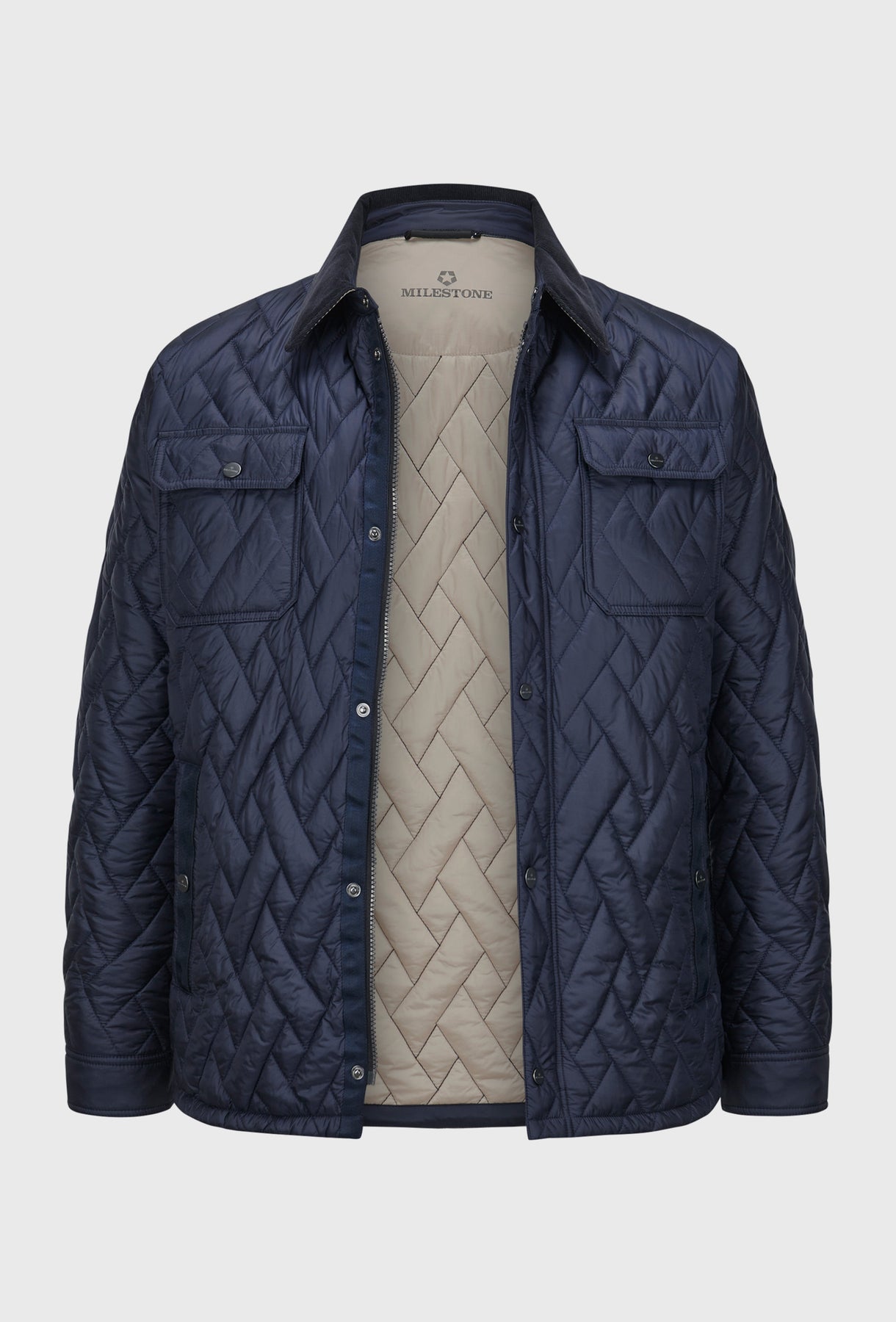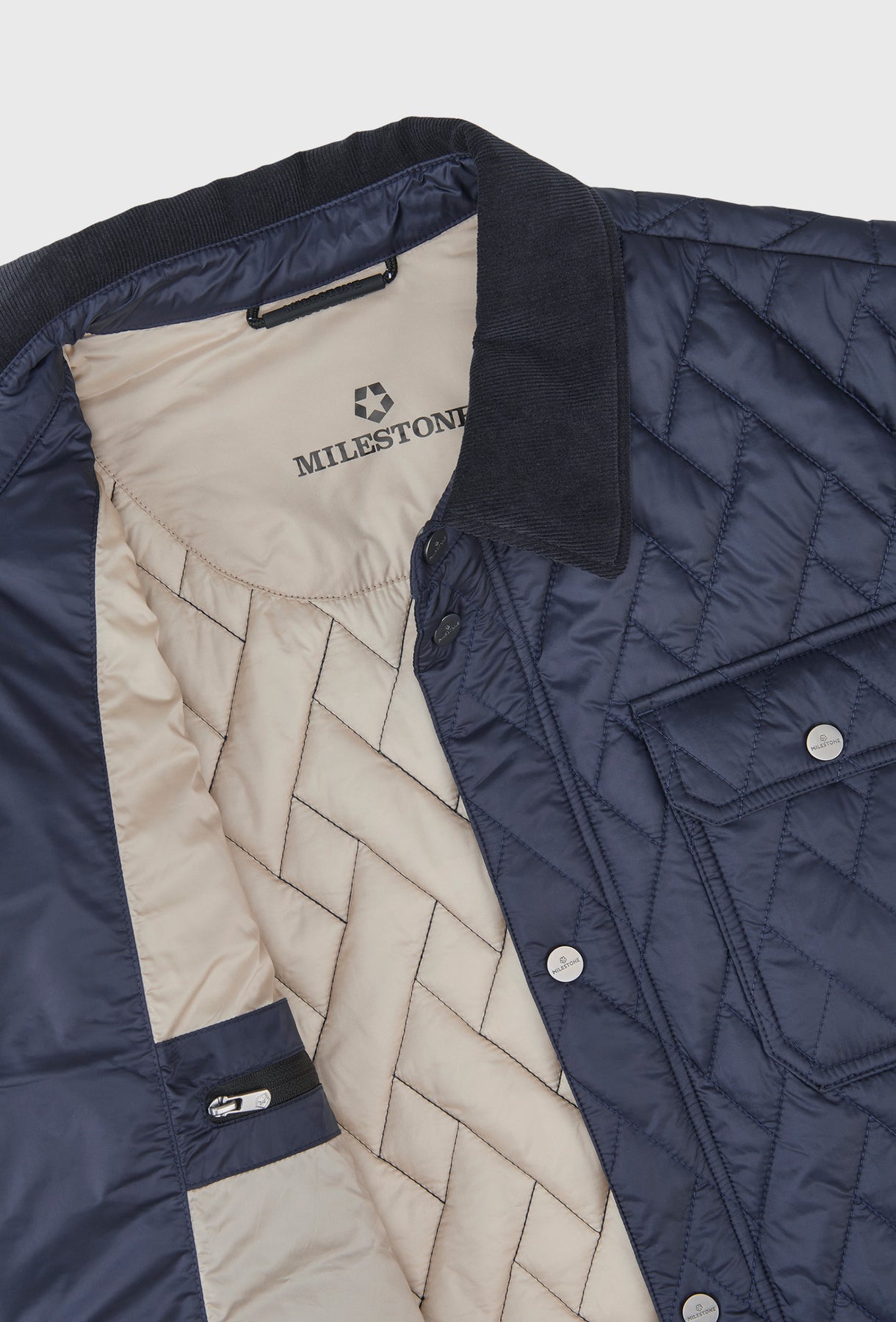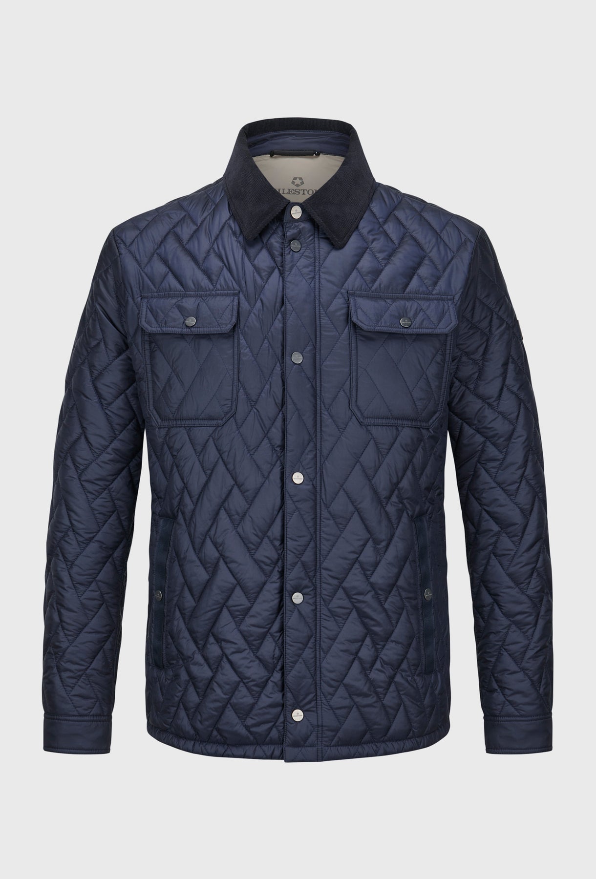 Ta elegancka kurtka przejściowa o klasycznym fasonie łączy w sobie ponadczasowy styl z nowoczesną funkcjonalnością. Głęboki granatowy kolor materiału został zestawiony z kontrastowym, sztruksowym kołnierzem oraz stylowymi łatami na łokciach, co nadaje jej szlachetnego charakteru. Model wyróżnia się precyzyjnym pikowaniem w jodełkę oraz luksusowymi detalami, takimi jak sygnowane guziki i praktyczne kieszenie z klapami. To idealna propozycja dla mężczyzn ceniących jakość premium i nienaganny wygląd na co dzień.