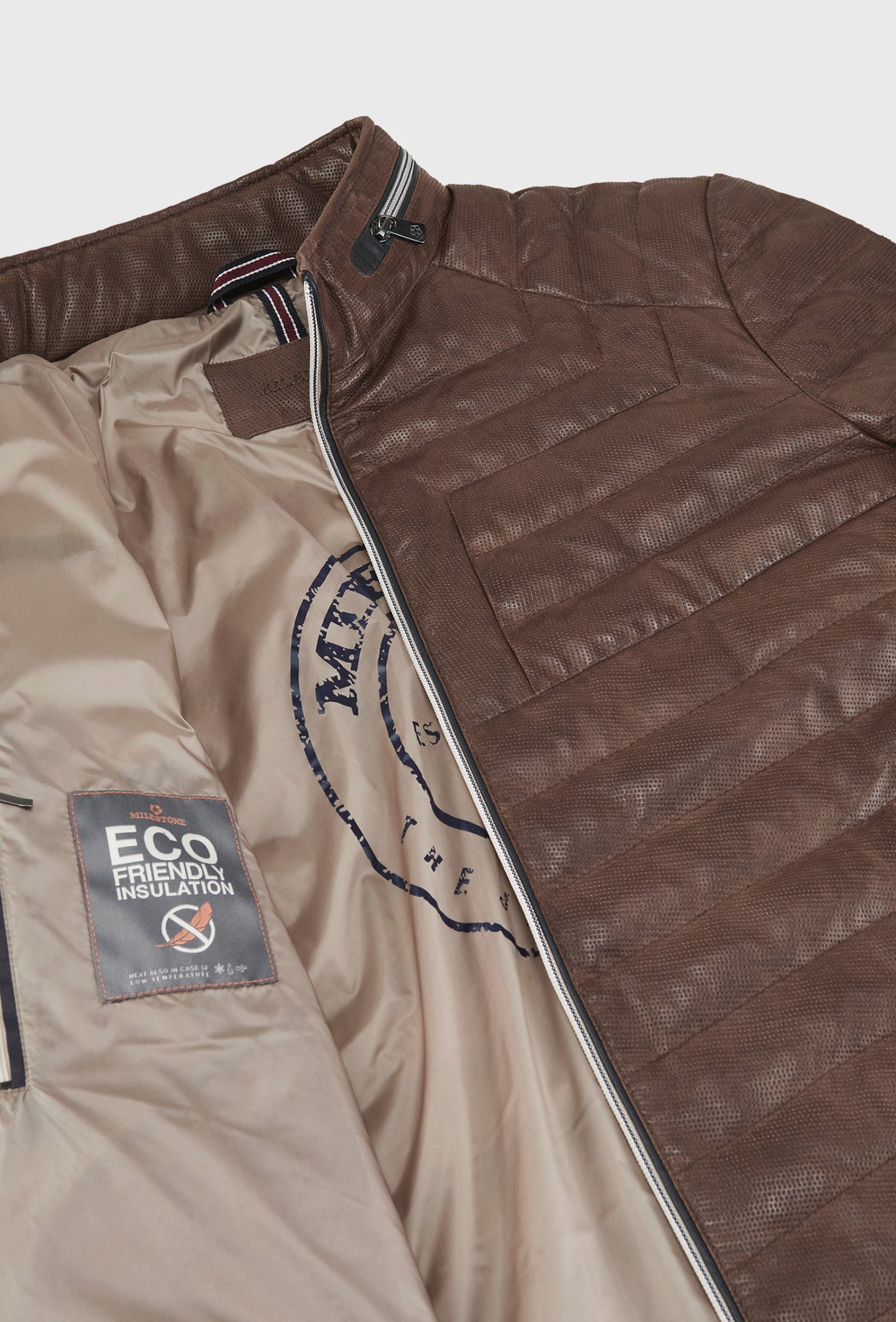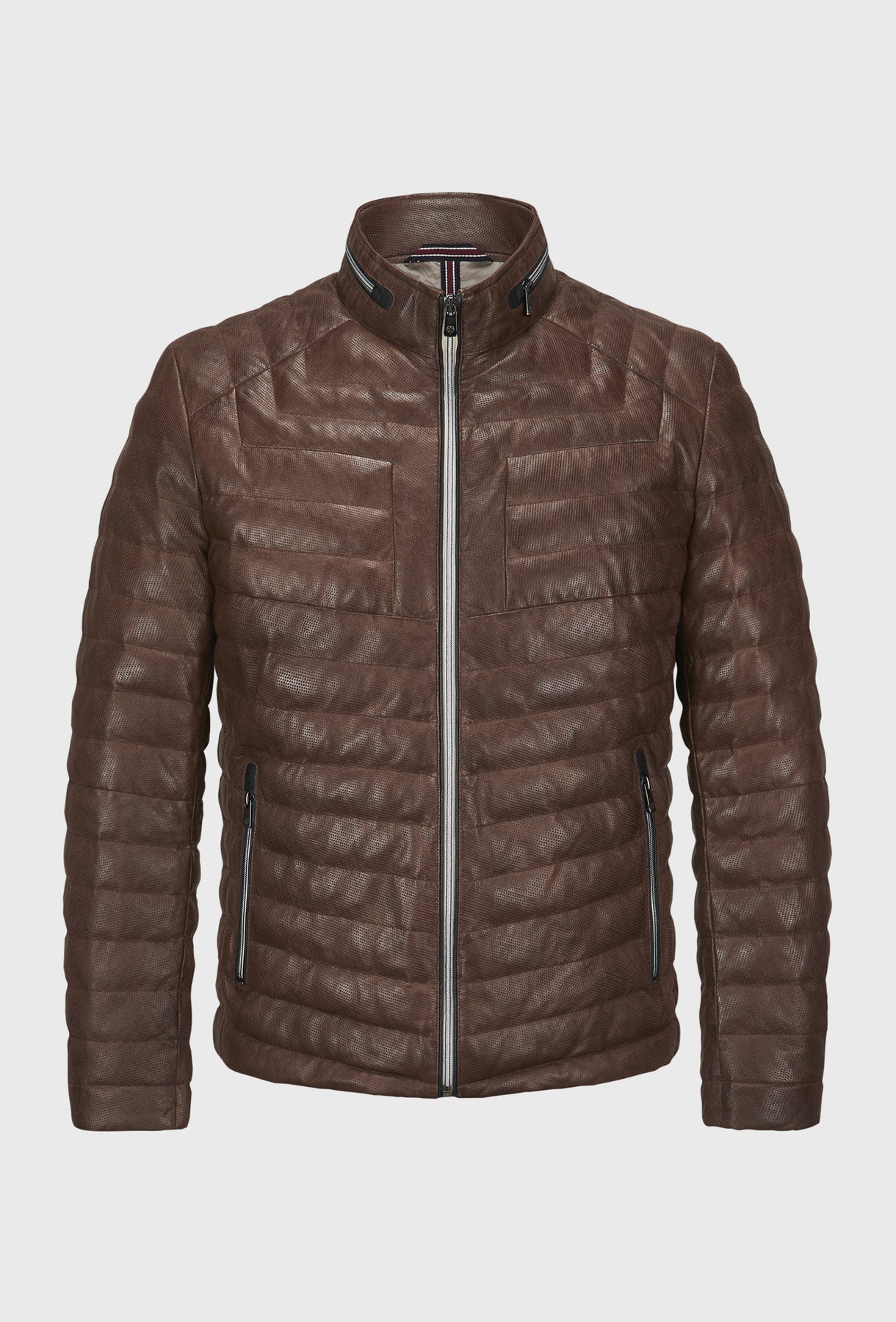 Ta wyjątkowa kurtka w głębokim brązowym kolorze wyróżnia się perforowaną strukturą materiału oraz nowoczesnym, poziomym pikowaniem. Sportowy sznyt podkreśla stójka z kontrastowymi detalami oraz funkcjonalne zamki błyskawiczne przy kieszeniach.