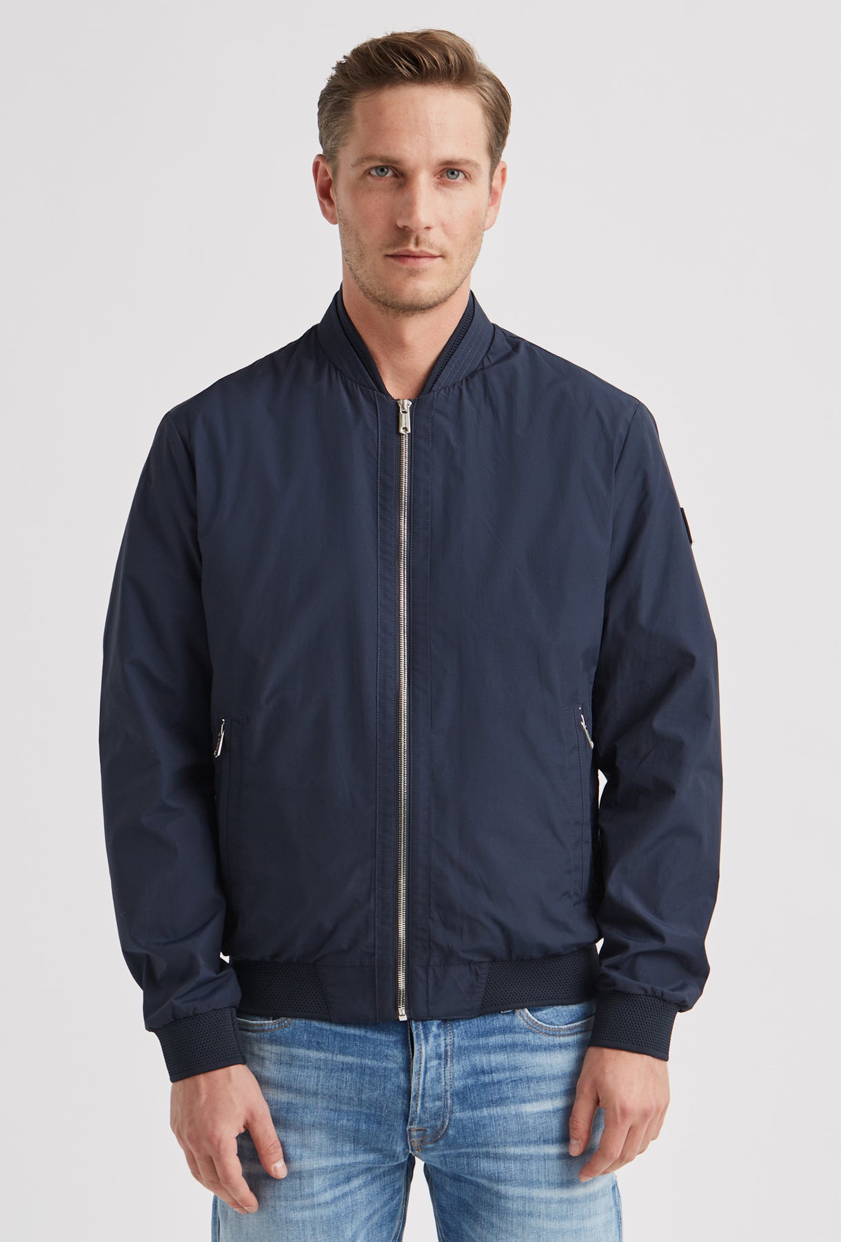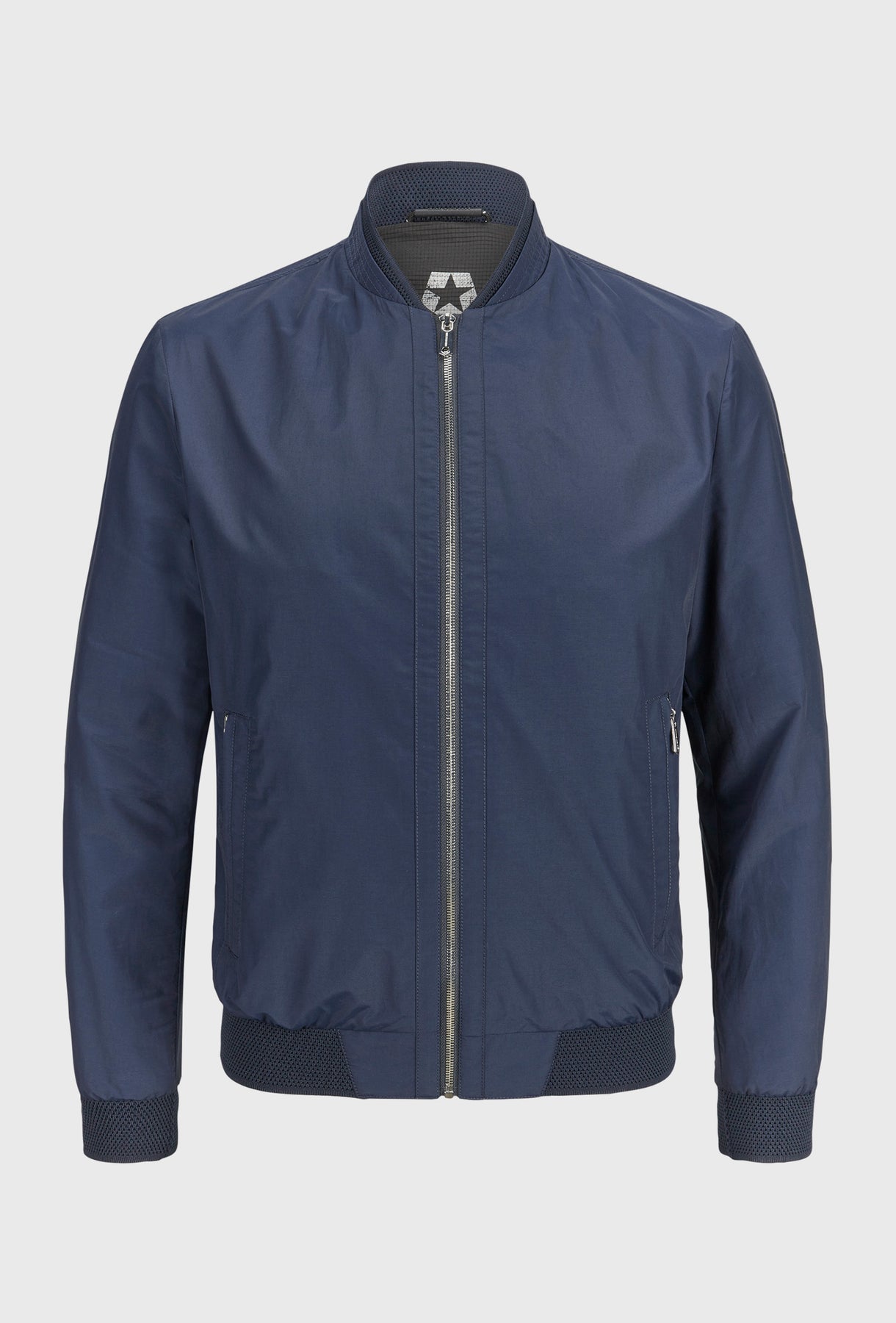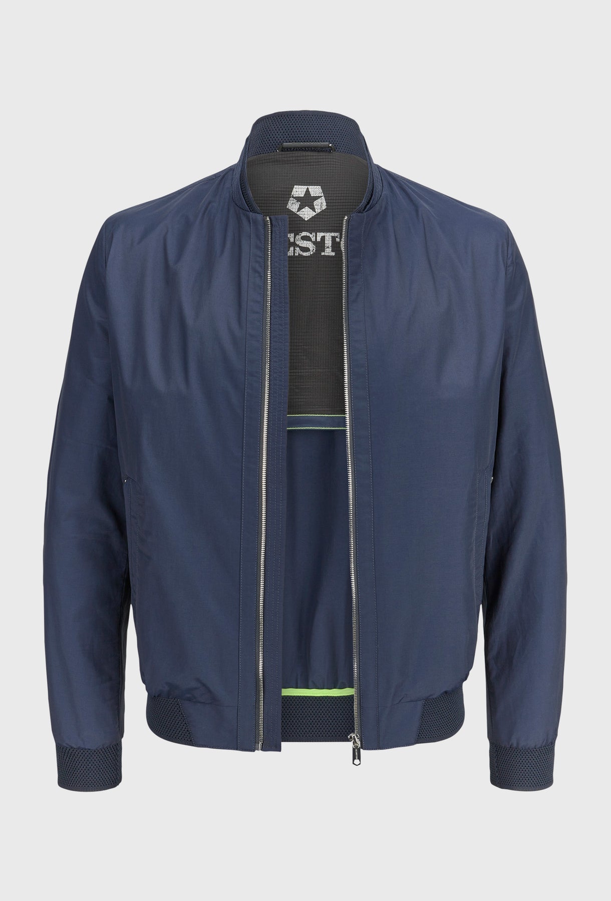 Nowoczesna kurtka typu bomber w odcieniu głębokiego granatu, uszyta z lekkiego materiału o subtelnym, szlachetnym połysku. Sportowy charakter modelu definiują prążkowane wykończenia kołnierza i mankietów oraz ukryte wewnątrz kontrastowe detale w kolorze neonowej zieleni. Minimalistyczny design dopełniają srebrne, metalowe suwaki, nadające całości luksusowego sznytu.