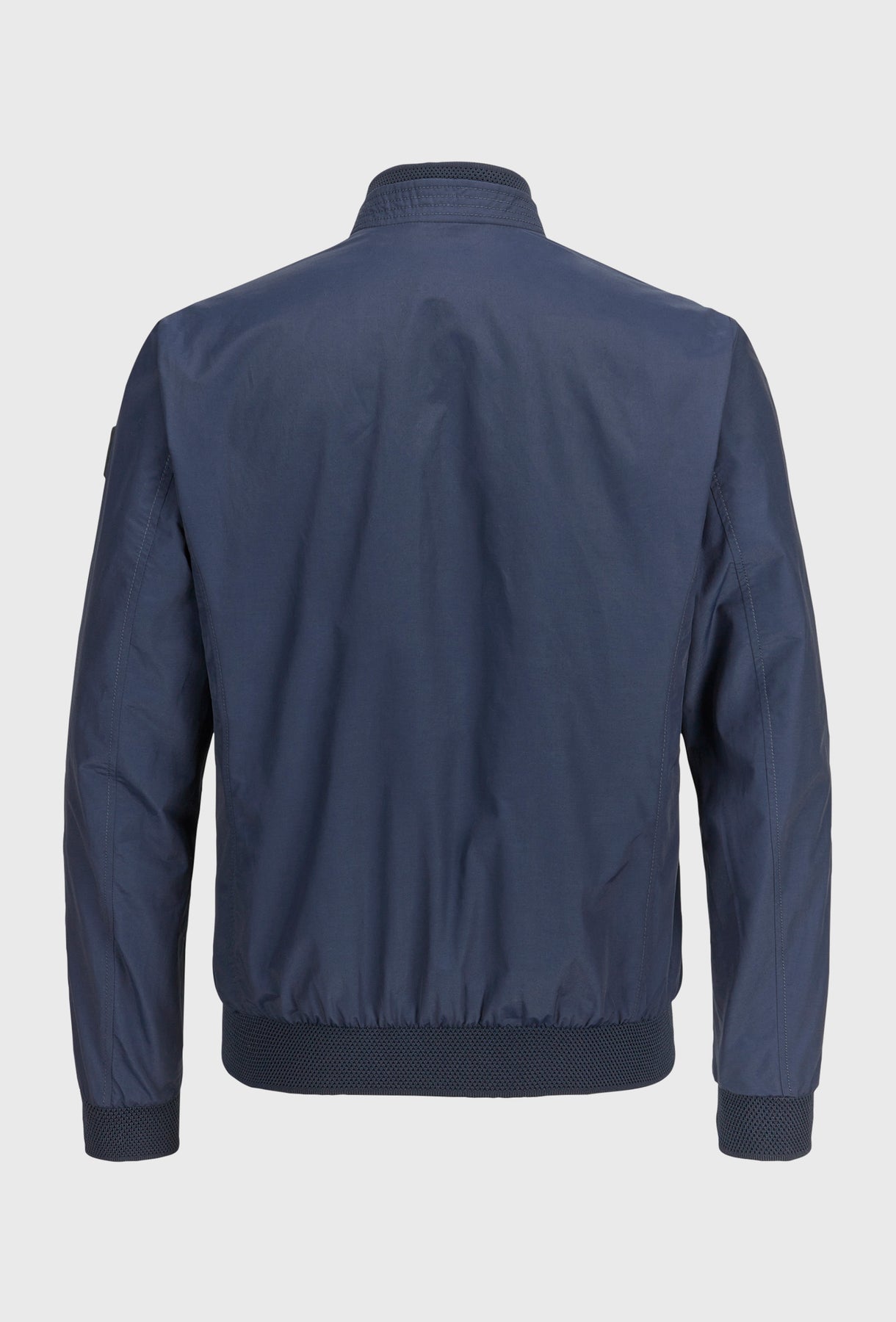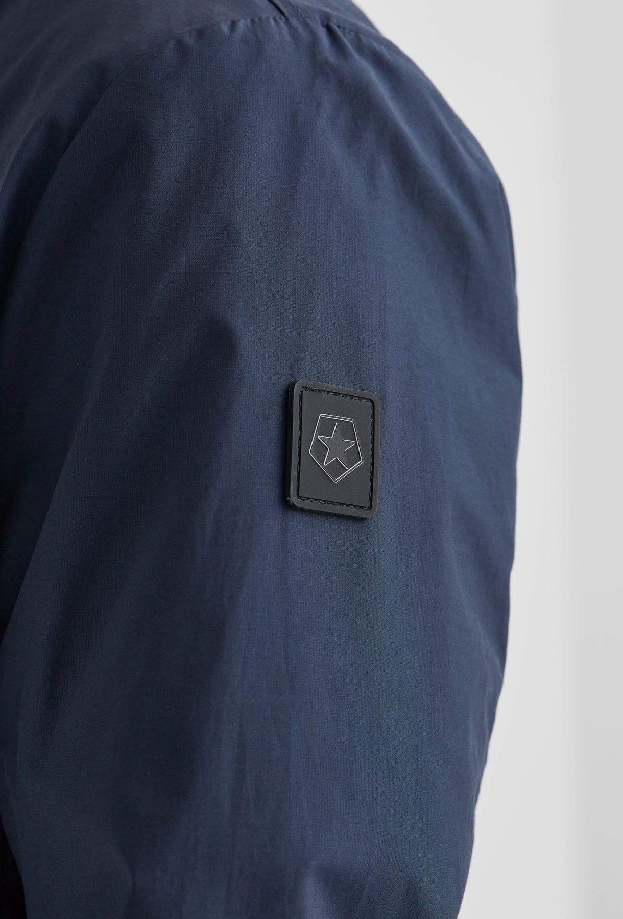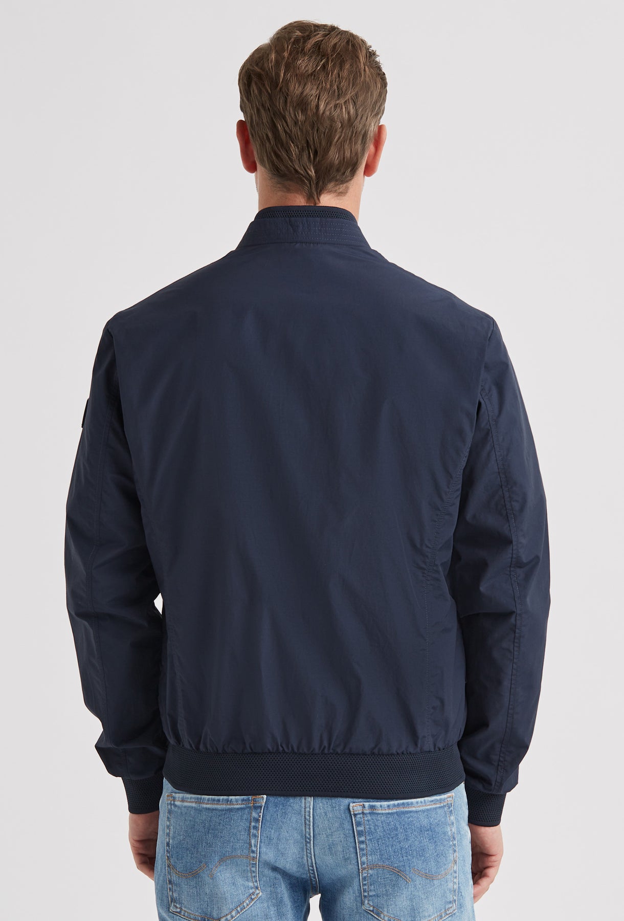 Nowoczesna kurtka typu bomber w odcieniu głębokiego granatu, uszyta z lekkiego materiału o subtelnym, szlachetnym połysku. Sportowy charakter modelu definiują prążkowane wykończenia kołnierza i mankietów oraz ukryte wewnątrz kontrastowe detale w kolorze neonowej zieleni. Minimalistyczny design dopełniają srebrne, metalowe suwaki, nadające całości luksusowego sznytu.
