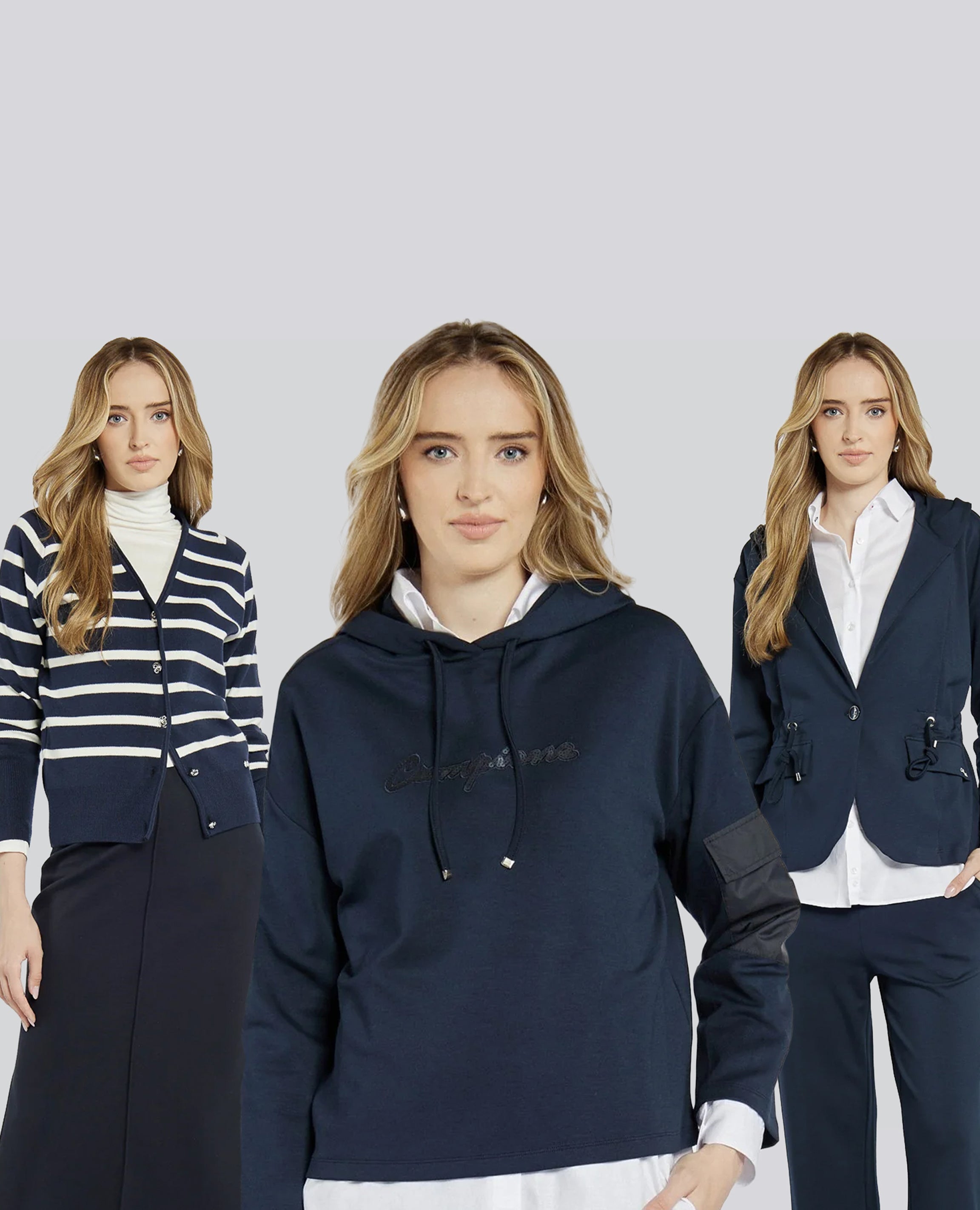 Odkryj kolekcję, w której granaty, biele i marynistyczne linie tworzą nowoczesny look dla kobiet żyjących aktywnie, ale ceniących subtelny szyk. Proste kroje, miękkie materiały i sportowe detale sprawiają, że każdy dzień zyskuje odrobinę stylowej energii.