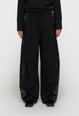 Spodnie w kolorze taupe, wykonane z miękkiej dzianiny o gładkim splocie. Model o szerokim, prostym kroju z satynowymi lampasami po bokach, które nadają całości subtelnego połysku. W pasie elastyczna guma z regulowanym troczkiem zapewnia wygodne dopasowanie. Po bokach dwie kieszenie, z tyłu jedna naszywana kieszeń. Minimalistyczne wykończenie uzupełnione haftowanym logo „10”. Komfortowe i stylowe spodnie, idealne do nowoczesnych, codziennych stylizacji.
