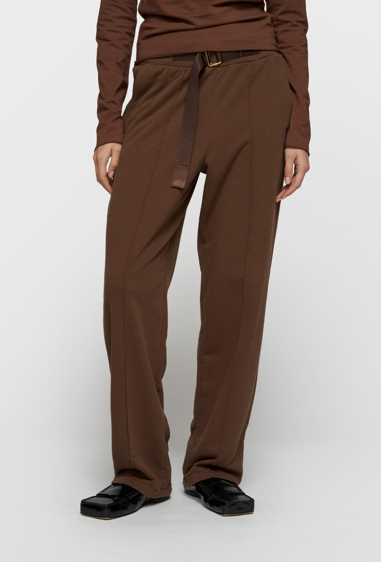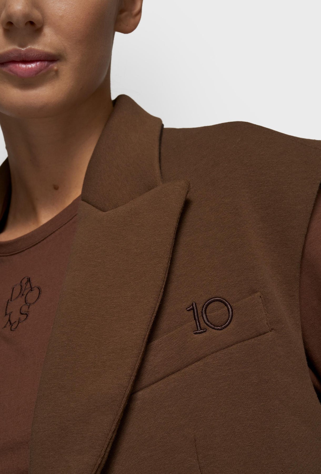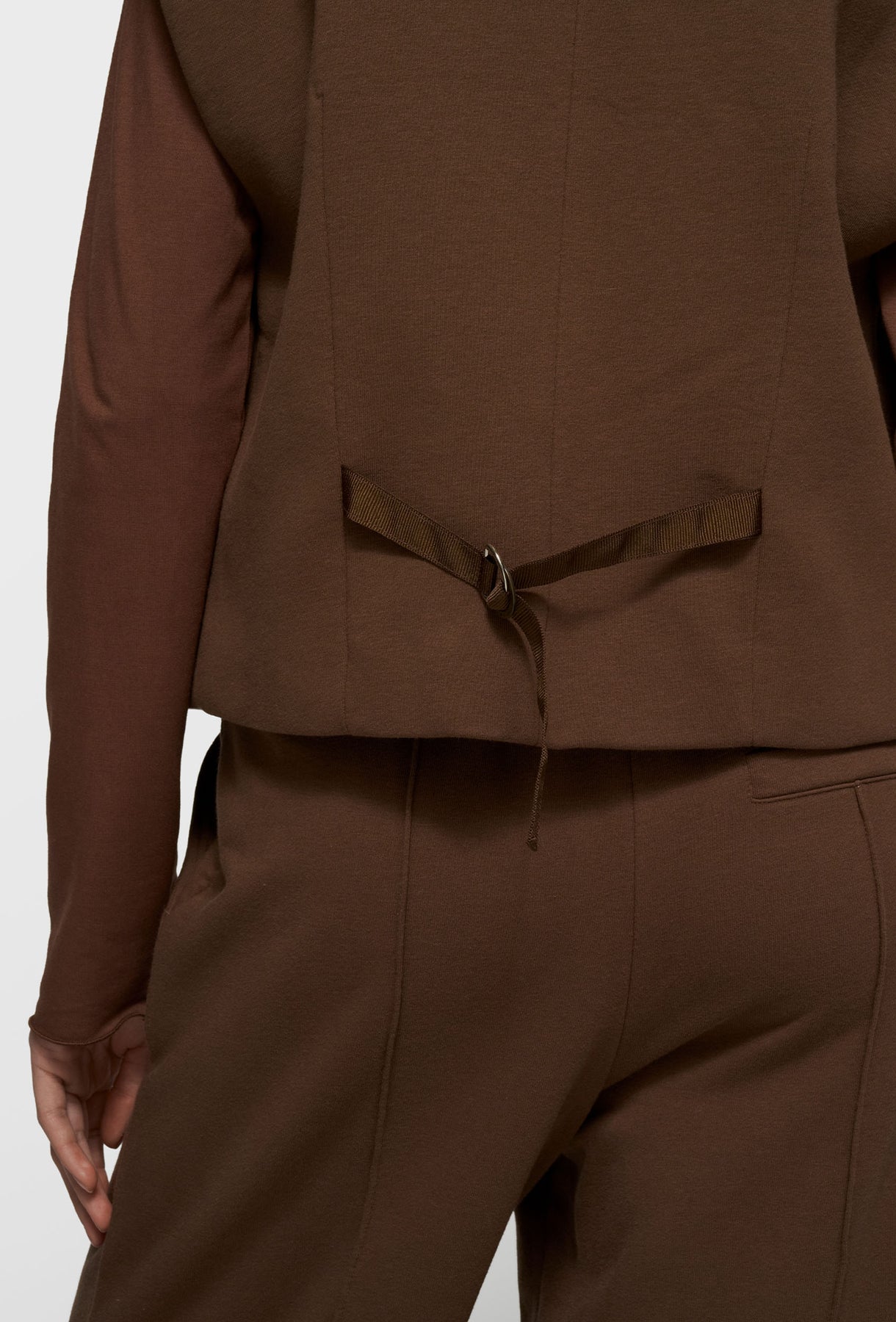 Ten wyjątkowy komplet damski w głębokim odcieniu czekoladowego brązu to kwintesencja nowoczesnej elegancji połączonej z miejskim luzem. W skład zestawu wchodzi strukturalna kamizelka o fasonie oversize z szerokimi klapami, która dzięki przedłużonej linii ramion nadaje sylwetce wyrazisty, modowy charakter. Tył kamizelki został wzbogacony o klasyczny pasek z regulacją, pozwalający na subtelne podkreślenie talii. Dopełnieniem góry są spodnie o prostym, swobodnym kroju z wyraźnie zaznaczonym przeszyciem imitującym kancik, co optycznie wydłuża nogi i nadaje całości garniturowego szyku. Komplet został wykonany z wysokiej jakości bawełny, która doskonale trzyma formę, a jednocześnie zapewnia komfort noszenia przez cały dzień. To idealna propozycja do stylizacji typu total look – zestawiony z dopasowanym longsleevem i mokasynami stworzy profesjonalny, a zarazem nieoczywisty outfit do pracy, na spotkanie biznesowe czy eleganckie wyjście. Dzięki uniwersalnej kolorystyce i ponadczasowemu krojowi, elementy zestawu można z łatwością łączyć z innymi częściami garderoby, tworząc nieskończoną liczbę modnych kombinacji w duchu quiet luxury.