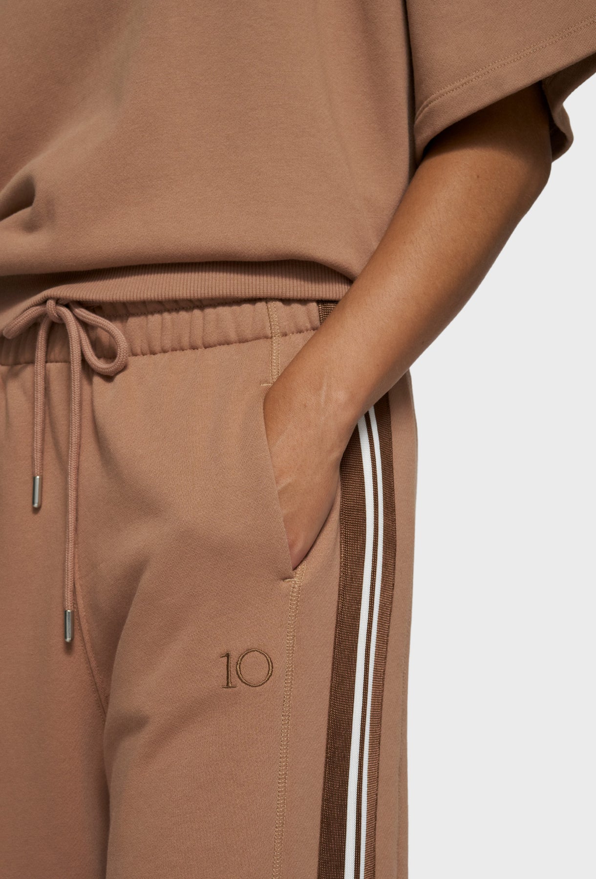 Ten dwuczęściowy komplet marki 10DAYS w pięknym, karmelowym odcieniu to idealny balans między sportowym luzem a modowym szykiem. W skład zestawu wchodzi bluza z krótkim rękawem o swobodnym kroju oraz spodnie z szerokimi nogawkami, które wyróżniają się kontrastowymi pasami po bokach, nadającymi całości miejskiego charakteru. Bluza ma subtelne logo na piersi, a spodnie posiadają wygodną gumkę w pasie z troczkami oraz dyskretny haft 10DAYS przy kieszeni. Dzięki wysokiej jakości wykonania i ponadczasowej kolorystyce, ten dresowy zestaw zostanie w Twojej szafie na długo, gwarantując wygodę bez rezygnacji z dobrego wyglądu.