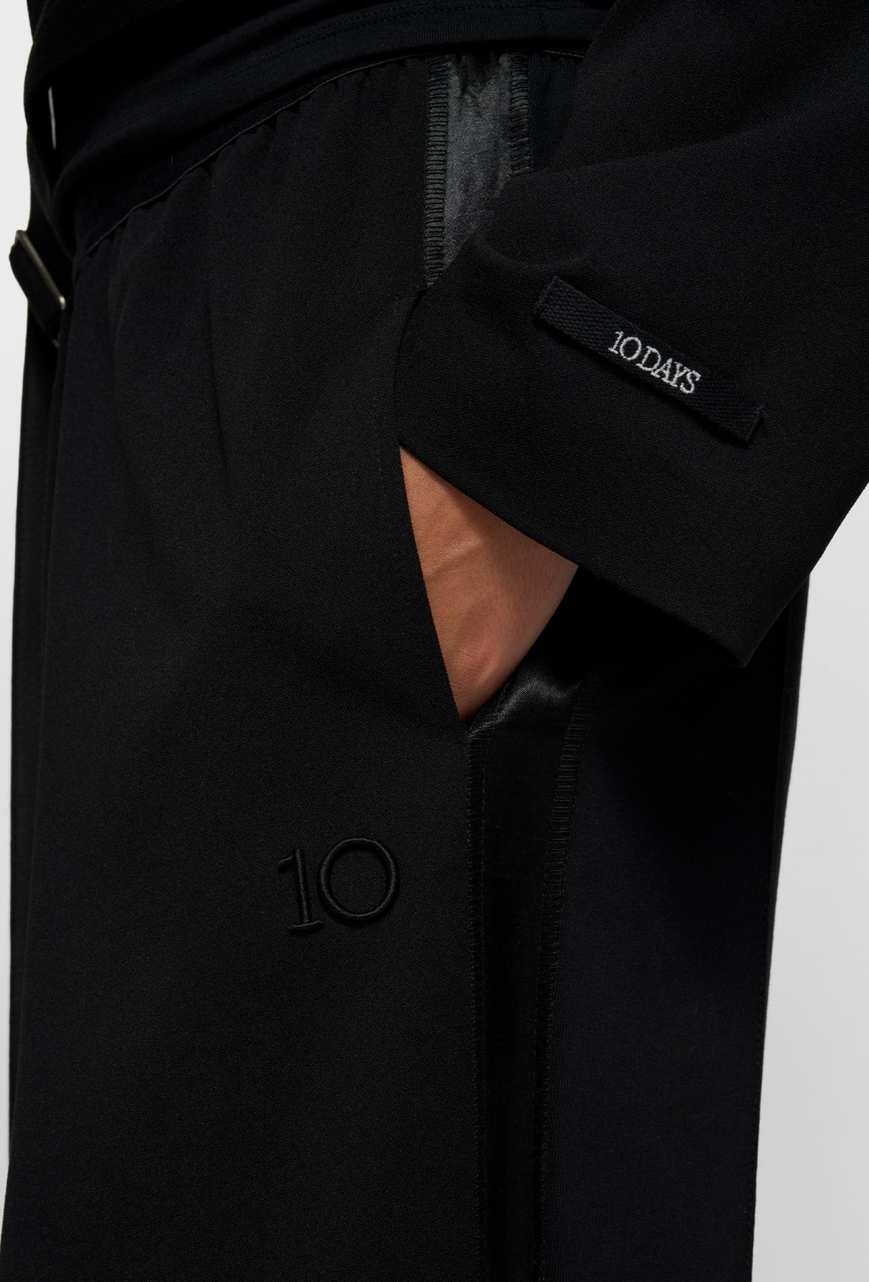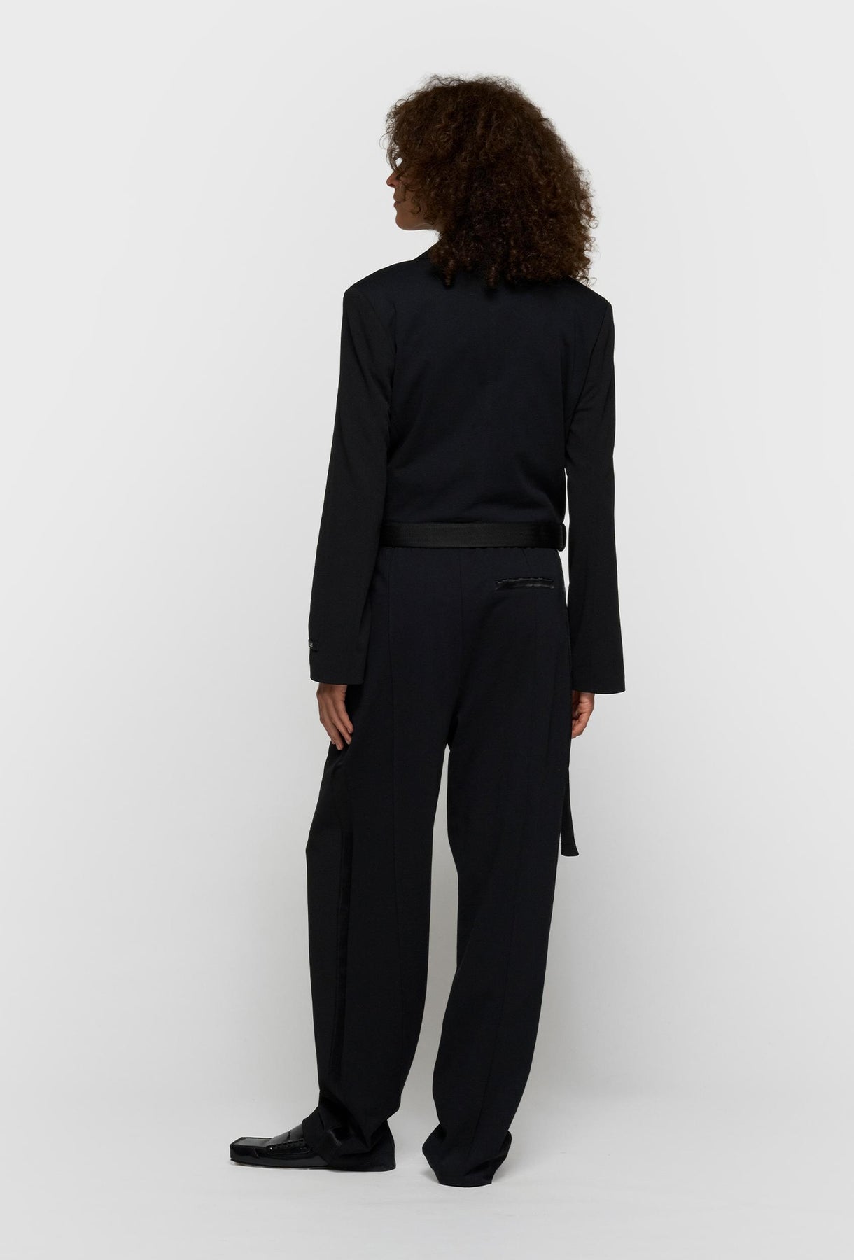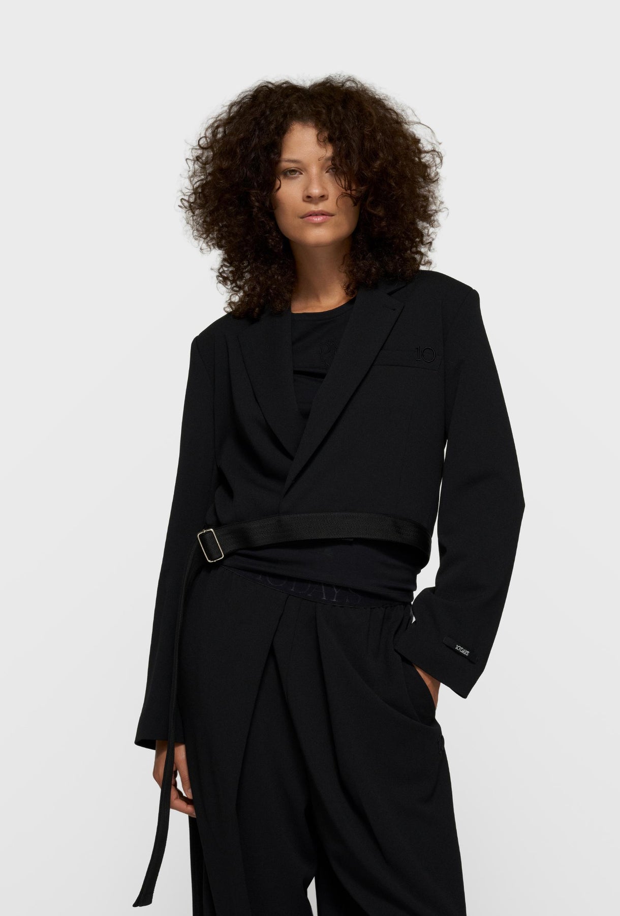 Wprowadź do swojej garderoby powiew nowoczesnej klasyki dzięki temu wyjątkowemu, czarnemu kompletowi, który redefiniuje pojęcie damskiego garnituru. Zestaw składa się z niezwykle stylowej, krótkiej marynarki o pudełkowym kroju oraz szerokich spodni, tworząc spójną i niezwykle prestiżową całość. Marynarka przyciąga wzrok swoim nieszablonowym wykończeniem – posiada eleganckie klapy oraz unikalny system zapięcia w postaci szerokiego paska z metalową klamrą, który pozwala na efektowne podkreślenie talii i nadaje stylizacji geometrycznego wyrazu. Subtelne detale, takie jak haftowane logo "10" na piersi oraz naszywka na mankiecie, podkreślają wysoką jakość i markowy charakter produktu. Dolna część zestawu to spodnie z szeroką nogawką, które zapewniają niebywałą swobodę ruchów i optycznie wydłużają sylwetkę. Spodnie posiadają elastyczny pas z dyskretnym napisem, co gwarantuje komfort noszenia przy zachowaniu eleganckiego wyglądu. Całość została wykonana z gładkiej, głęboko czarnej tkaniny klasy premium, która doskonale trzyma formę i jest odporna na zagniecenia. To idealny wybór na wieczorne wyjścia, biznesowe spotkania czy formalne okazje, gdzie chcesz zaprezentować się z klasą, ale w nowoczesnym, odważnym wydaniu.