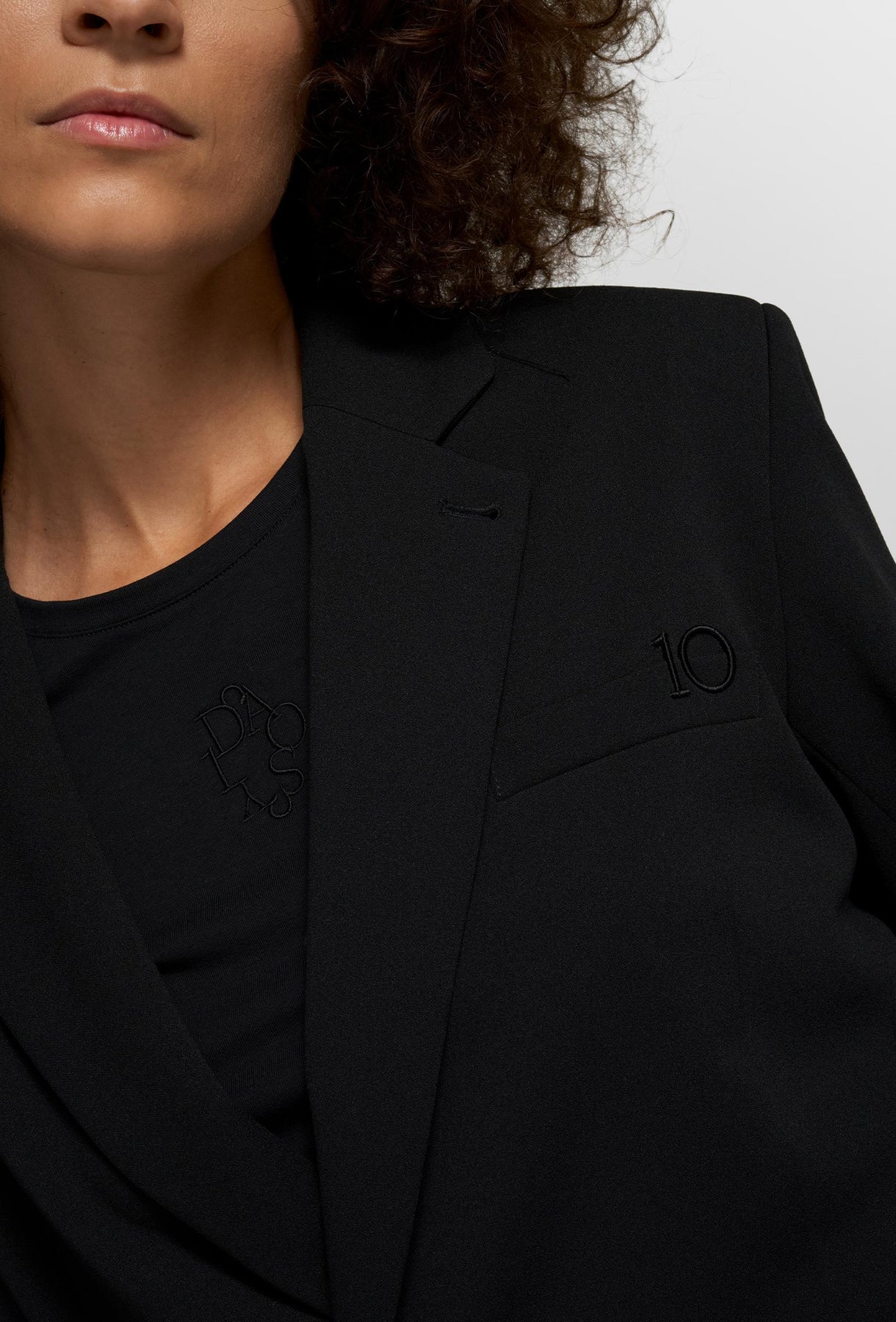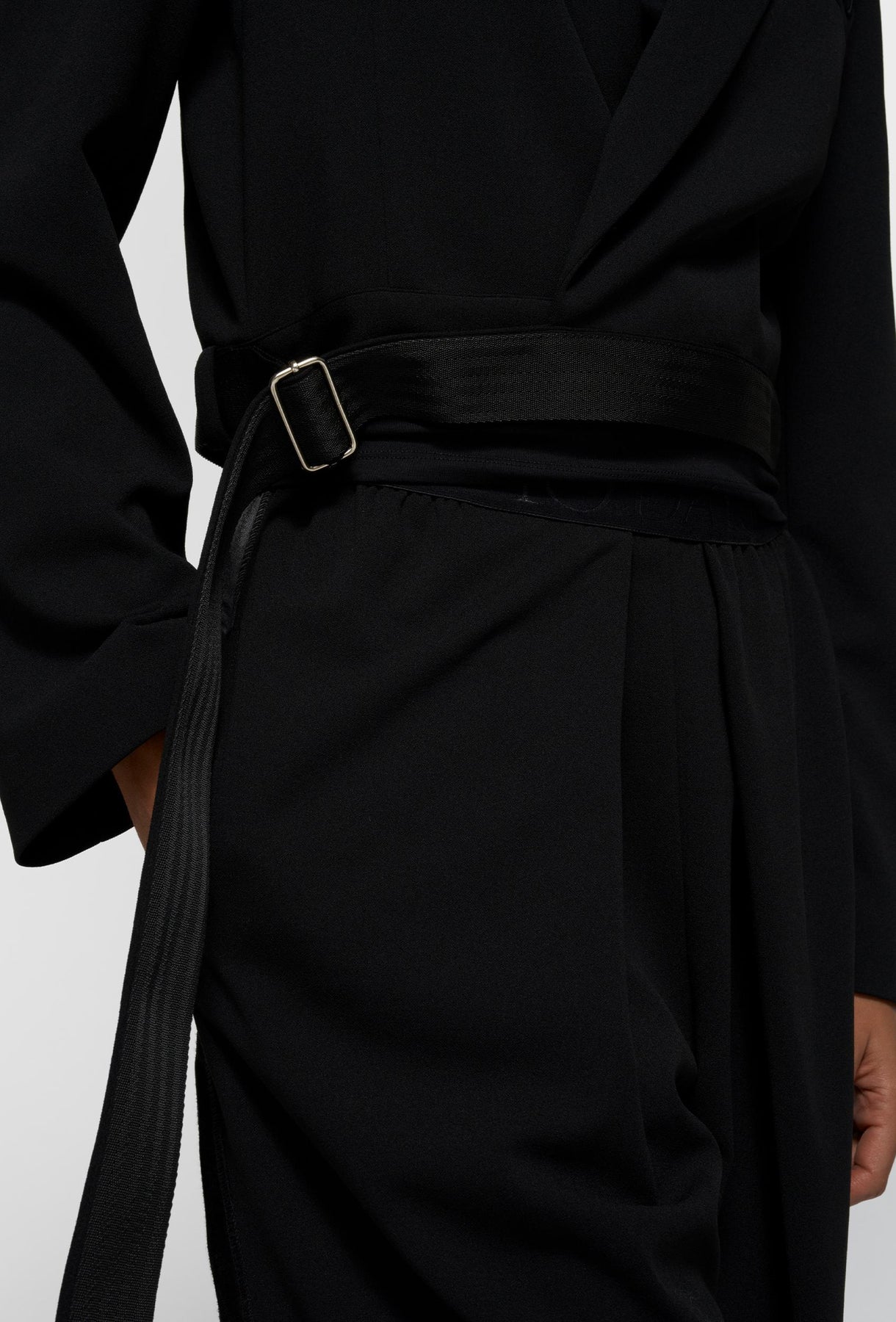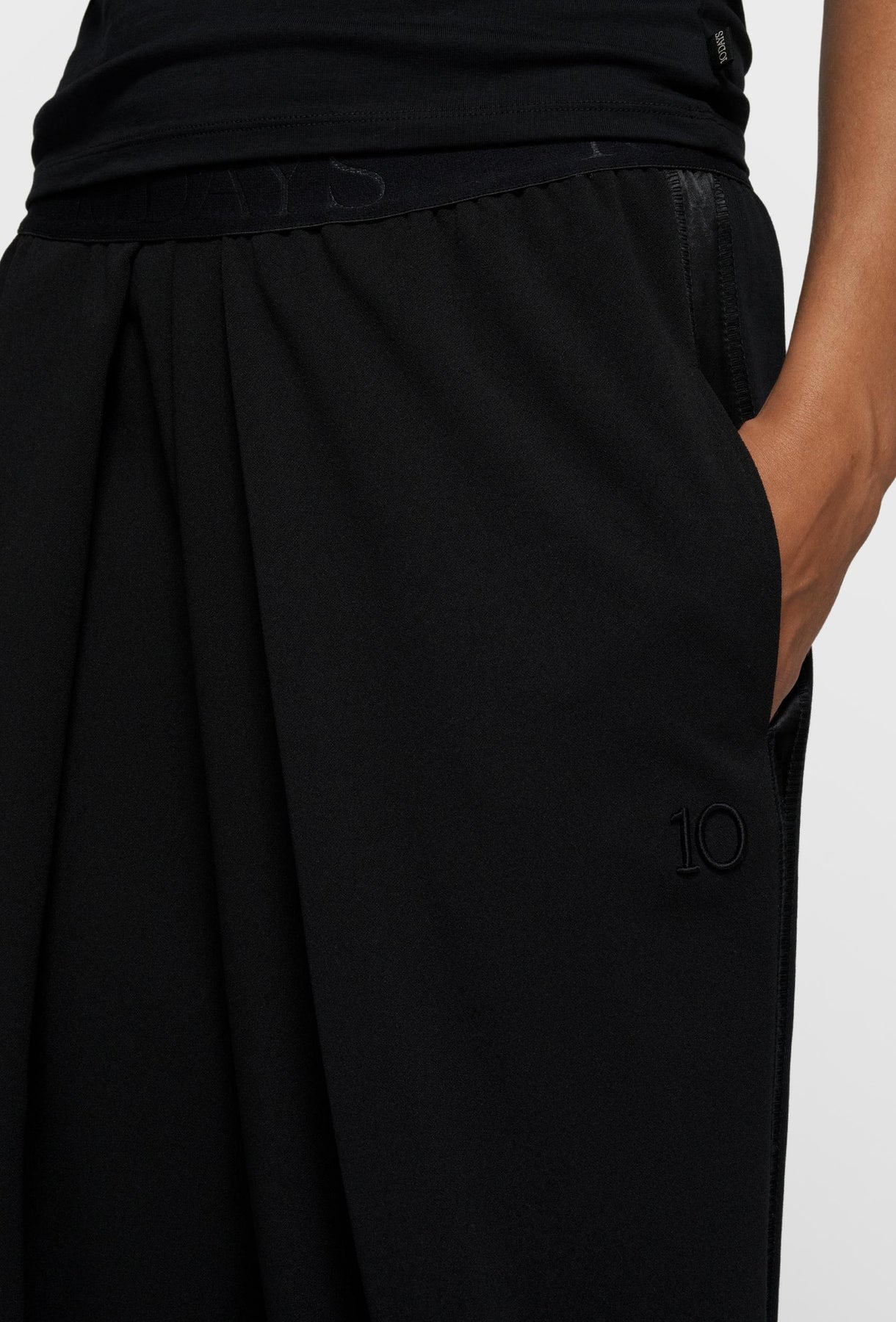 Wprowadź do swojej garderoby powiew nowoczesnej klasyki dzięki temu wyjątkowemu, czarnemu kompletowi, który redefiniuje pojęcie damskiego garnituru. Zestaw składa się z niezwykle stylowej, krótkiej marynarki o pudełkowym kroju oraz szerokich spodni, tworząc spójną i niezwykle prestiżową całość. Marynarka przyciąga wzrok swoim nieszablonowym wykończeniem – posiada eleganckie klapy oraz unikalny system zapięcia w postaci szerokiego paska z metalową klamrą, który pozwala na efektowne podkreślenie talii i nadaje stylizacji geometrycznego wyrazu. Subtelne detale, takie jak haftowane logo "10" na piersi oraz naszywka na mankiecie, podkreślają wysoką jakość i markowy charakter produktu. Dolna część zestawu to spodnie z szeroką nogawką, które zapewniają niebywałą swobodę ruchów i optycznie wydłużają sylwetkę. Spodnie posiadają elastyczny pas z dyskretnym napisem, co gwarantuje komfort noszenia przy zachowaniu eleganckiego wyglądu. Całość została wykonana z gładkiej, głęboko czarnej tkaniny klasy premium, która doskonale trzyma formę i jest odporna na zagniecenia. To idealny wybór na wieczorne wyjścia, biznesowe spotkania czy formalne okazje, gdzie chcesz zaprezentować się z klasą, ale w nowoczesnym, odważnym wydaniu.