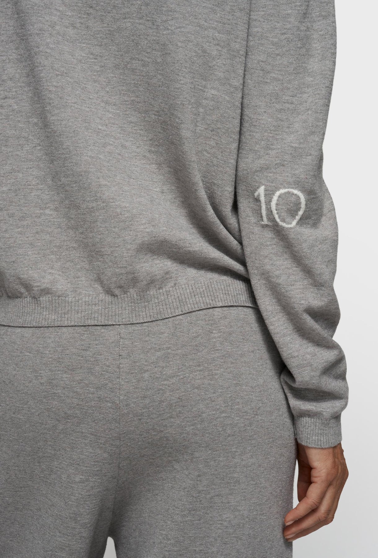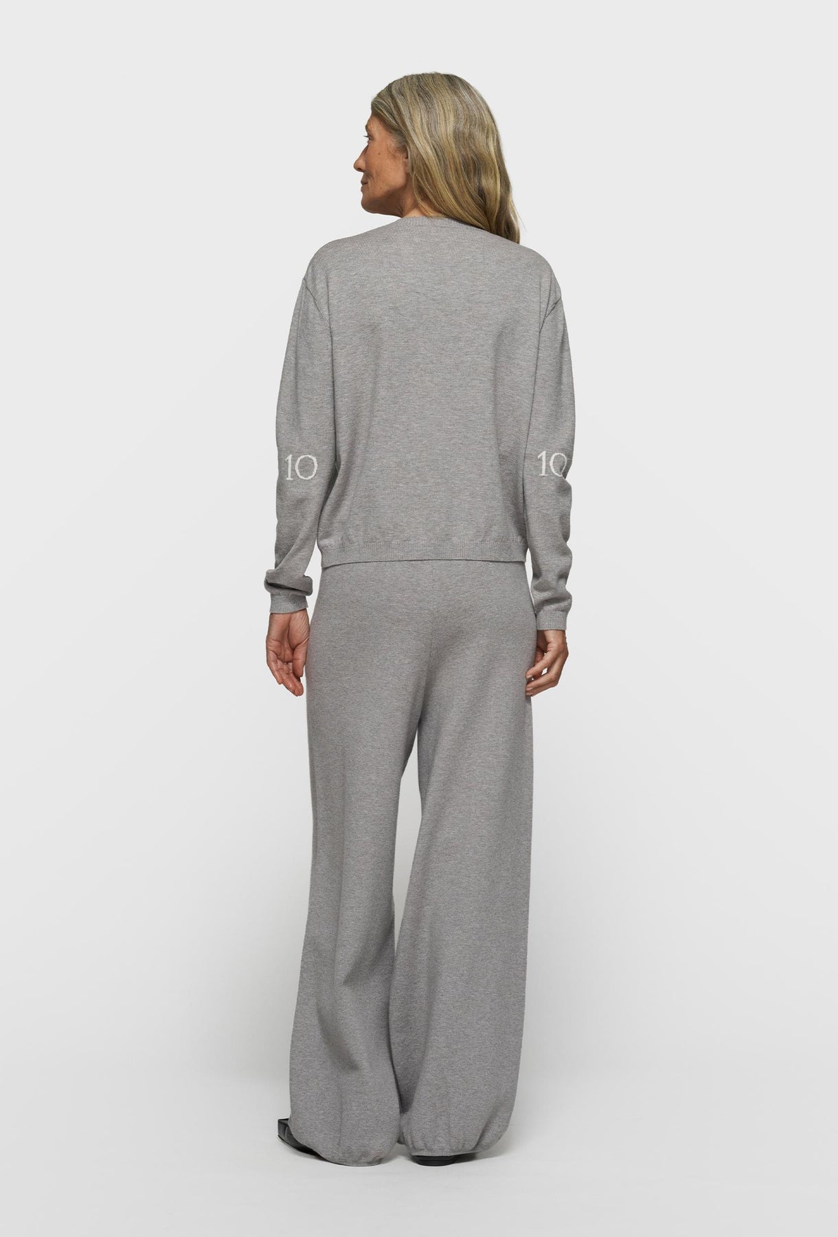 Ten wyjątkowy szary komplet damski to kwintesencja domowego ciepła połączona z minimalistycznym designem, który doskonale sprawdzi się również w miejskich stylizacjach. Zestaw został wykonany z miękkiej, wysokogatunkowej dzianiny o drobnym splocie, która przyjemnie otula ciało i zapewnia termiczny komfort przez cały dzień. Górę zestawu stanowi klasyczny sweter o luźnym kroju z okrągłym dekoltem, którego centralnym punktem jest duża, biała cyfra „10” wykonana techniką intarsji, nadająca całości nowoczesnego, sportowego sznytu. Charakterystycznym detalem są mniejsze emblematy umieszczone na rękawach swetra, co podkreśla dbałość marki o unikalne wykończenie. Dolną część kompletu tworzą spodnie o bardzo modnym fasonie wide leg z szeroką nogawką, która miękko układa się podczas ruchu, zapewniając sylwetce lekkość. Spodnie posiadają przeszycia wzdłuż nogawek, imitujące kant, co optycznie wysmukla nogi, oraz praktyczne kieszenie boczne zdobione subtelną naszywką z logo. Elastyczny pas gwarantuje idealne dopasowanie bez ucisku, czyniąc ten komplet idealnym wyborem dla kobiet ceniących estetykę soft luxury i najwyższą wygodę w codziennym wydaniu.