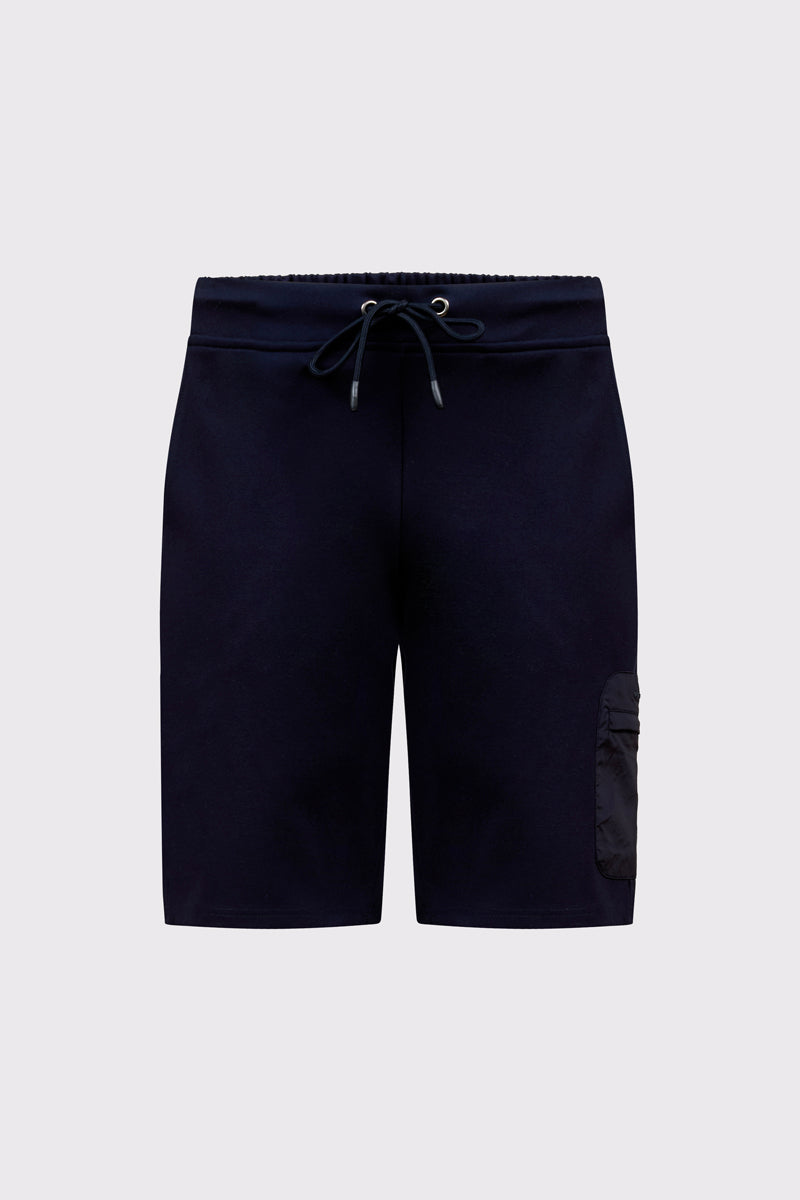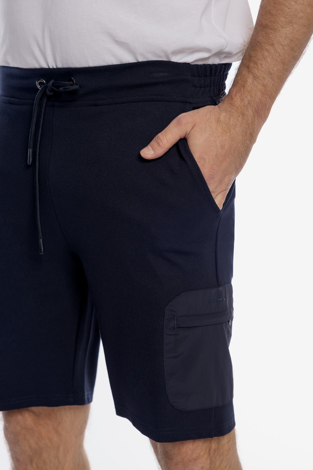 Komfortowe męskie szorty marki Campione w głębokim granatowym kolorze, łączące sportową swobodę z nowoczesnym designem. Wykonane z wysokiej jakości, miękkiej dzianiny, gwarantują doskonałą oddychalność i wygodę podczas codziennego użytkowania. Spodenki posiadają elastyczny pas z regulacją na sznurek, dwie klasyczne kieszenie boczne oraz dodatkową, zapinaną na zamek kieszeń typu cargo, która nadaje im praktycznego charakteru. Prosty krój i staranne wykończenie sprawiają, że model ten idealnie pasuje do t-shirtów i sneakersów, tworząc stylowy, wakacyjny zestaw.