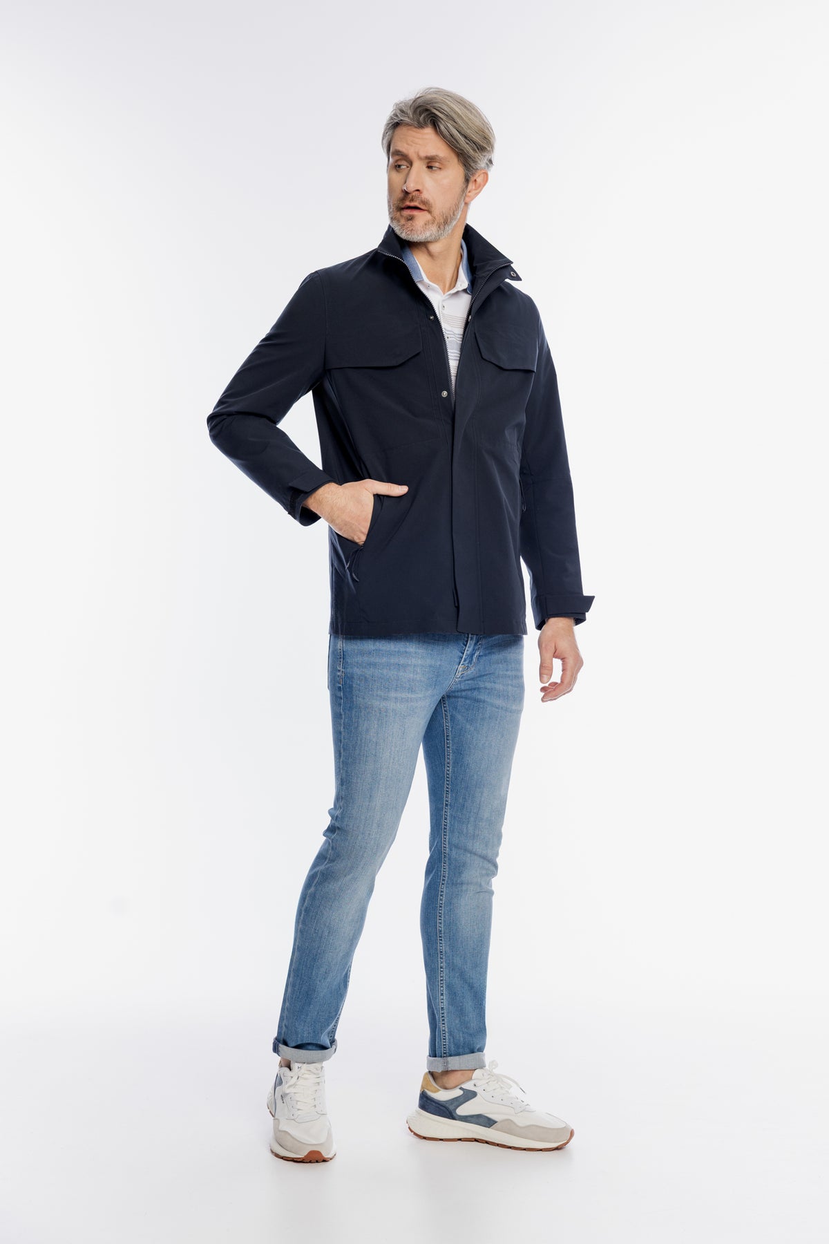 Nowoczesna męska kurtka Campione w kolorze granatowym, zaprojektowana z myślą o komforcie i funkcjonalności. Model wykonany z technicznego materiału typu B-Tech charakteryzuje się wysoką odpornością i minimalistycznym designem. Kurtka posiada praktyczną wysoką stójkę, zapięcie na zamek osłonięty listwą oraz regulowane mankiety na rzepy, co zapewnia świetną ochronę przed niekorzystnymi warunkami pogodowymi. Dwie duże kieszenie na piersi oraz subtelna naszywka z logo na rękawie podkreślają jej nowoczesny, miejski charakter. Idealna dla mężczyzn ceniących sportową elegancję w codziennych stylizacjach.