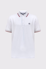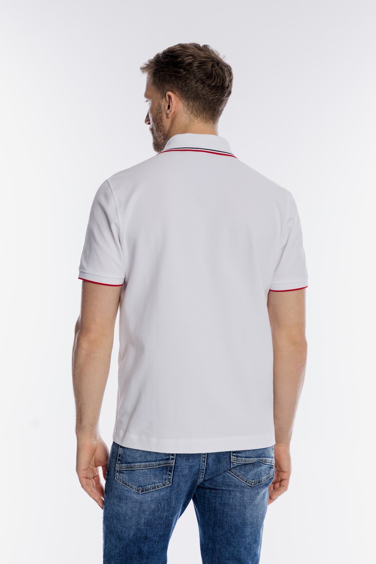 Klasyczna męska koszulka polo marki Campione w kolorze białym, wyróżniająca się sportowym charakterem i dbałością o detale. Wykonana z wysokiej jakości bawełnianej piki, zapewnia doskonałą przewiewność i komfort noszenia przez cały dzień. Model posiada kołnierzyk z kontrastowymi, czerwono-granatowymi paskami oraz rękawy wykończone estetycznym czerwonym obszyciem. Wewnętrzna listwa guzikowa została ozdobiona modnym motywem kratki, co nadaje całości unikatowego wyrazu. Na piersi znajduje się precyzyjny haft z logo marki. To idealny wybór do letnich stylizacji z jeansami lub szortami.