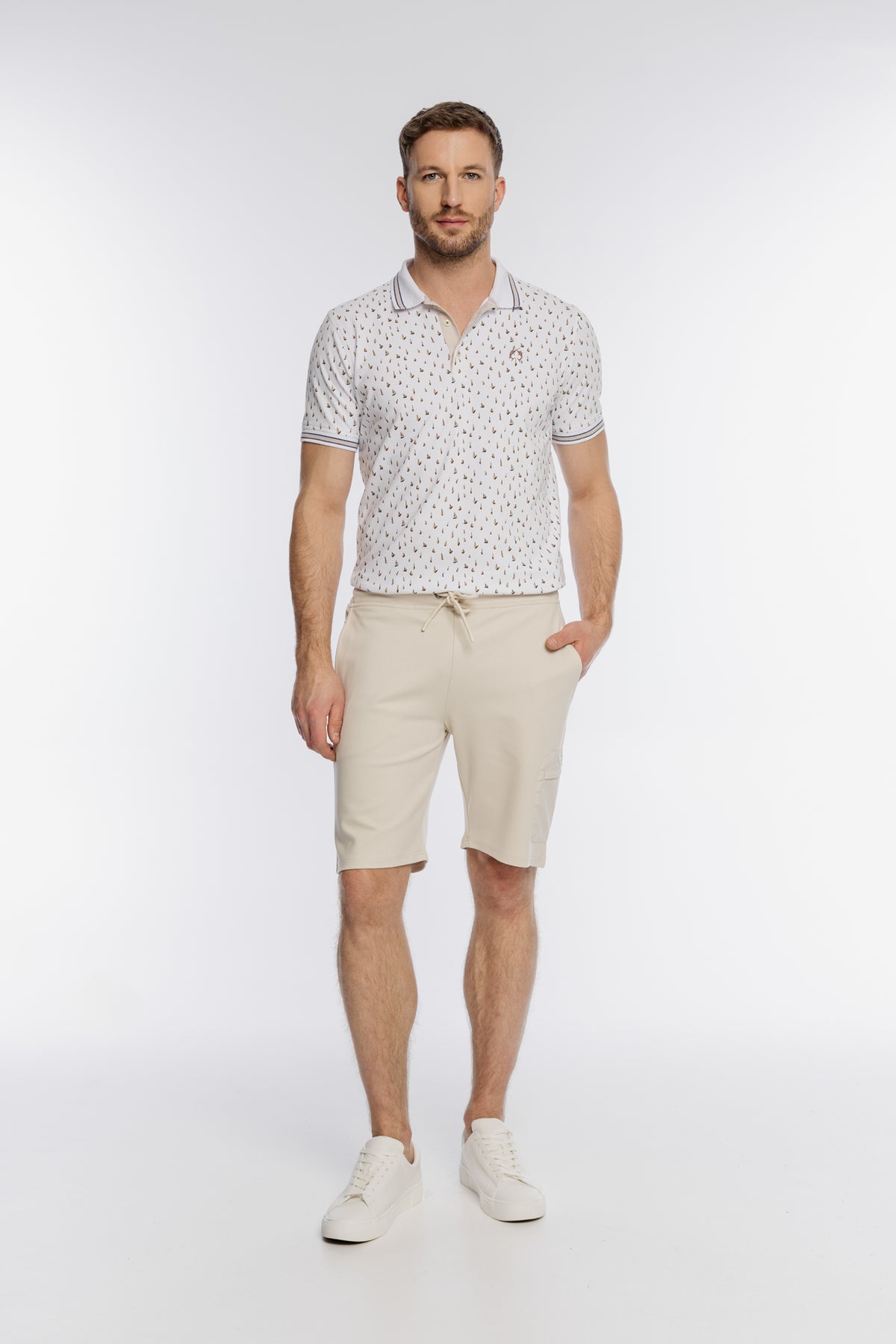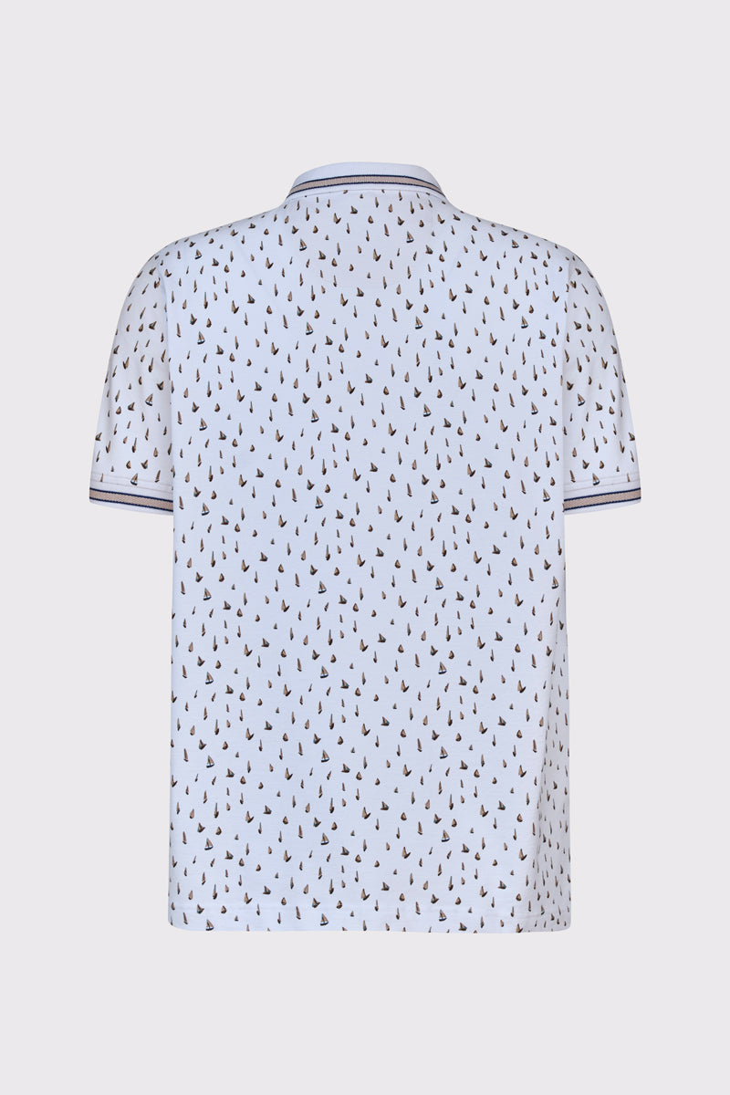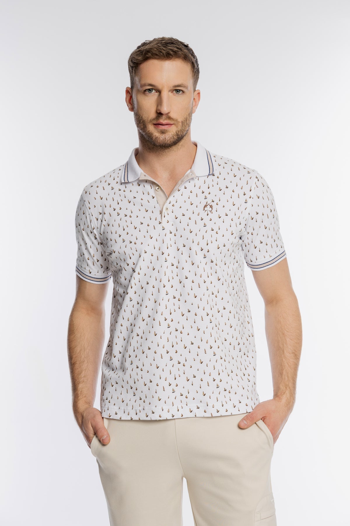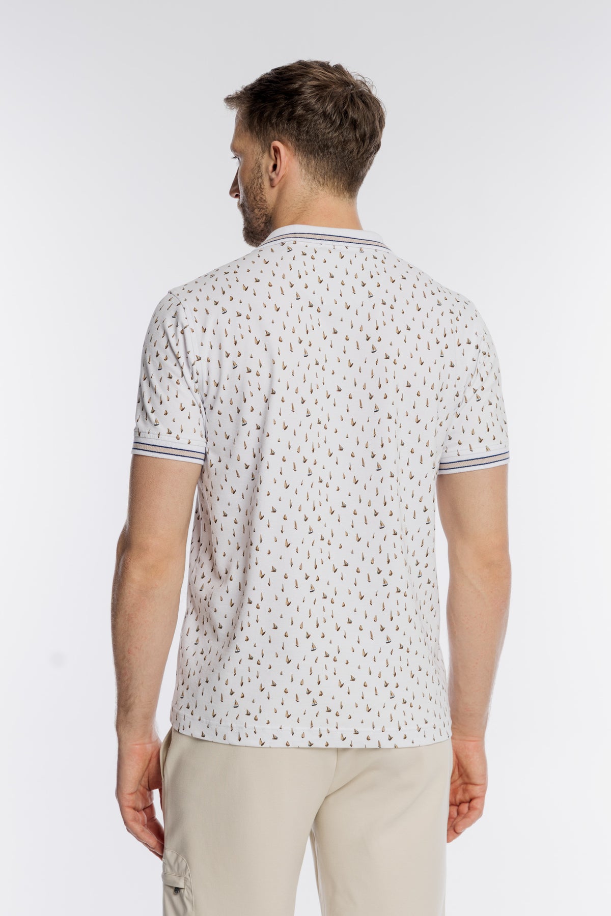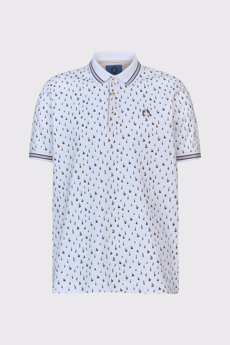 Wyjątkowa męska koszulka polo marki Campione w kolorze białym, pokryta gęstym wzorem drobnych żaglówek. Ten marynistyczny motyw idealnie wpisuje się w letnią estetykę marki i nadaje stylizacji lekkości. Polo posiada klasyczny kołnierzyk z subtelnymi paskami na brzegach oraz ściągacze przy rękawach z identycznym detalem. Wykonana z najwyższej jakości bawełny, gwarantuje wygodę i trwałość użytkowania. Haftowane logo na piersi stanowi eleganckie dopełnienie całości, sprawiając, że jest to doskonały wybór na wakacyjne wyjazdy.