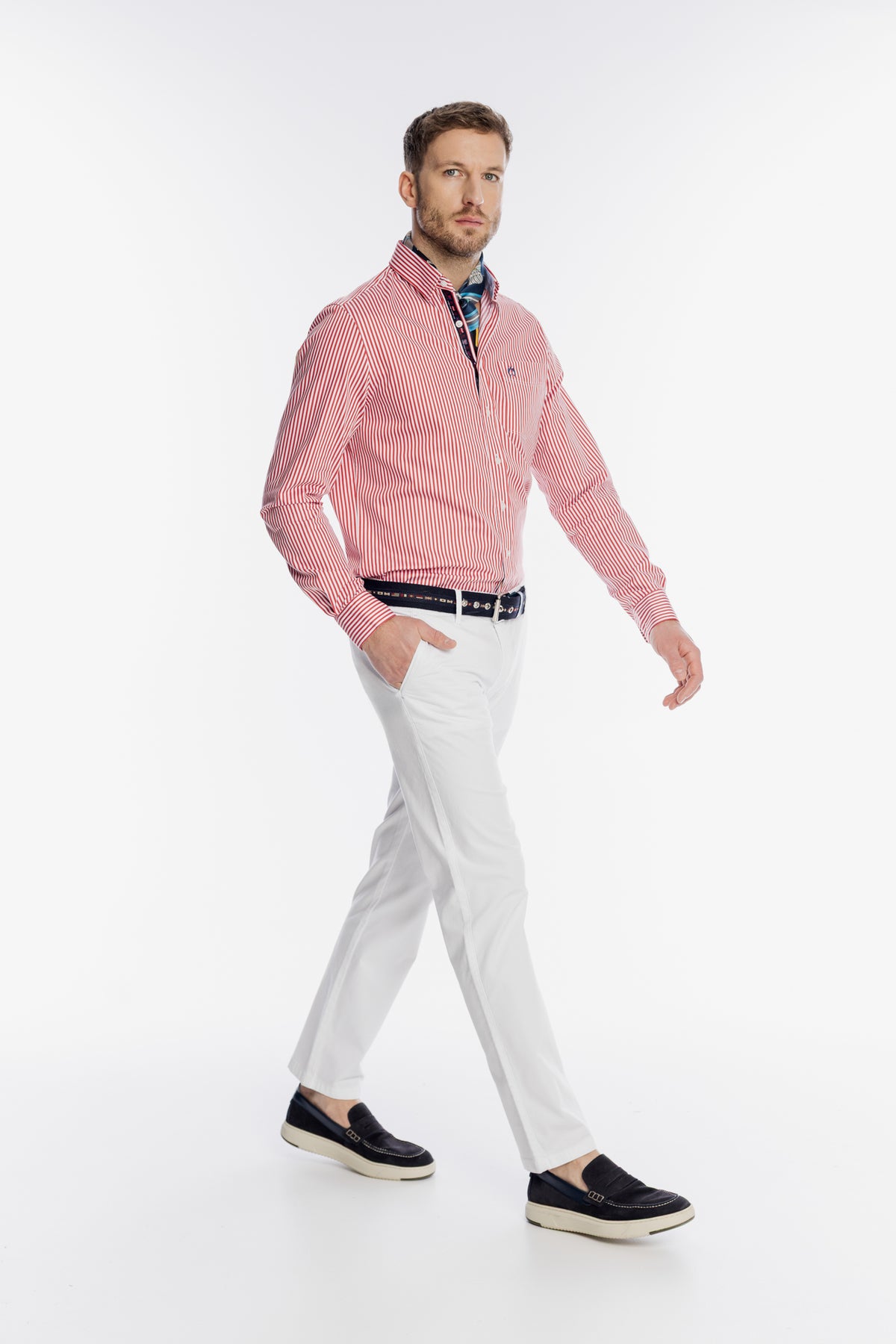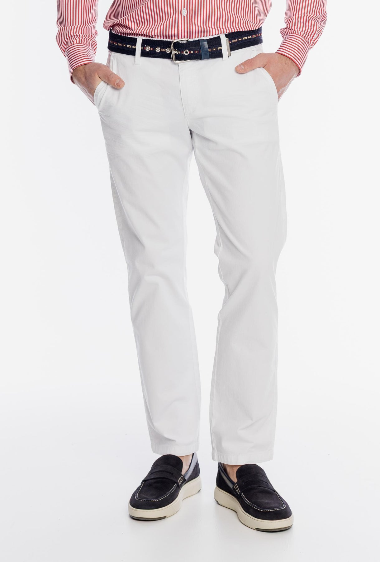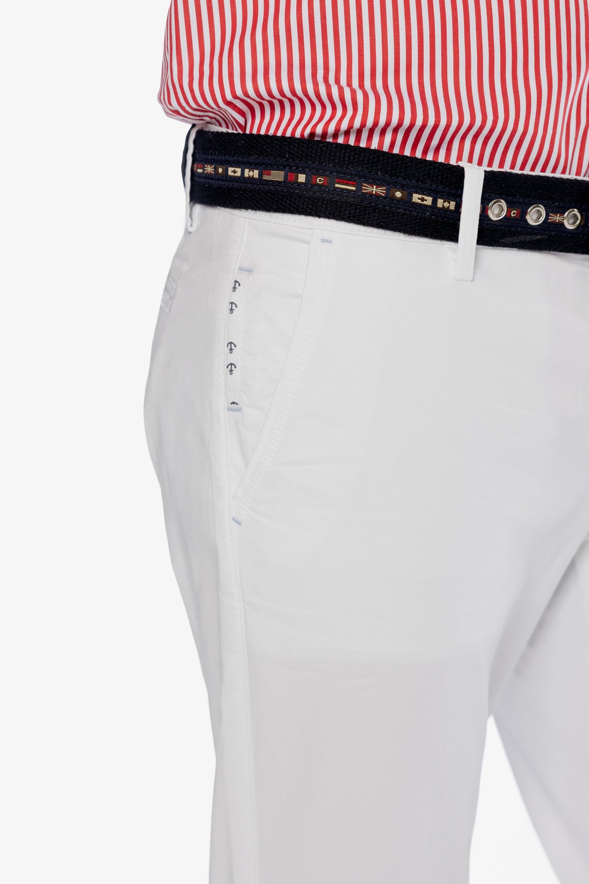 Eleganckie męskie spodnie typu chino marki Campione w kolorze klasycznej bieli, wykonane z najwyższej jakości bawełny z dodatkiem elastycznych włókien dla maksymalnego komfortu. Model wyróżnia się subtelnymi, marynistycznymi detalami w postaci małych haftowanych kotwic przy przedniej kieszeni, co nadaje im unikatowego, prestiżowego charakteru. Spodnie posiadają klasyczny układ kieszeni oraz precyzyjne wykończenie szwów, gwarantujące trwałość i nienaganny wygląd. Idealnie komponują się z koszulami w paski oraz mokasynami, tworząc ponadczasowy zestaw w stylu premium casual. To doskonały wybór dla mężczyzn ceniących czystą formę i wyrafinowane detale w letnich stylizacjach.