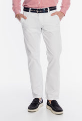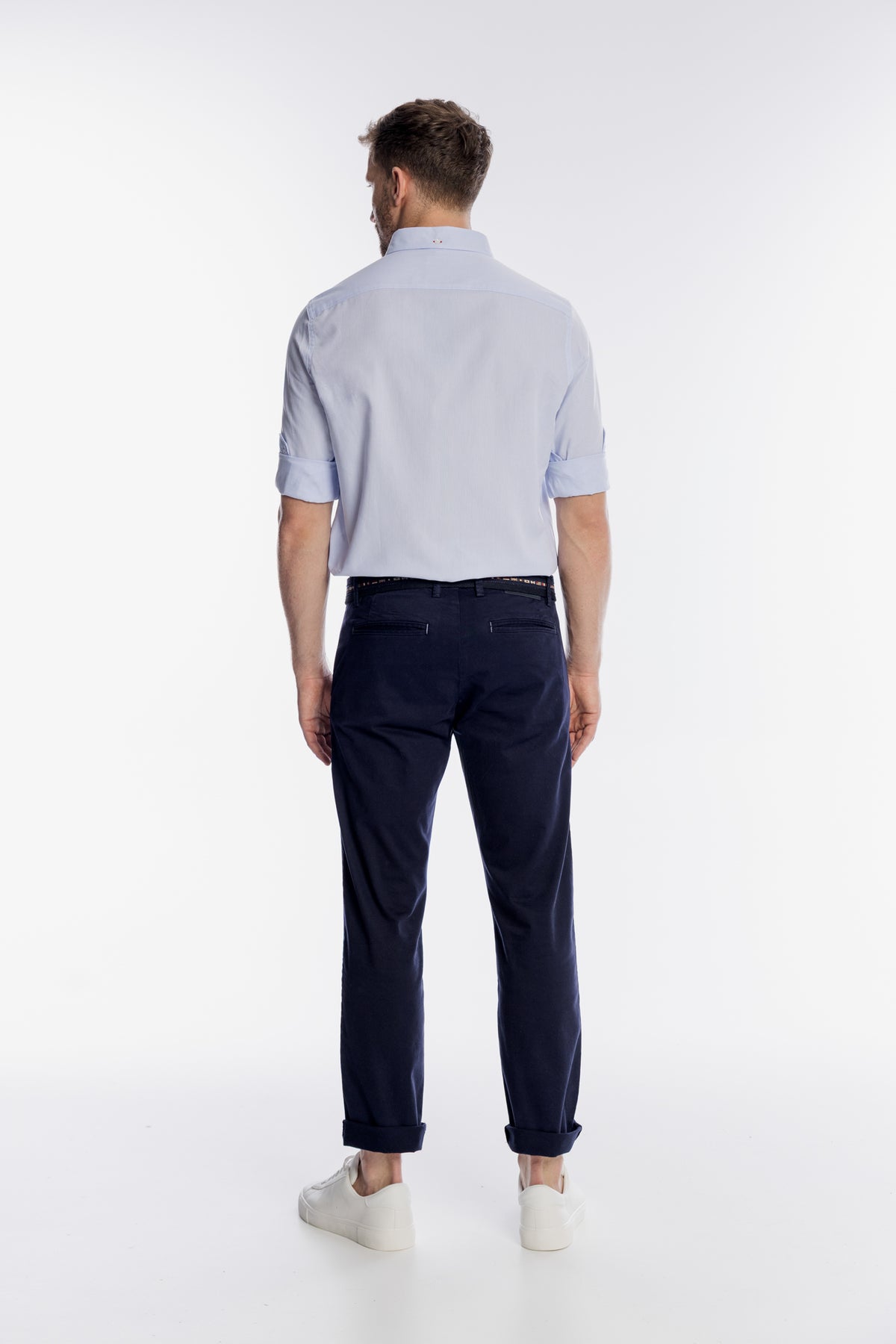 Klasyczne męskie spodnie typu chino marki Campione w głębokim granatowym kolorze, wykonane z wysokogatunkowej bawełny z dodatkiem elastanu dla lepszego dopasowania. Model charakteryzuje się prostym, eleganckim krojem z dwiema wpuszczanymi kieszeniami z przodu oraz dwiema kieszeniami listewkowymi z tyłu. Precyzyjne wykończenie oraz dbałość o detale podkreślają luksusowy charakter produktu, czyniąc go idealną bazą zarówno do biurowych, jak i weekendowych stylizacji. Spodnie doskonale prezentują się z podwiniętymi nogawkami, w zestawieniu z jasną koszulą i sportowym obuwiem lub mokasynami.