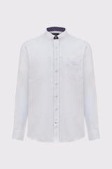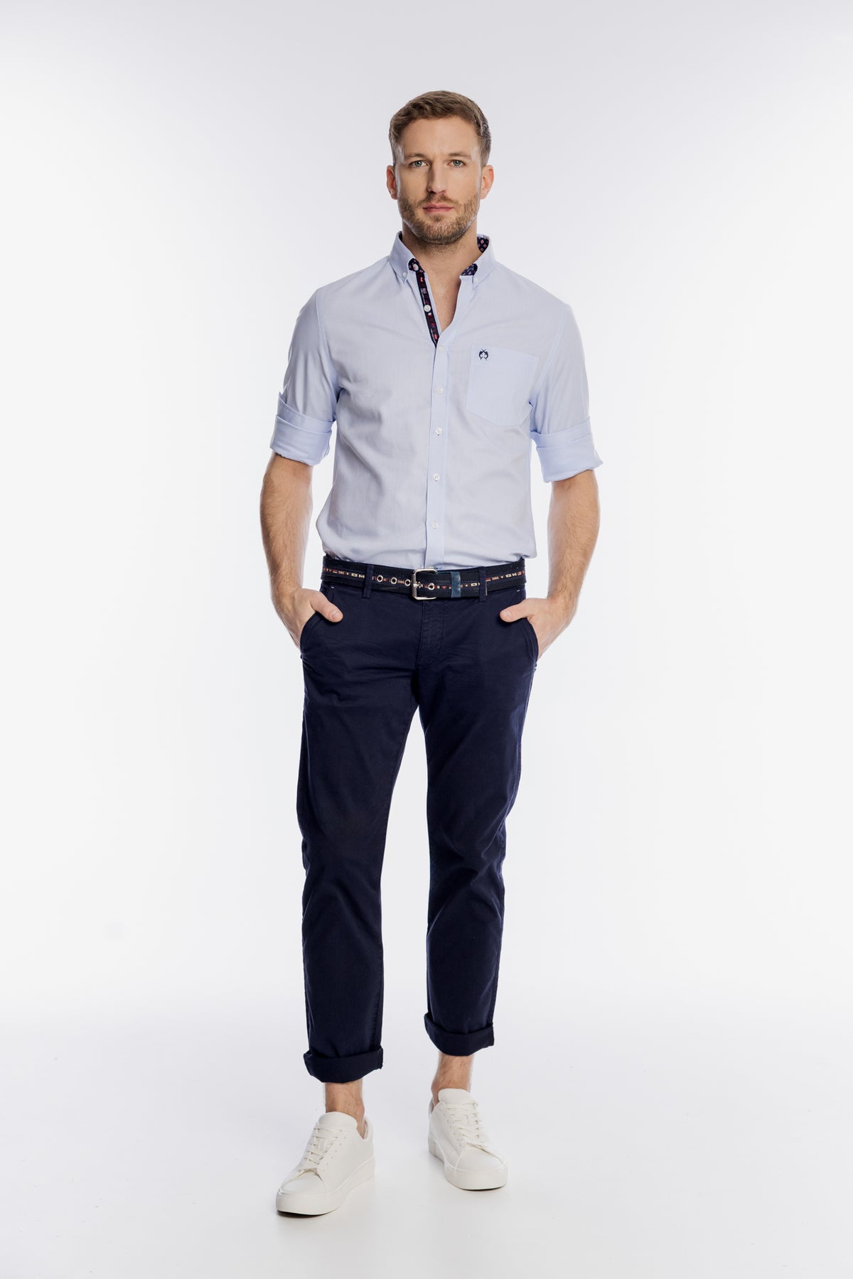 Klasyczna męska koszula marki Campione w delikatnym jasnoniebieskim kolorze to doskonały wybór dla miłośników żeglarskiego stylu. Wykonana z wysokogatunkowej, przewiewnej bawełny, zapewnia wyjątkowy komfort noszenia nawet w cieplejsze dni. Model charakteryzuje się subtelnym, ciemnym wykończeniem wewnętrznej strony stójki z drobnym geometrycznym wzorem oraz praktyczną otwartą kieszonką na lewej piersi z haftowanym logo. Długie rękawy z możliwością podwinięcia nadają całości swobodnego charakteru. Koszula o kroju Regular Fit świetnie komponuje się z ciemnymi spodniami typu chino, tworząc elegancki, a zarazem codzienny look.