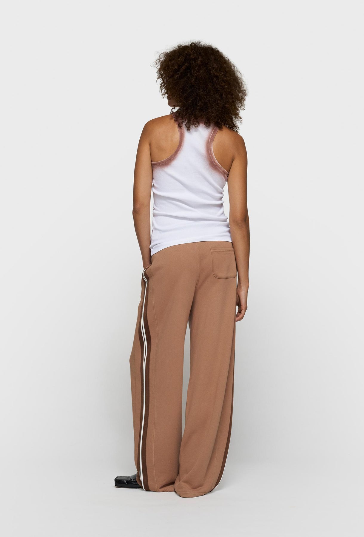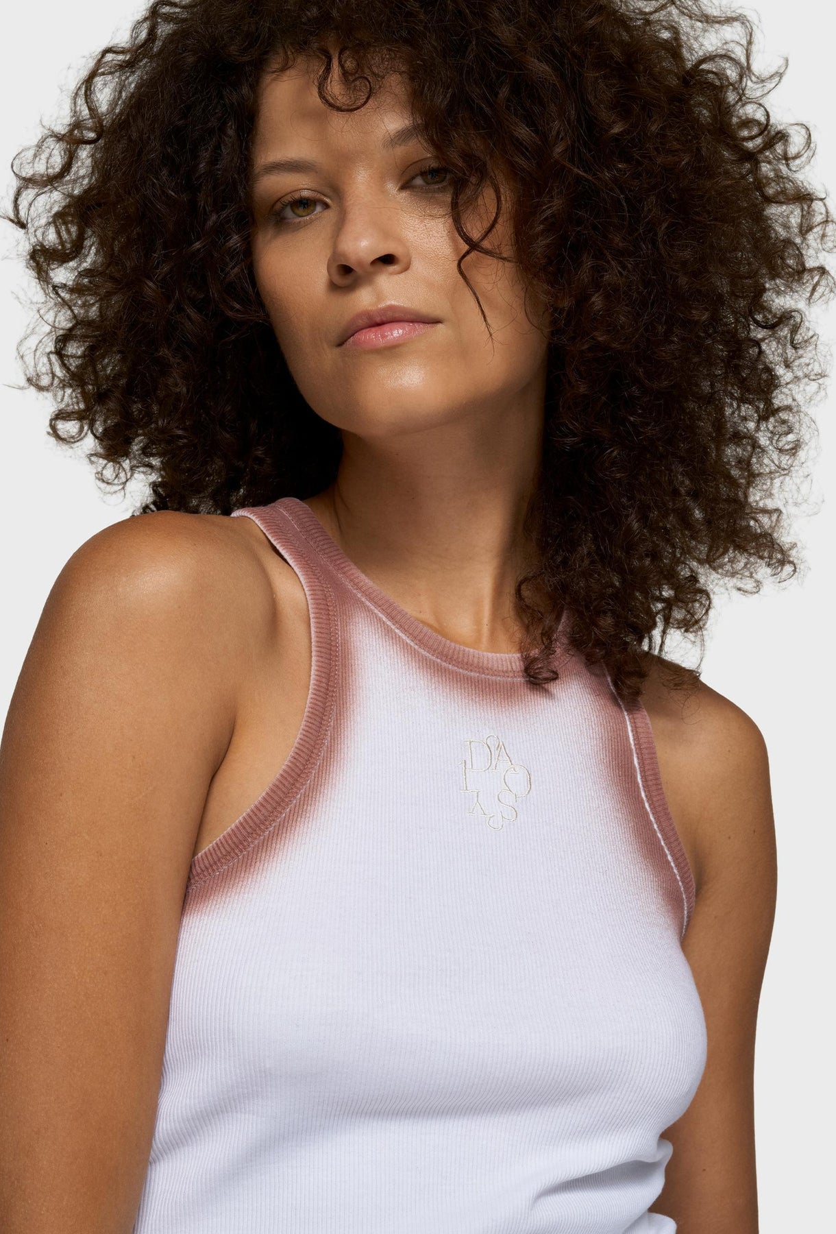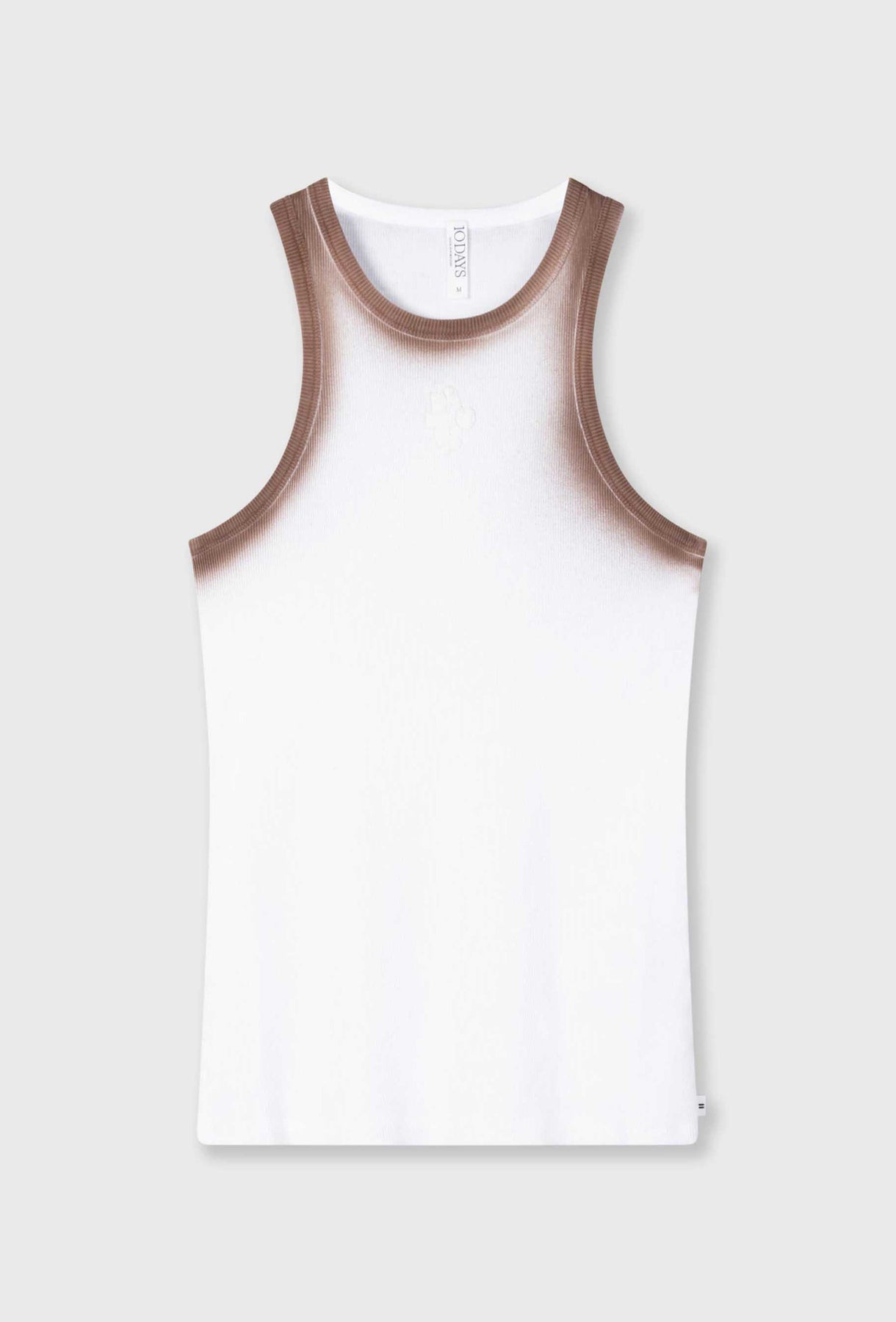 Minimalistyczny top o dopasowanym kroju, wykonany z miękkiej, elastycznej dzianiny prążkowanej, która komfortowo układa się na sylwetce. Klasyczny fason typu racer z delikatnie zabudowanym dekoltem podkreśla ramiona i nadaje całości sportowo-miejskiego charakteru. Kontrastowe lamówki w ciepłym odcieniu beżu stanowią subtelny akcent kolorystyczny, a drobny detal brandingowy z przodu dopełnia całość w nowoczesnym, minimalistycznym stylu. Top doskonale sprawdzi się jako baza do codziennych stylizacji — zarówno w zestawie z dresowymi spodniami, jak i pod marynarką czy koszulą.