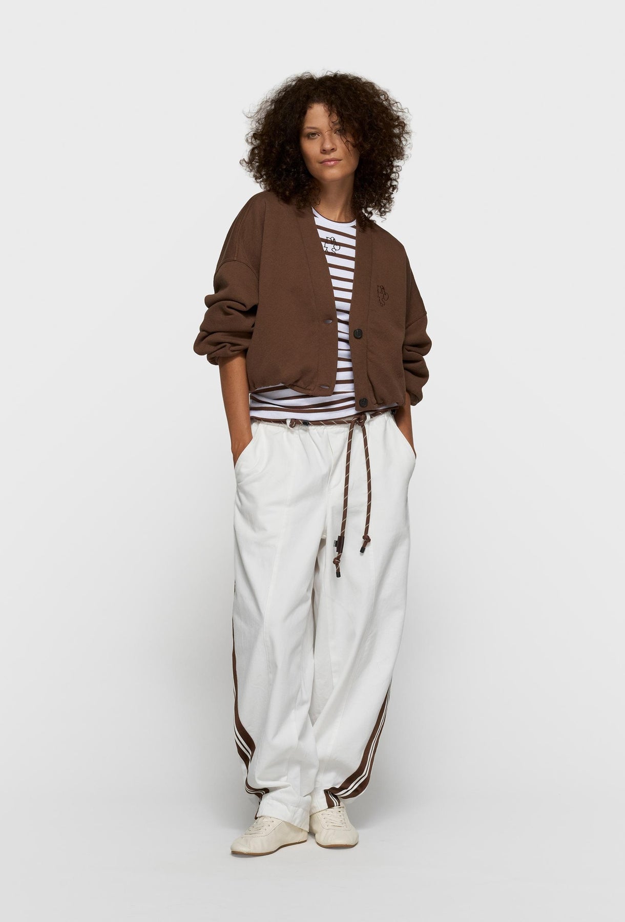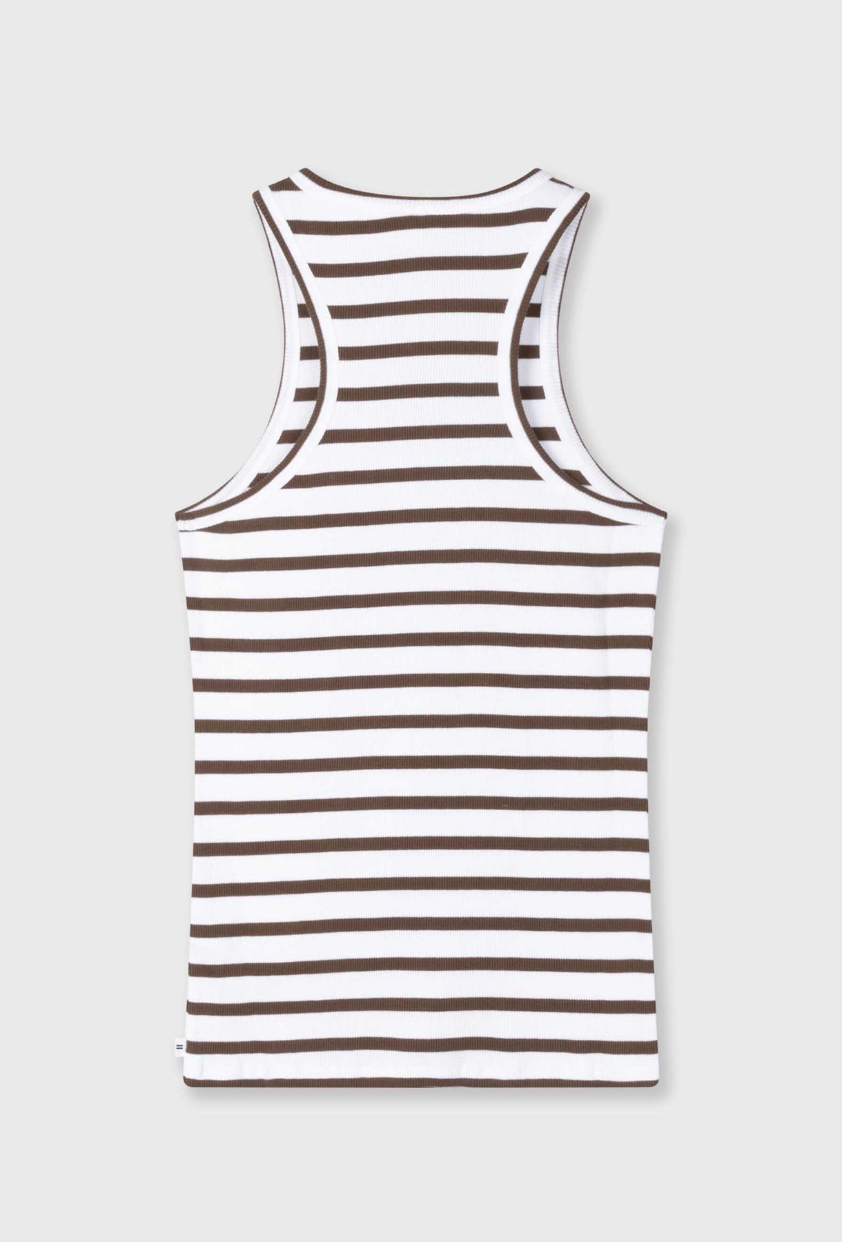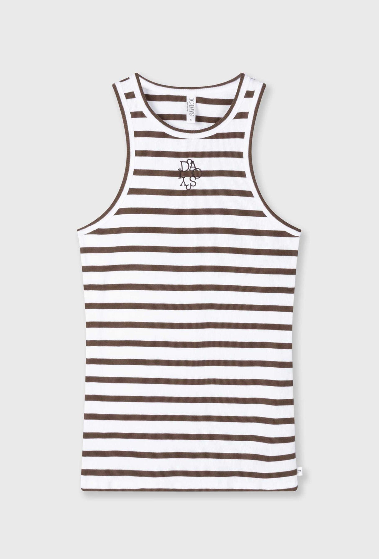 Stylowy top o dopasowanym kroju, wykonany z miękkiej, elastycznej dzianiny prążkowanej w klasyczne biało-brązowe paski. Fason typu racer z zabudowanym dekoltem i wyciętymi ramionami subtelnie podkreśla sylwetkę oraz nadaje całości sportowo-miejskiego charakteru. Kontrastowe lamówki oraz drobny haftowany detal brandingowy z przodu stanowią wyrazisty, ale wciąż minimalistyczny akcent. Top doskonale sprawdzi się w codziennych stylizacjach — noszony solo w ciepłe dni lub jako baza pod marynarkę, koszulę czy bluzę.