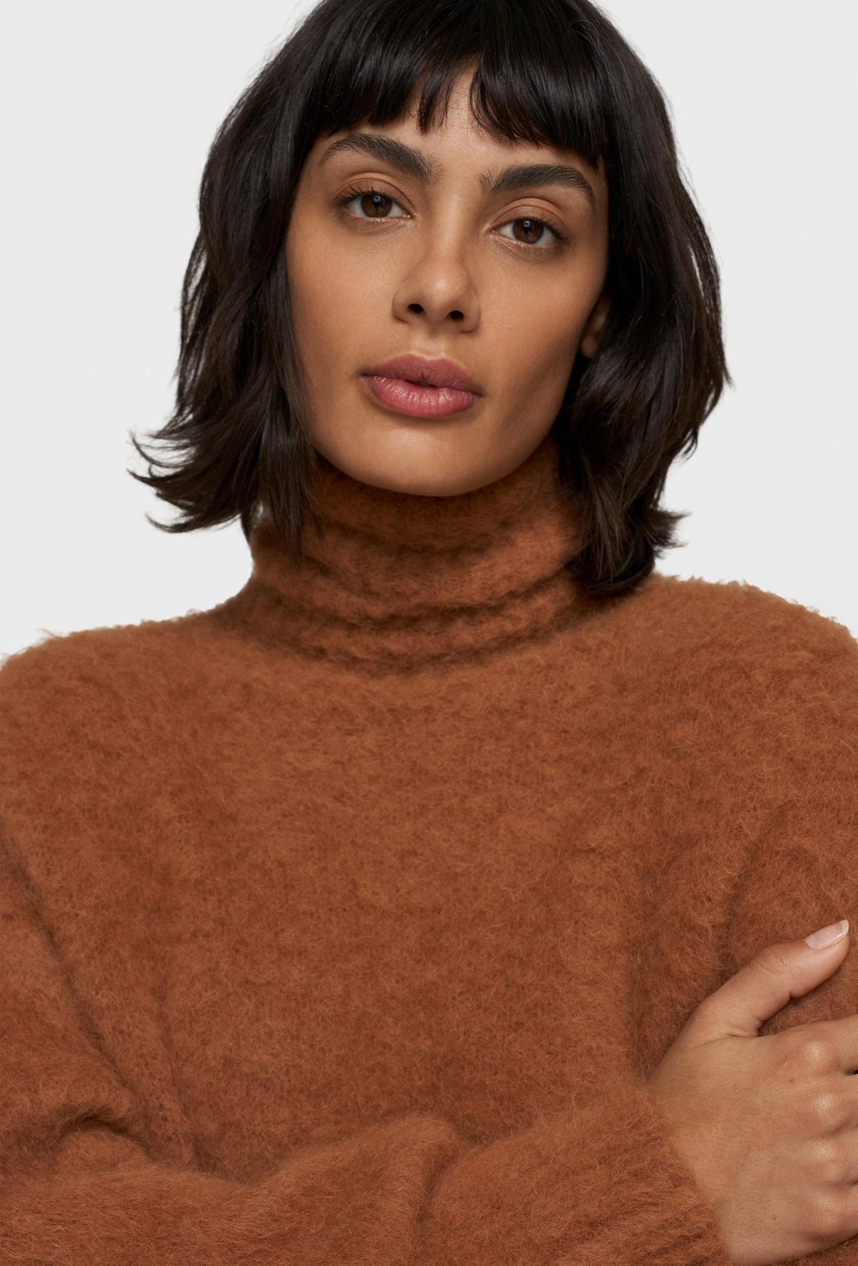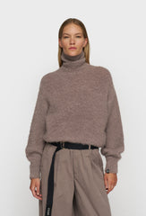 Sweter w kolorze ciepłego brązu, wykonany z puszystej dzianiny, która nadaje mu przytulny i modny charakter. Model o krótszym kroju, z długimi rękawami i obniżoną linią ramion. Wyposażony w klasyczny golf, który otula szyję i zapewnia komfort w chłodniejsze dni. Prosty design w połączeniu z wyrazistą fakturą materiału sprawia, że sweter świetnie łączy się zarówno z casualowymi spodniami, jak i bardziej eleganckimi elementami garderoby.
