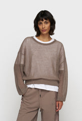 Lekki sweter w ciepłym, karmelowym odcieniu, wykonany z delikatnej i przewiewnej dzianiny. Model z okrągłym dekoltem, długimi rękawami oraz luźnym krojem, który zapewnia komfort noszenia i swobodę ruchów. Półtransparentna struktura materiału dodaje mu nowoczesnego charakteru i subtelnej lekkości. Doskonały wybór na co dzień – świetnie sprawdzi się zarówno w casualowych, jak i bardziej eleganckich stylizacjach warstwowych.