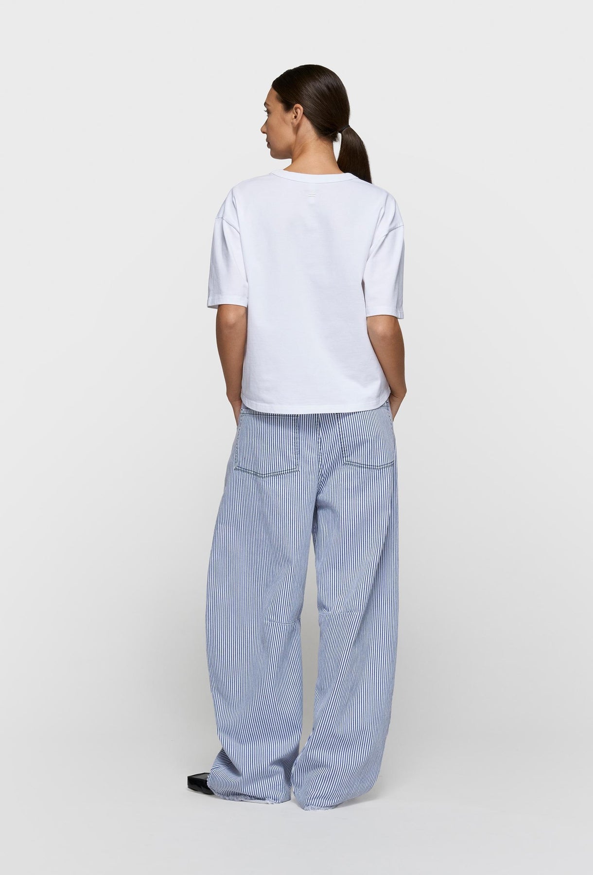 Stylowy T-shirt o swobodnym, lekko oversize’owym kroju, wykonany z miękkiej, wysokiej jakości bawełny w kolorze białym. Model z kobiecym dekoltem w kształcie litery V subtelnie podkreśla linię szyi i nadaje całości lekkości. Krótkie rękawy oraz obniżona linia ramion zapewniają komfort i nowoczesny charakter. Wyrazistym detalem jest dekoracyjna naszywka z liczbą „10” na piersi, która nadaje koszulce sportowo-casualowy styl i modowy akcent. Idealna baza do codziennych stylizacji – świetnie komponuje się zarówno z jeansami, jak i spodniami materiałowymi czy spódnicą.