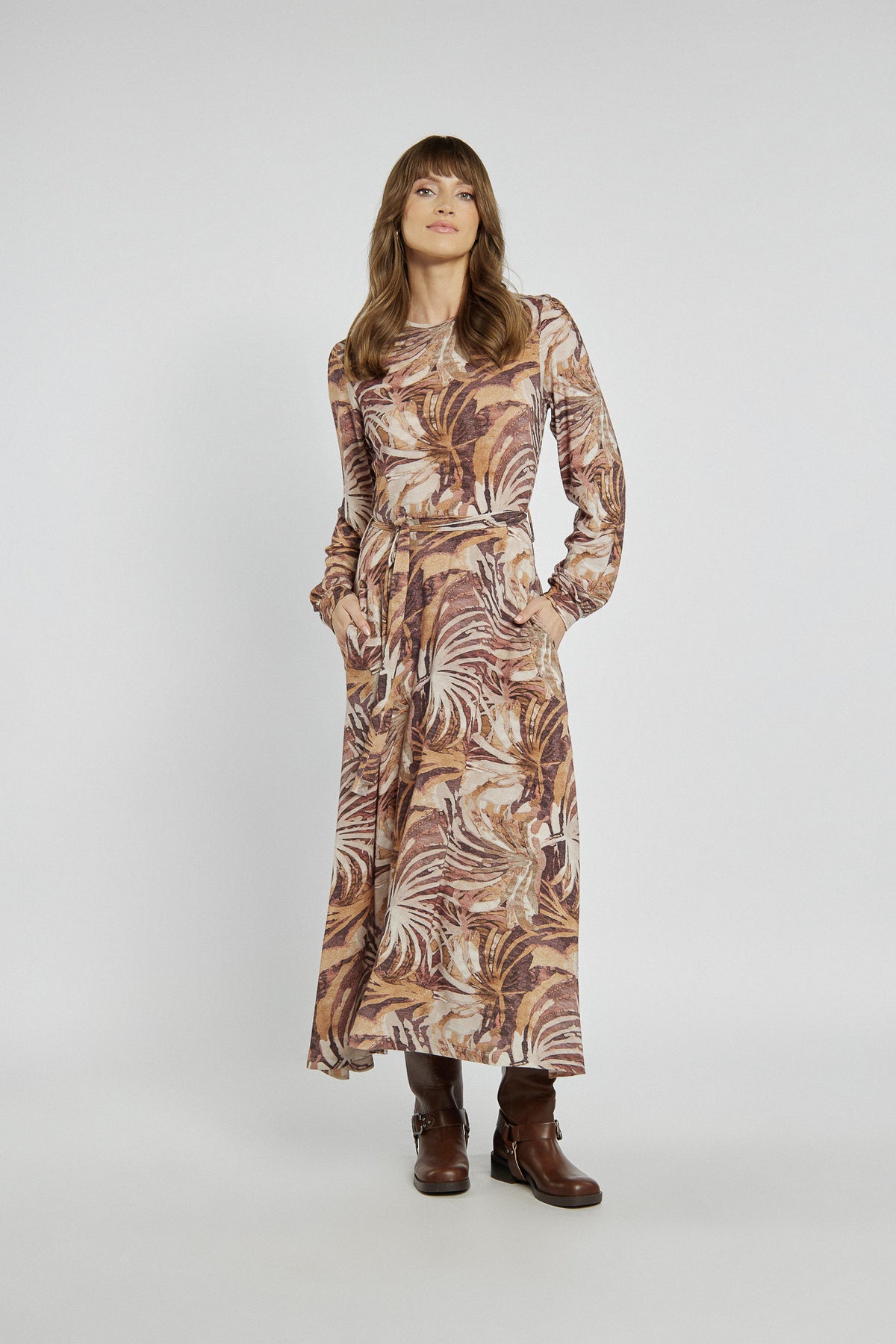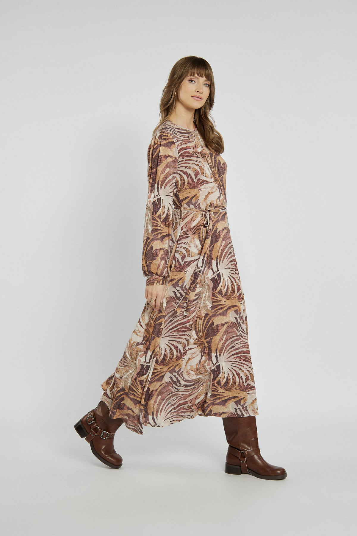 Zjawiskowa sukienka maxi Campione z tropikalnym nadrukiem w odcieniach brązu i beżu to propozycja dla kobiet ceniących wygodę i styl. Model z długim rękawem, okrągłym dekoltem i wiązanym paskiem w talii podkreśla sylwetkę, a jednocześnie zapewnia swobodę ruchów. Idealna do jesiennych stylizacji – doskonale komponuje się zarówno z kozakami, jak i lekkimi botkami.