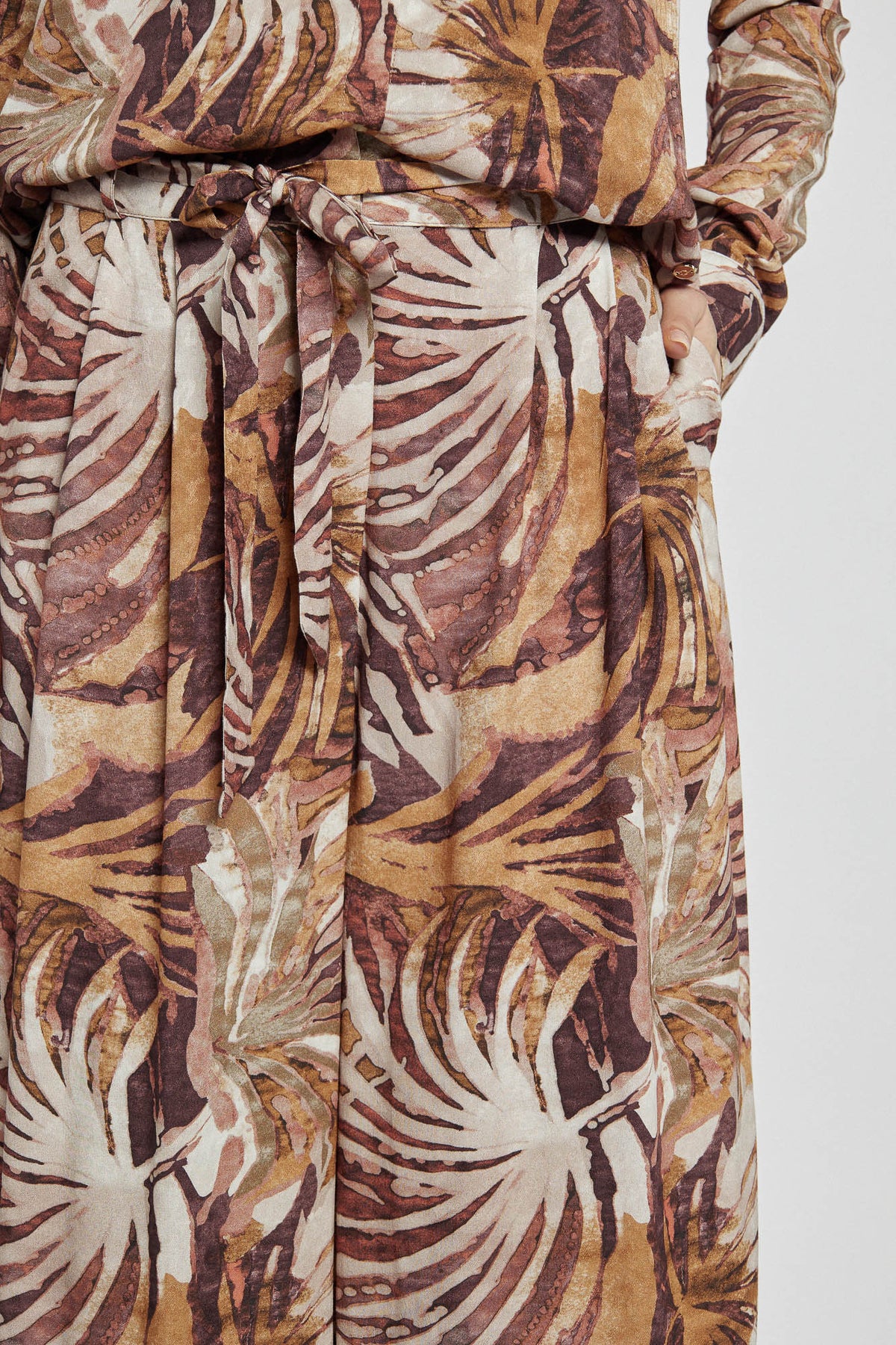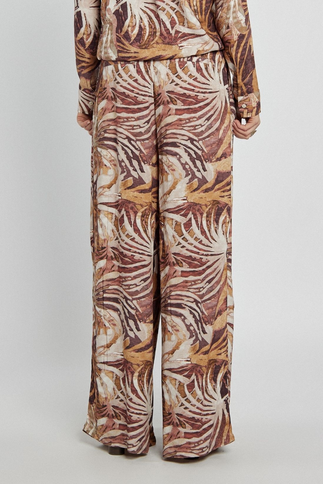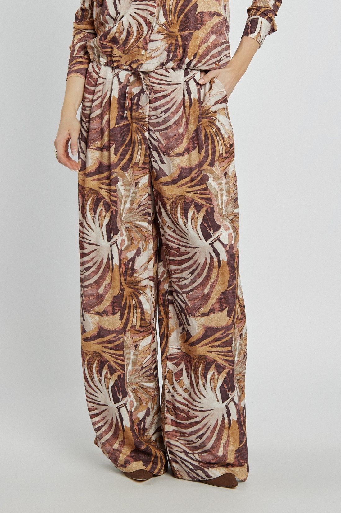 Stylowe spodnie Campione o szerokim kroju, ozdobione nadrukiem w liście w jesiennych tonacjach. Elastyczny pas z wiązaniem oraz praktyczne kieszenie zapewniają wygodę noszenia. Idealne do stworzenia zestawu z koszulą w tym samym wzorze. Lekkie, przewiewne i bardzo kobiece.