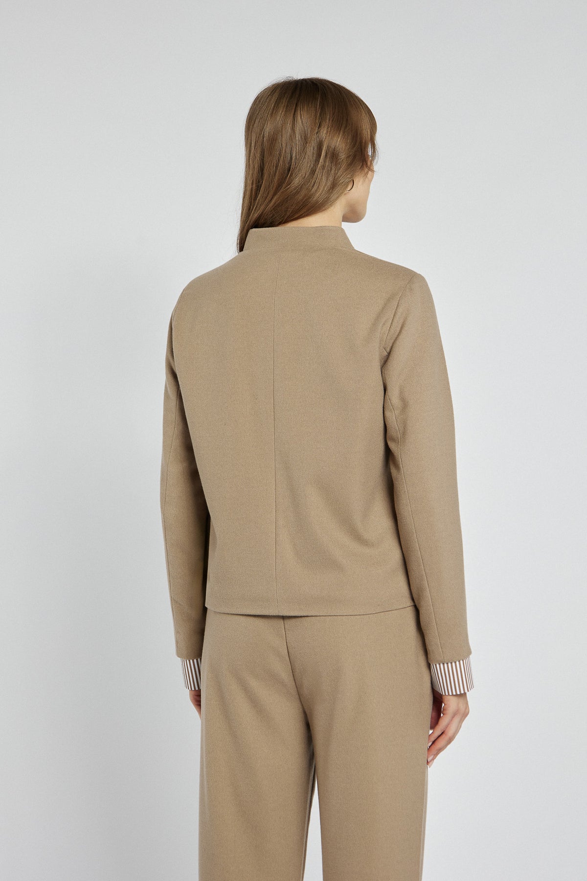 Elegancki, krótki żakiet Campione w odcieniu camelowym z dużymi ozdobnymi guzikami i dwoma kieszeniami z patkami na piersi. Minimalistyczna stójka oraz kontrastujące mankiety w paski dodają wyrazistego akcentu. Wykonany z przyjemnego w dotyku materiału, sprawdzi się zarówno w stylizacjach codziennych, jak i biznesowych.