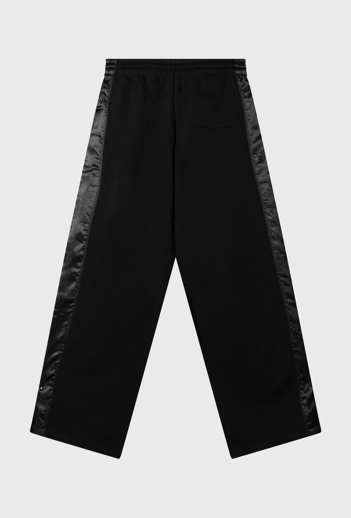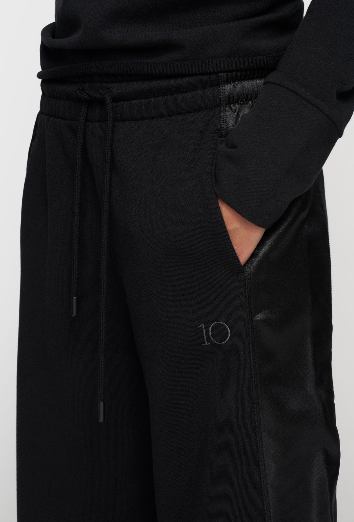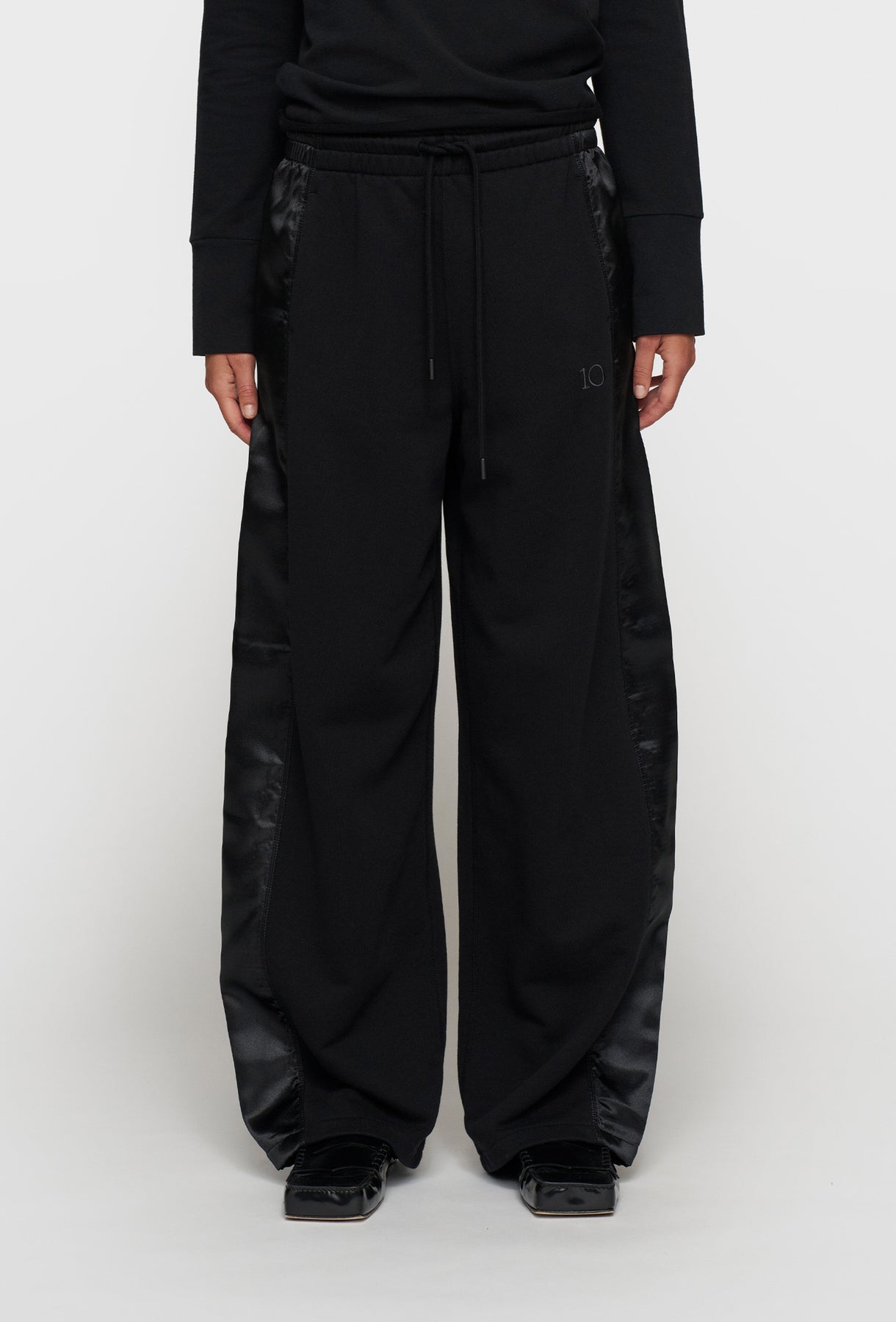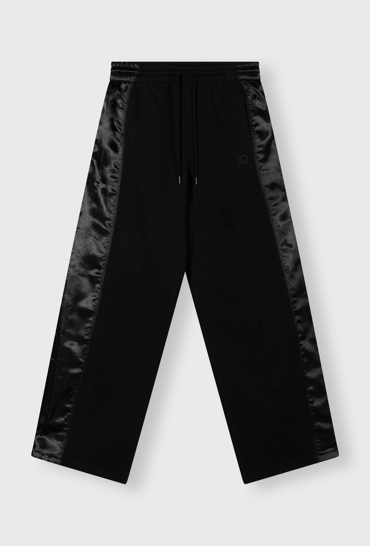 Spodnie w kolorze czarnym, wykonane z miękkiej dzianiny o gładkim splocie. Model o szerokim, swobodnym kroju z prostą nogawką. Po bokach ozdobne, błyszczące lampasy z tkaniny o satynowym wykończeniu. W pasie elastyczna guma z troczkiem umożliwiającym regulację obwodu. Z przodu dwie kieszenie boczne, z tyłu jedna naszywana kieszeń. Minimalistyczny detal w postaci haftowanego logo „10”. Uniwersalne spodnie o nowoczesnym charakterze – idealne do codziennych i sportowych stylizacji.