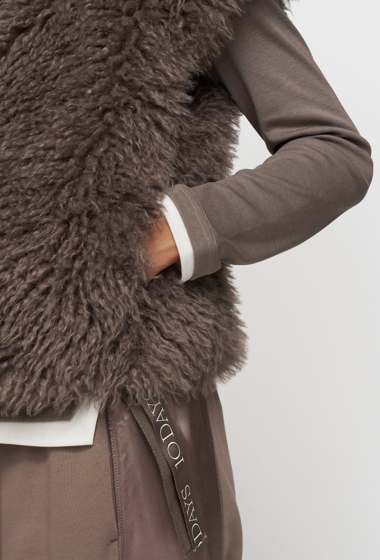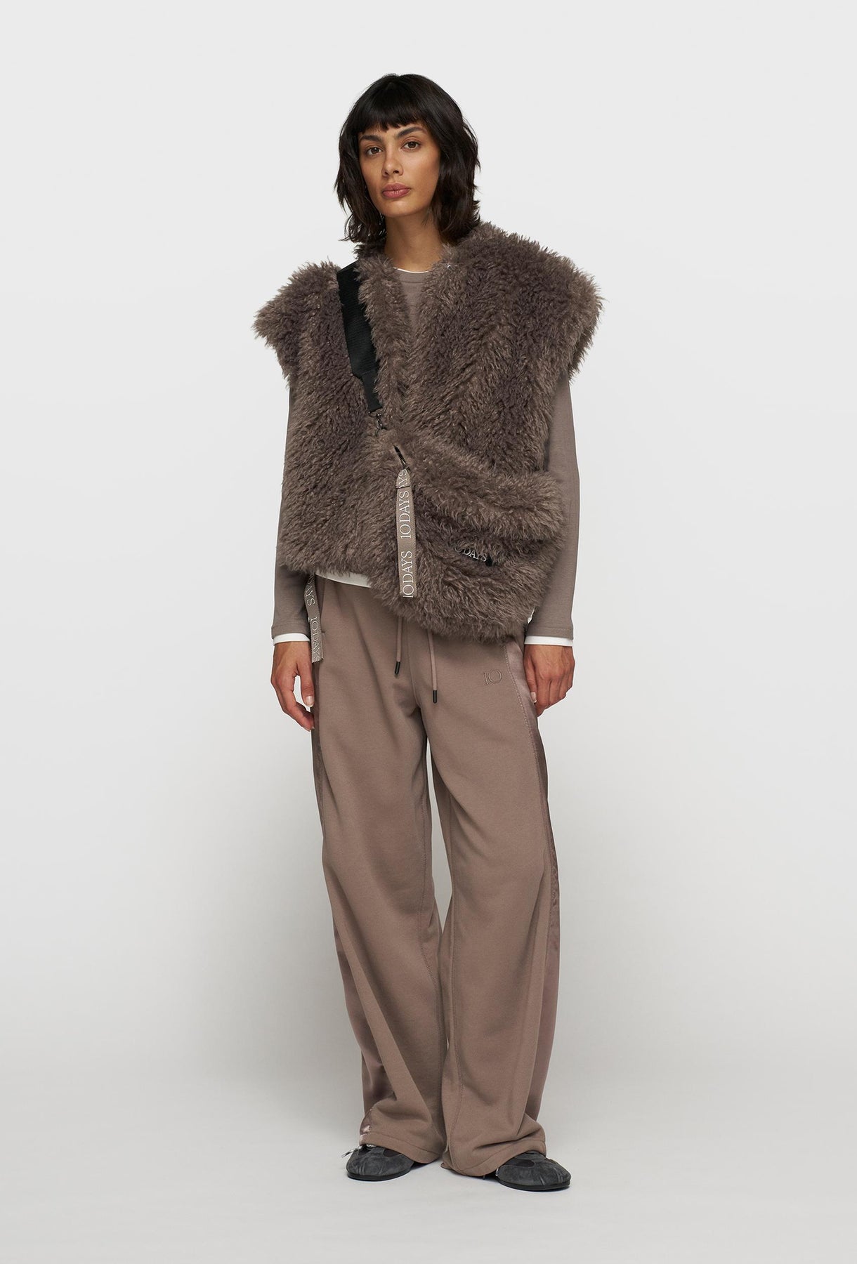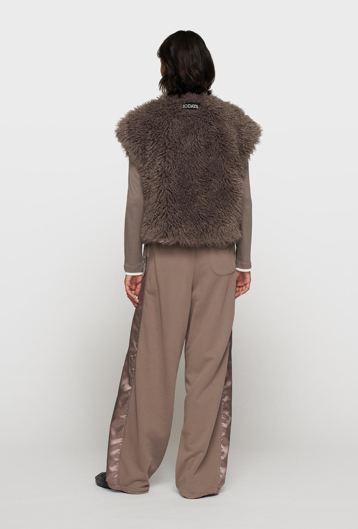 Ta modna kamizelka o luksusowym wyglądzie jest wykonana z miękkiego, długowłosego sztucznego futra w eleganckim, neutralnym odcieniu taupe (szarobrązowym). Stanowi ona idealne uzupełnienie warstwowych stylizacji, zapewniając zarówno ciepło, jak i niepowtarzalny charakter. Krótki fason bez zapięcia pozwala na swobodne noszenie na bluzki, golfy czy swetry, nadając całości boho-chic. Wyrazista, puchata faktura materiału jest głównym elementem dekoracyjnym. U dołu kamizelki umieszczone są ozdobne taśmy, które wprowadzają nowoczesny, sportowy akcent i kontrastują z miękkością futra. To uniwersalny i odważny dodatek, który urozmaici każdą casualową garderobę.
