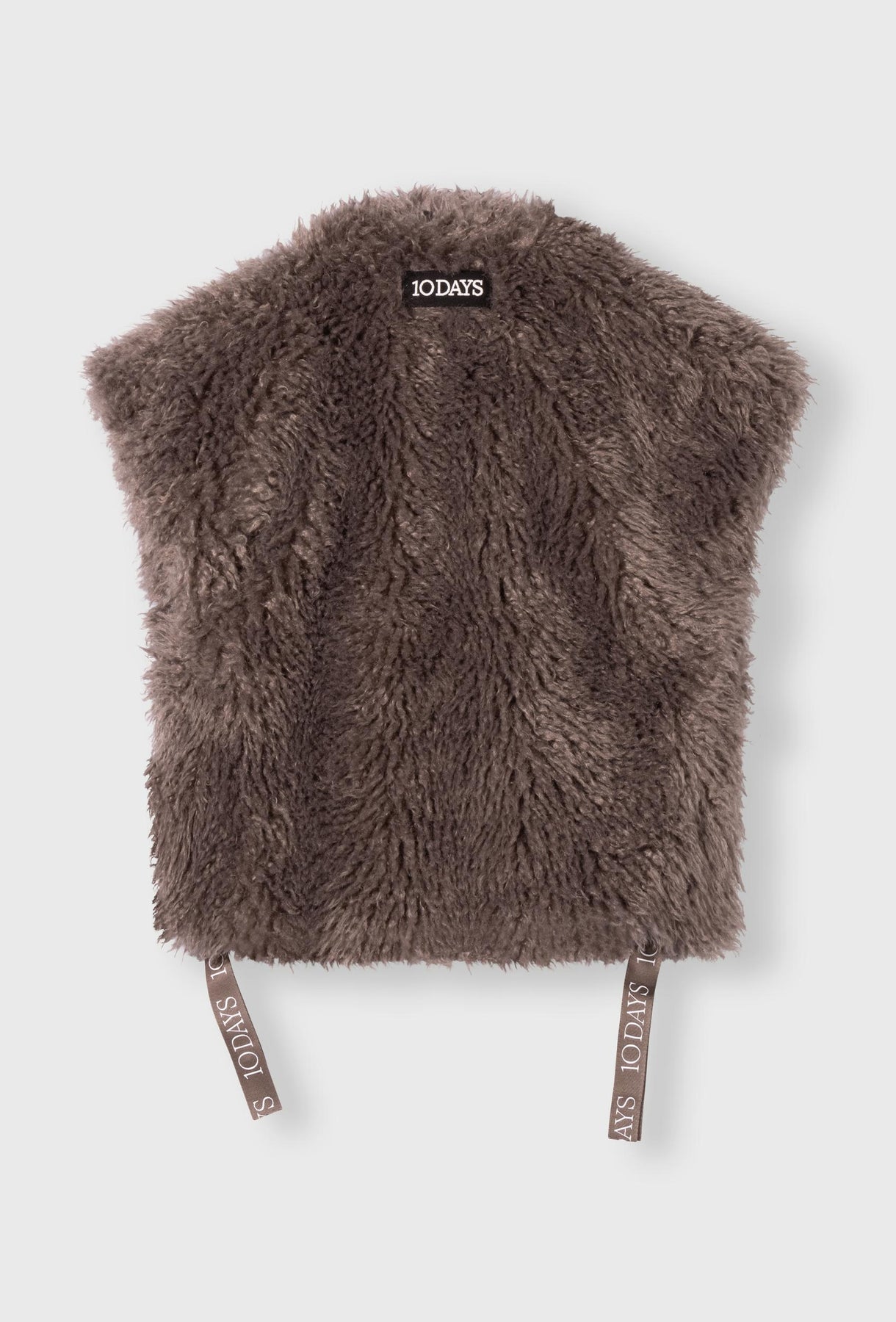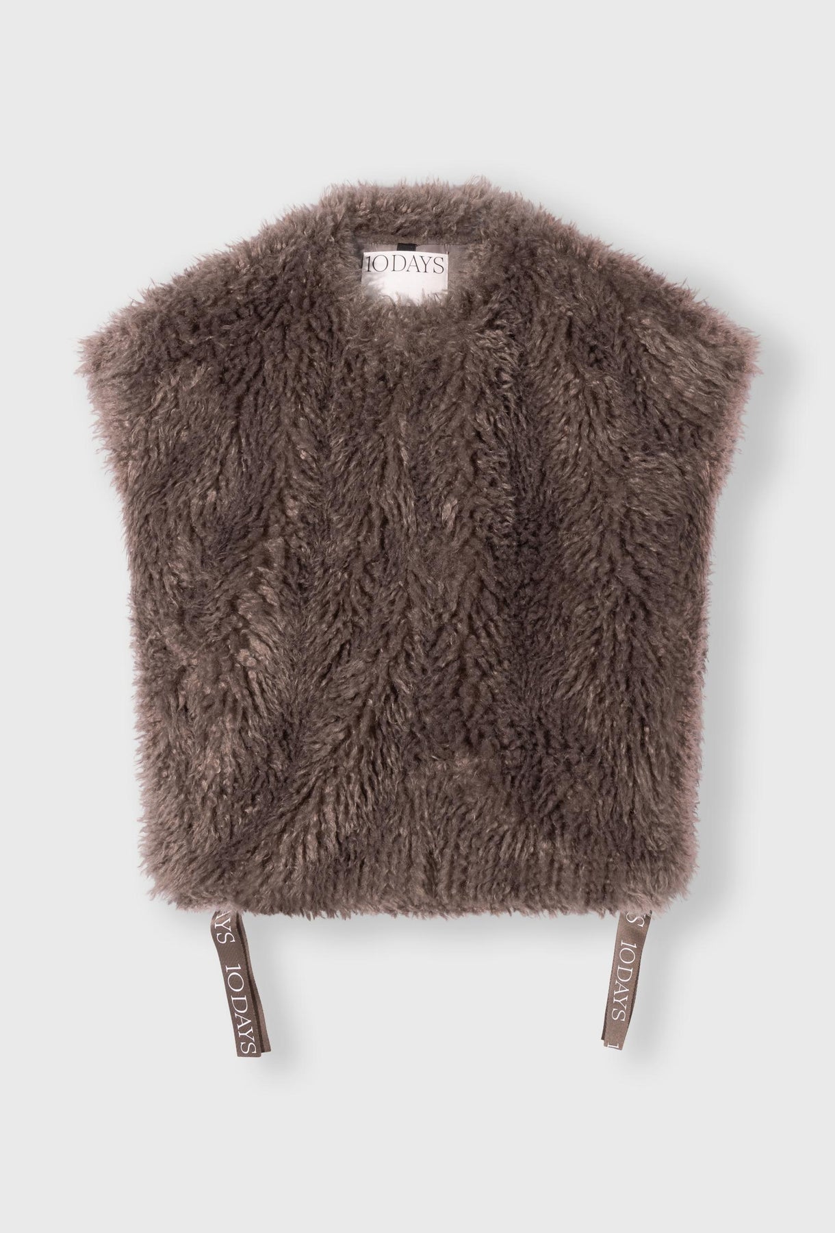 Bezrękawnik z puszystego sztucznego futra w neutralnym kolorze taupe