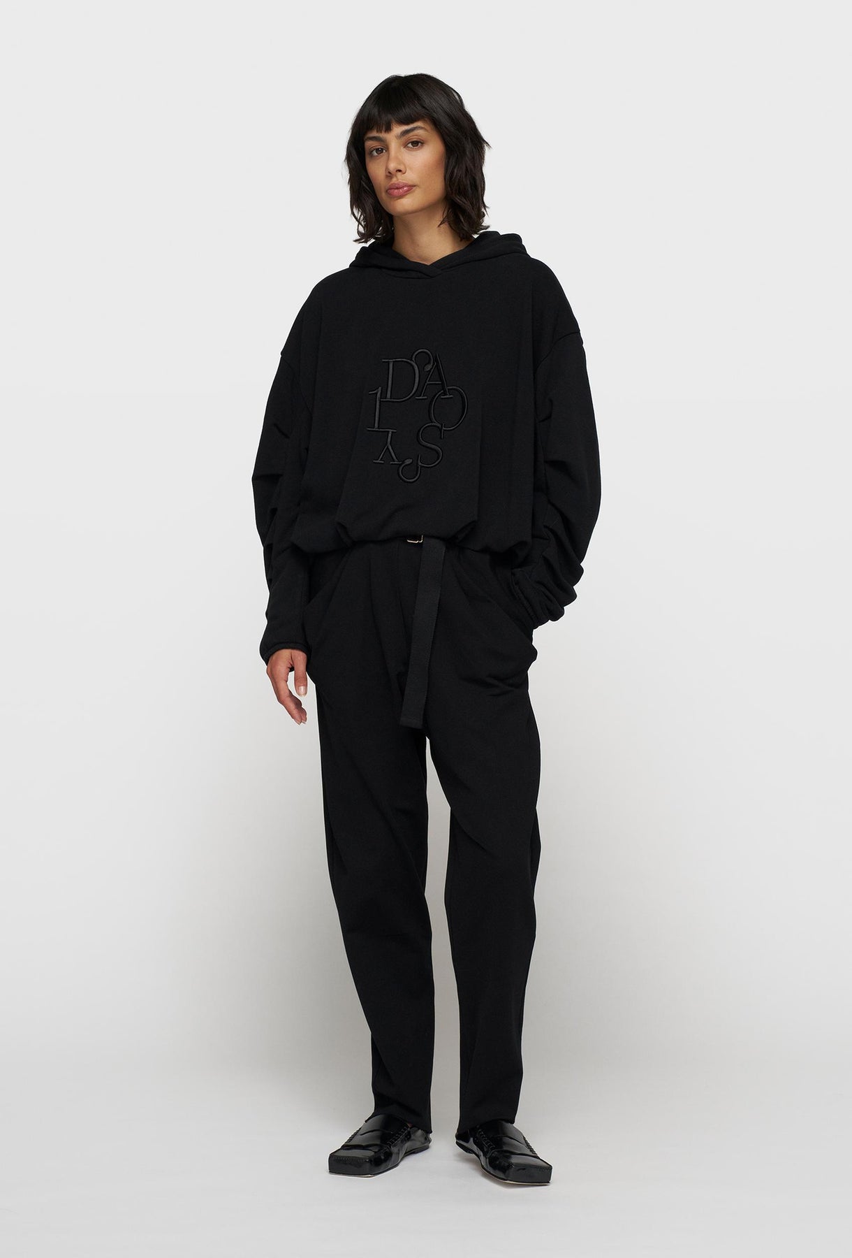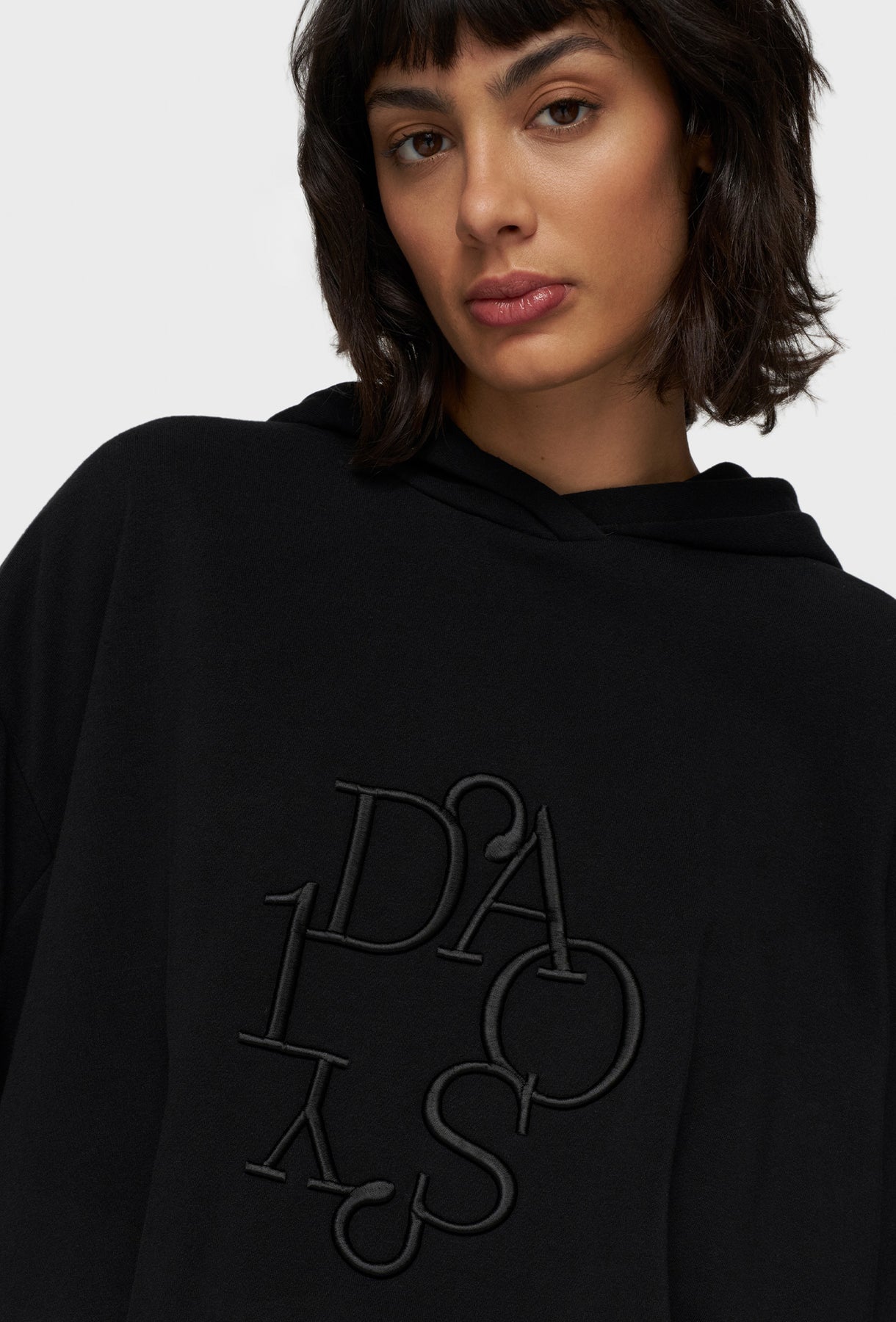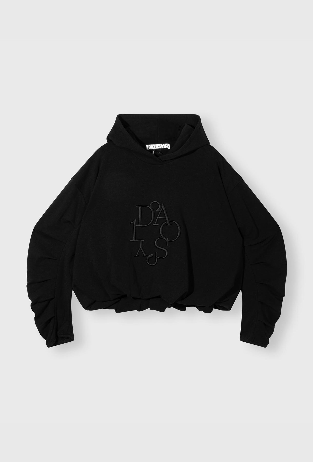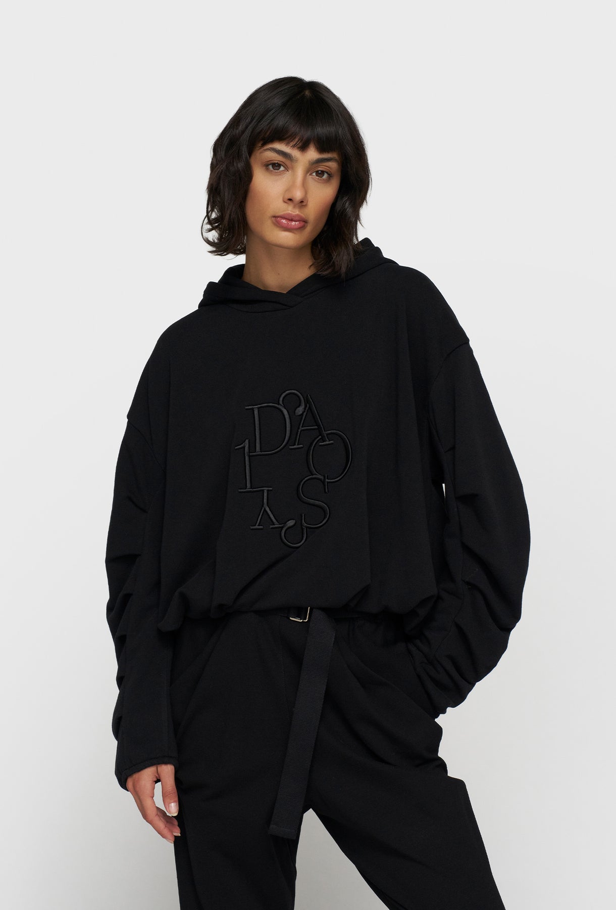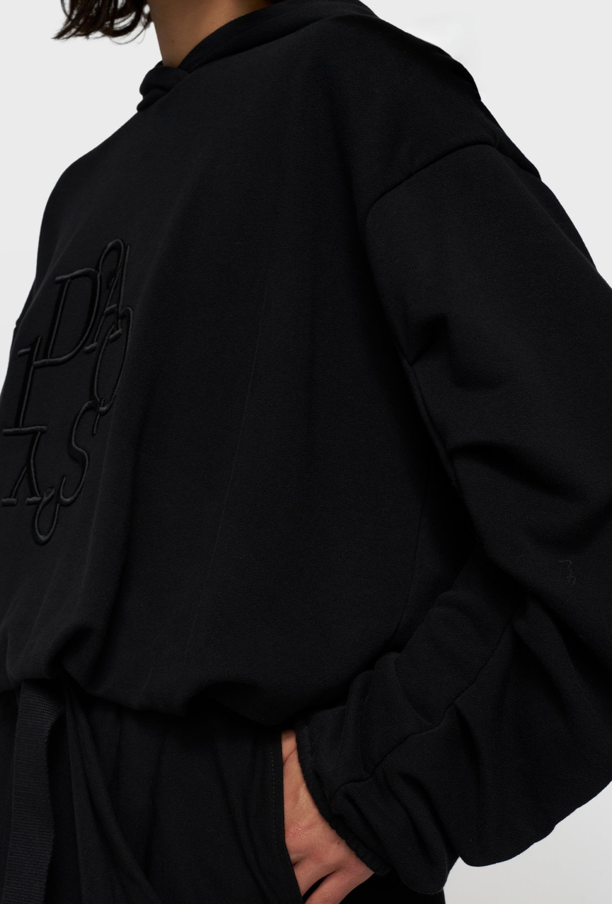 Ta czarna, oversizowa bluza z kapturem to kwintesencja nowoczesnego, luźnego stylu. Jej skrócony fason w połączeniu z szeroką, elastyczną dolną krawędzią tworzy modny, balonowy kształt, który doskonale sprawdzi się w zestawieniach z ubraniami z wysokim stanem. Wykonana z miękkiego, wysokiej jakości materiału, gwarantuje komfort noszenia przez cały dzień. Unikalnego charakteru nadają jej marszczone, bufiaste rękawy, które dodają dynamicznego i nieco awangardowego akcentu. Na piersi umieszczony jest tonalny, matowy haft o intrygującym, zaokrąglonym kroju.