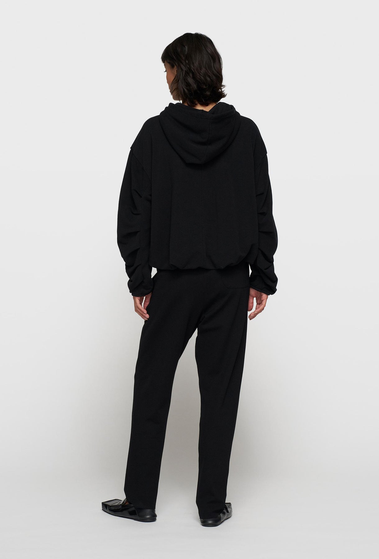 Czarna bluza z kapturem marszczonymi rękawami