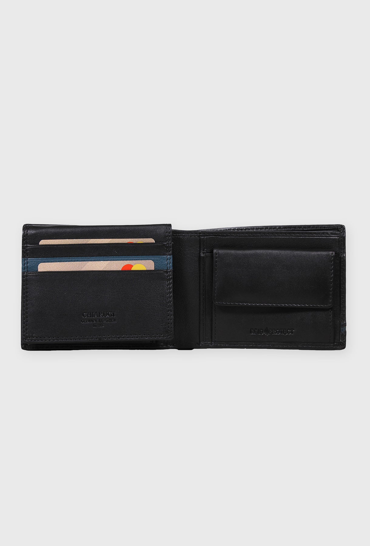 Elegancki, dwuskładany portfel w ponadczasowym odcieniu głębokiej czerni, wykonany z gładkiej skóry naturalnej. Wyróżnia go dyskretny, turkusowy detal w postaci linii akcentującej, dodającej nowoczesnego charakteru tradycyjnej formie. Kluczową cechą tego modelu jest funkcjonalna sekcja na monety, zamykana na klasyczny zatrzask, która uzupełnia przestrzeń na banknoty i liczne przegródki na karty. Ten model jest idealnym połączeniem kompaktowego fasonu i pełnej funkcjonalności.