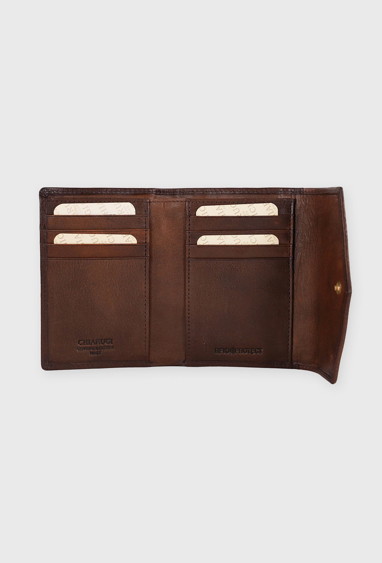 Ten kompaktowy portfel w fasonie trifold jest synonimem elegancji i wyjątkowej funkcjonalności. Wykonany z wysokogatunkowej skóry naturalnej w głębokim odcieniu antycznego brązu, łączy trwałość materiału z subtelnym, klasycznym wykończeniem. Wnętrze zostało starannie zorganizowane, oferując liczne przegródki na karty i dokumenty