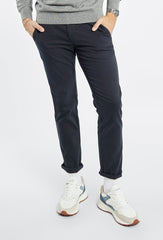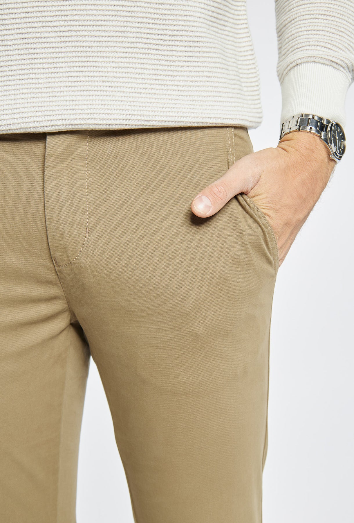 Klasyczne spodnie męskie chinos Primodi w uniwersalnym odcieniu beżu to esencja casualowej elegancji. Zaprojektowane w kroju skinny, subtelnie dopasowują się do sylwetki, jednocześnie gwarantując pełną swobodę ruchu. Wykonane z wysokiej jakości, wytrzymałej tkaniny, łączą komfort noszenia z trwałością. Model wyposażony jest w praktyczne boczne kieszenie skośne oraz elegancko wykończone, wpuszczane kieszenie z tyłu, zapinane na subtelny guzik. Beżowy kolor oraz minimalistyczny design sprawiają, że spodnie są niezwykle łatwe w stylizacji – doskonale sprawdzą się zarówno w połączeniu z koszulą i marynarką, jak i z casualowym swetrem czy T-shirtem, tworząc ponadczasowy look na każdą okazję.