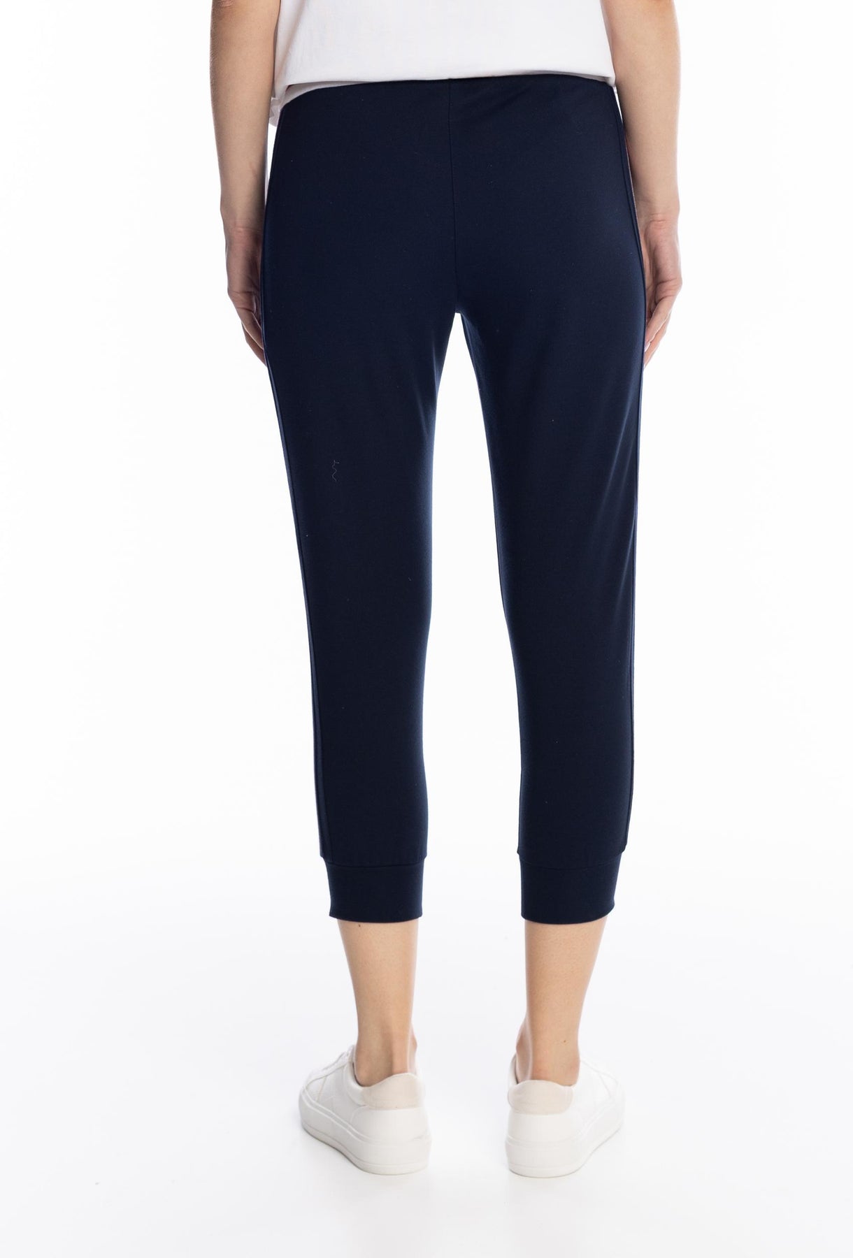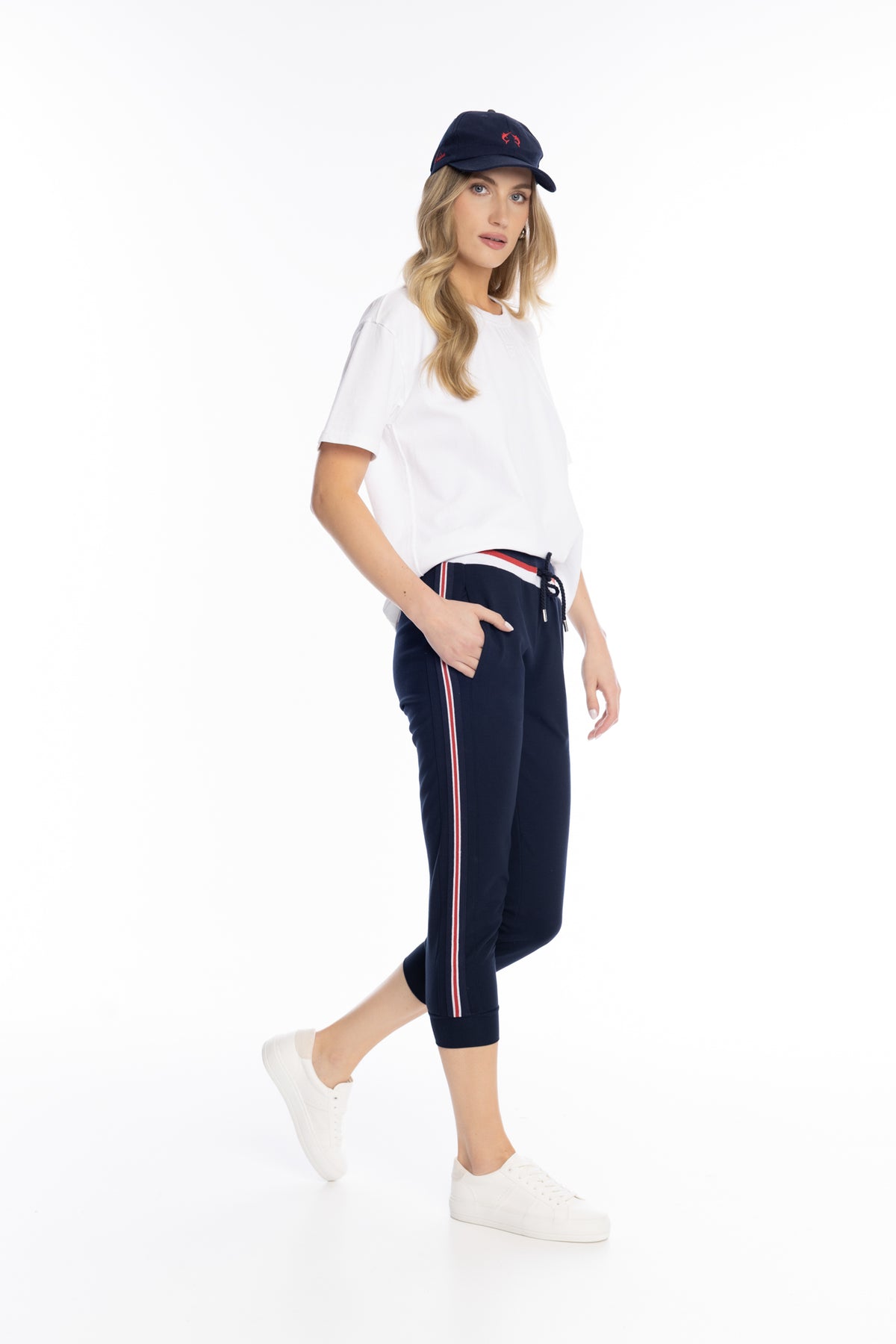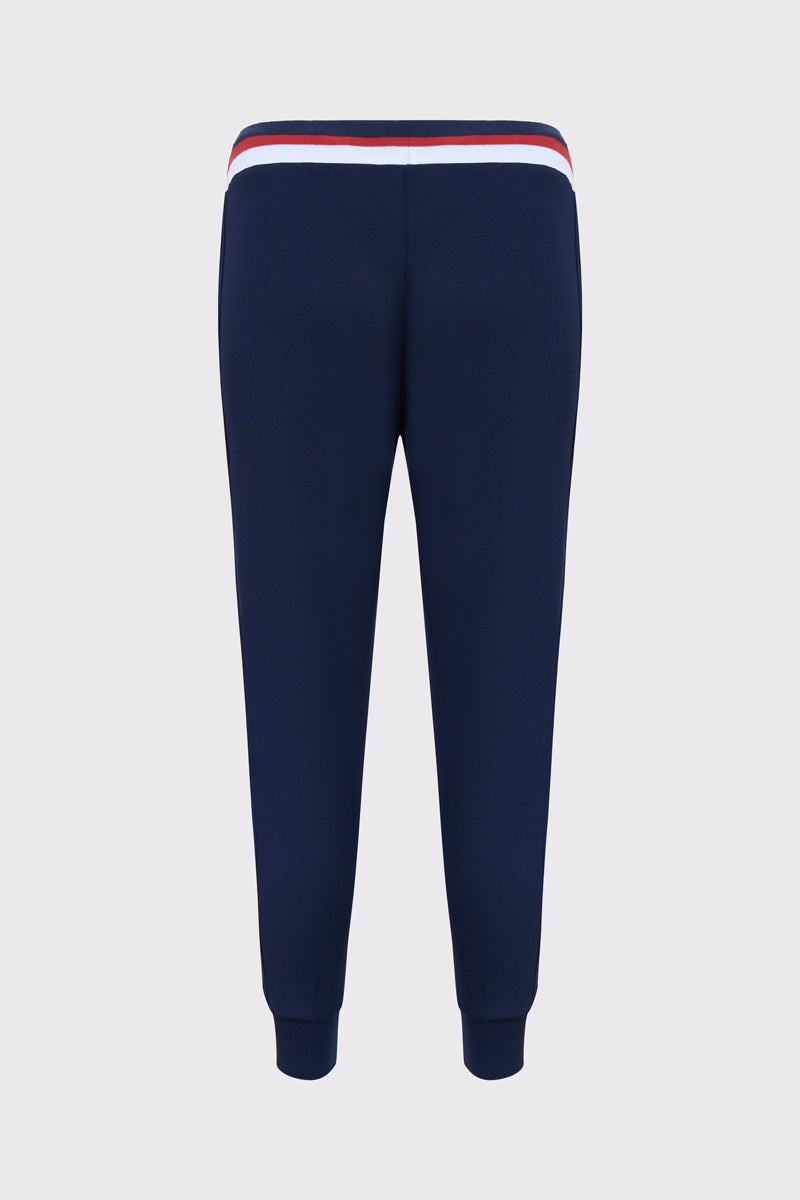 Komfortowe damskie spodnie dresowe Campione w kolorze głębokiego granatu, idealne do aktywnych i casualowych stylizacji. Model o długości 7/8 charakteryzuje się elastycznym pasem w kontrastowych biało-czerwonych barwach, dodatkowo regulowanym za pomocą ozdobnego sznurka z metalowymi końcówkami. Praktyczne boczne kieszenie zwiększają funkcjonalność, a dopasowany krój z nogawkami zakończonymi ściągaczami podkreśla sylwetkę, nie ograniczając przy tym swobody ruchów. Wysoka jakość materiału gwarantuje trwałość i wygodę, sprawiając, że spodnie te będą niezastąpionym elementem codziennej garderoby.