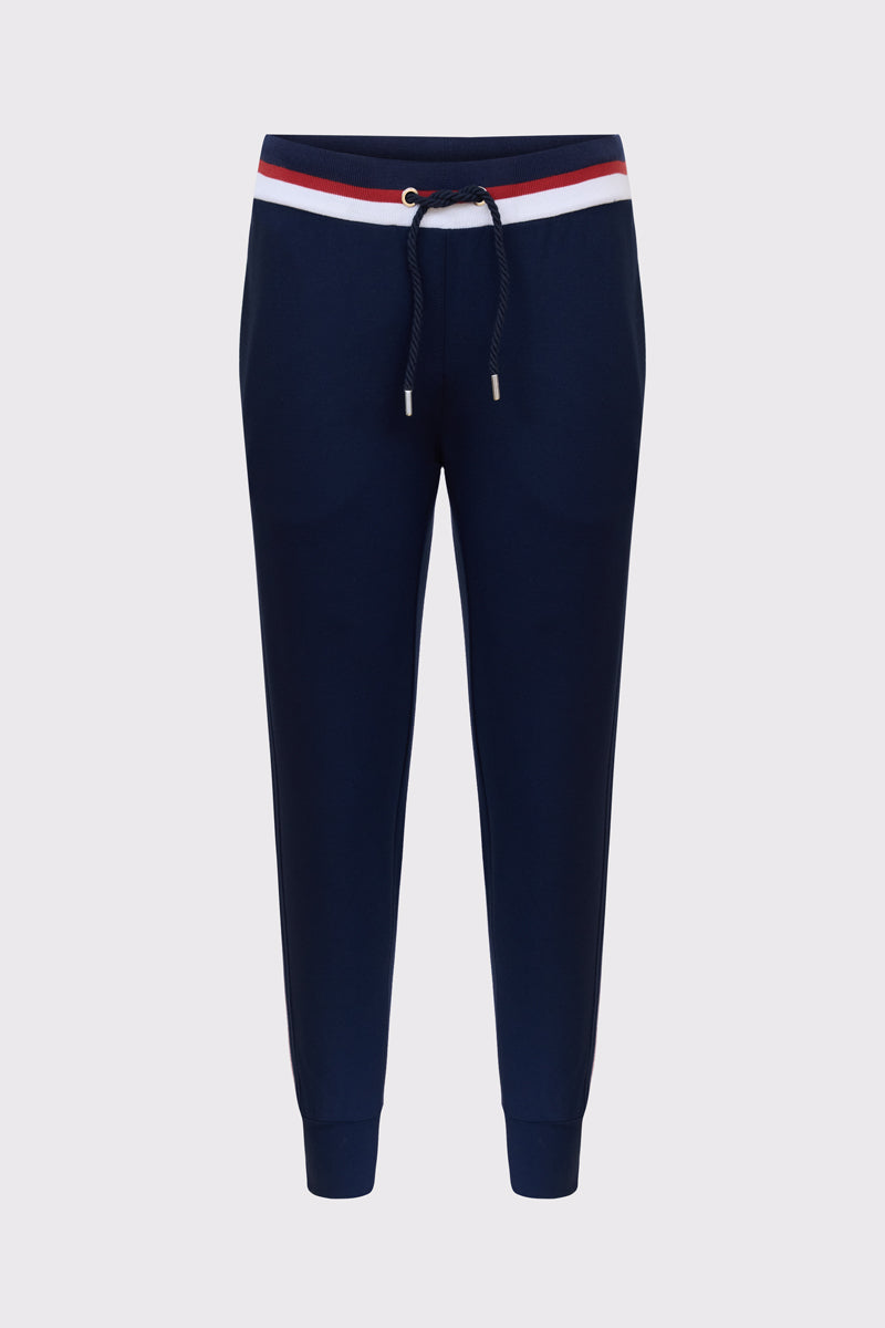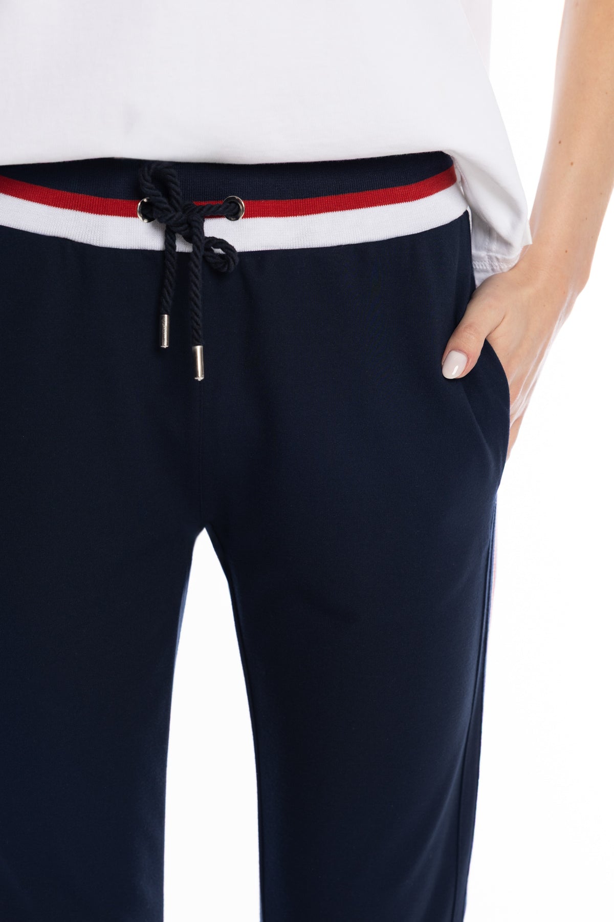 Granatowe spodnie dresowe z kontrastowym pasem i sznurkiem