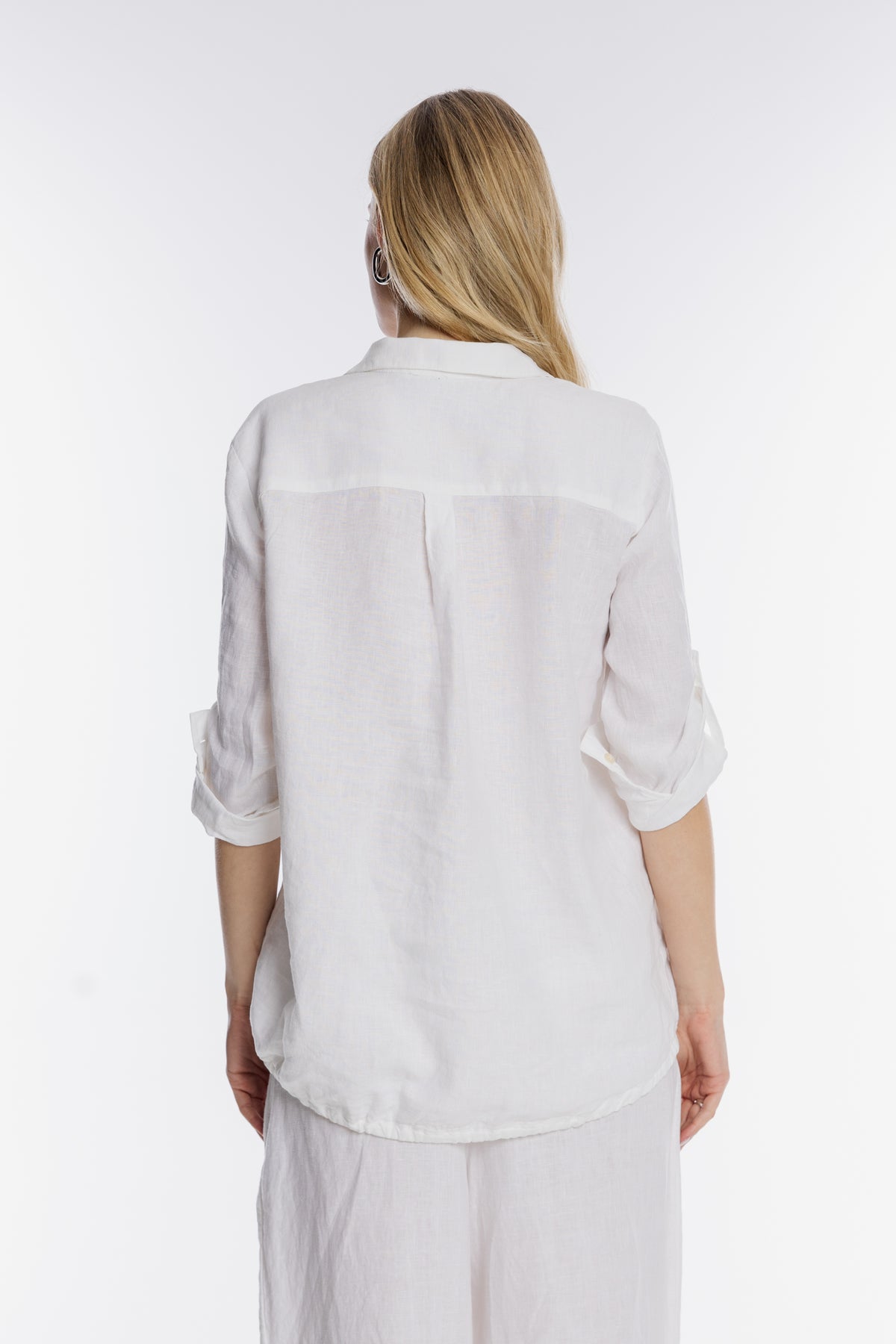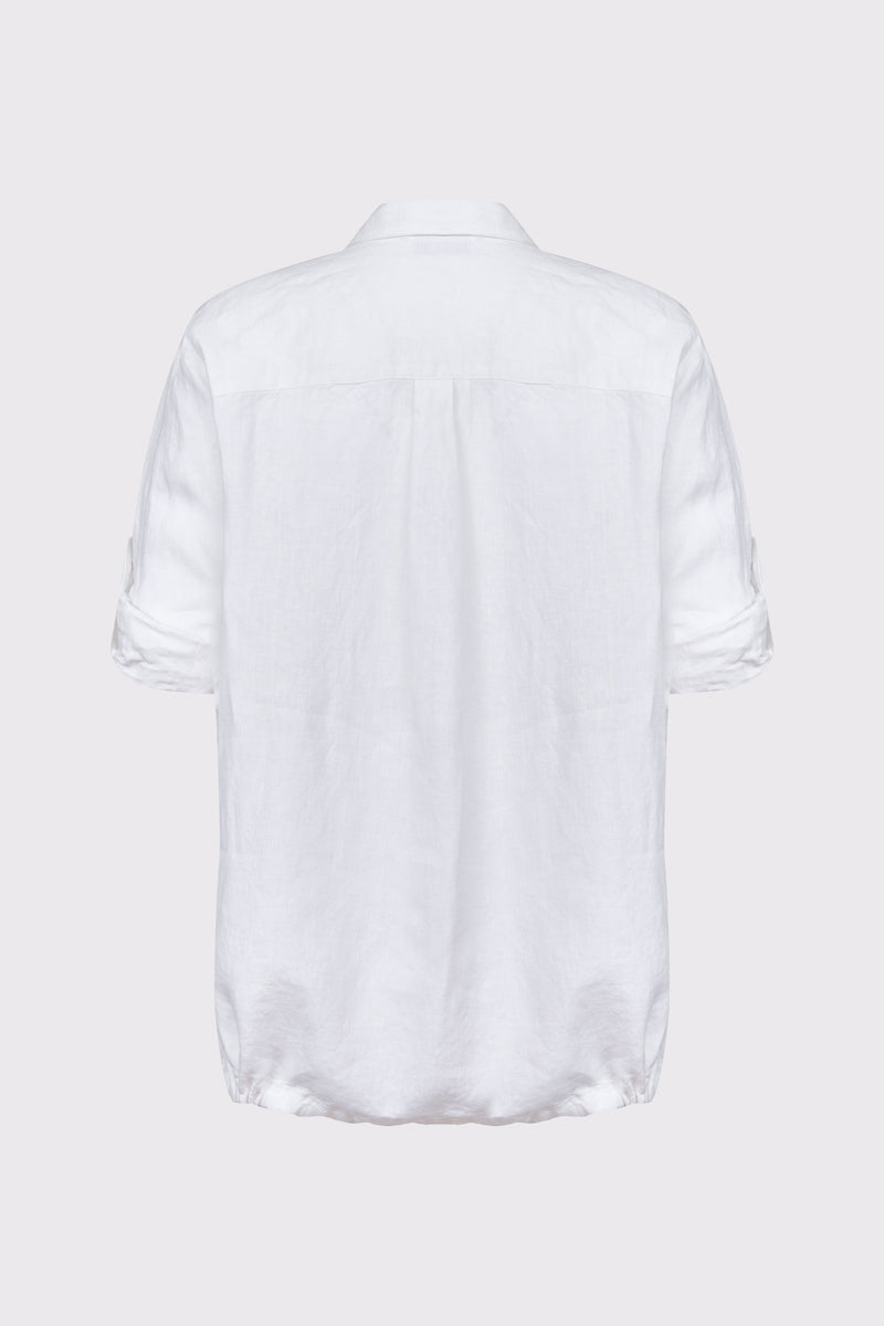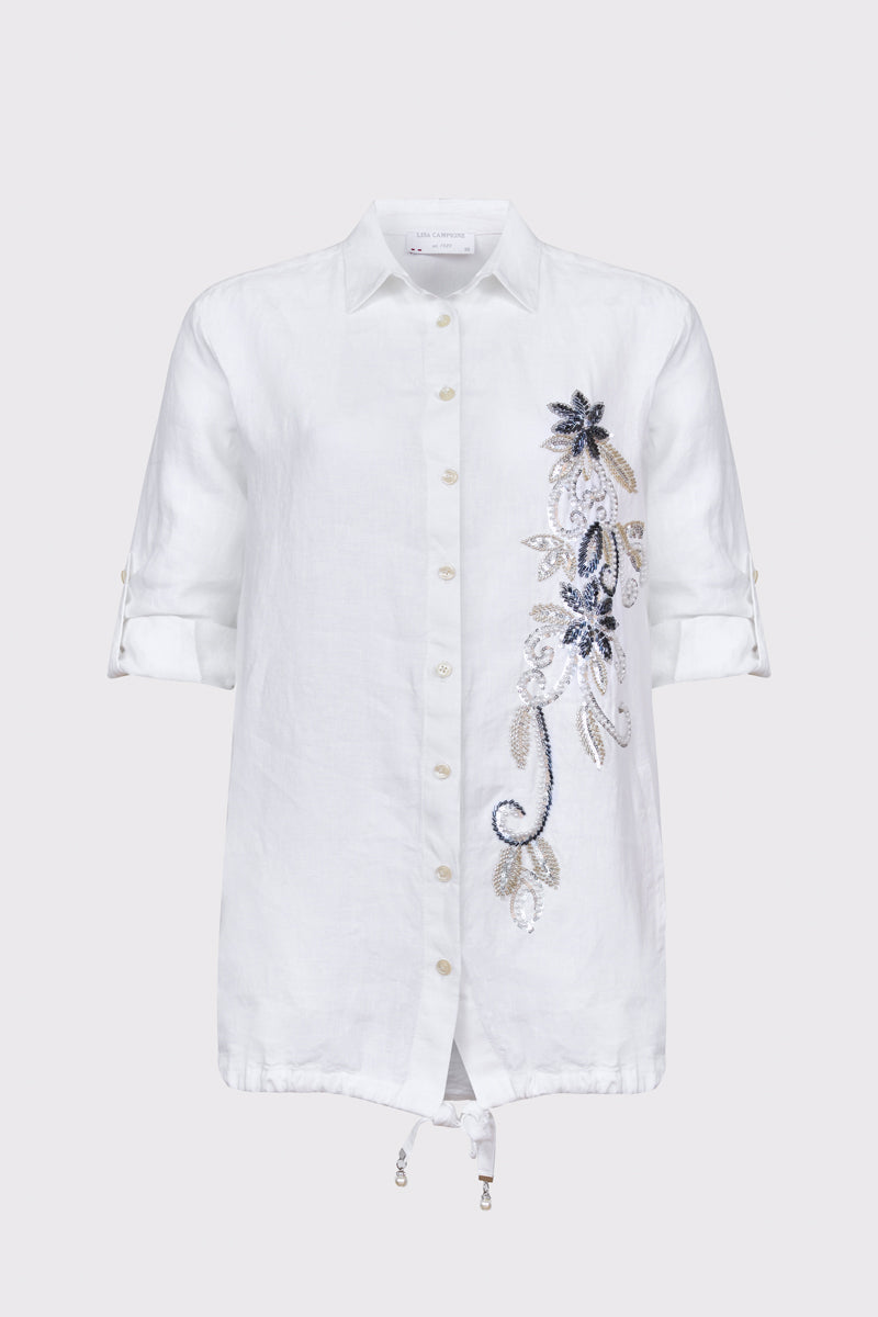 Wyjątkowa damska koszula Campione wykonana w 100% z wysokogatunkowego lnu, łącząca naturalną lekkość z wyrafinowanym stylem. Biały materiał został ozdobiony pionowym, artystycznym haftem o motywie roślinnym w odcieniach granatu i złota, wzbogaconym subtelnymi cekinami. Koszula posiada klasyczny kołnierzyk, zapięcie na guziki oraz rękawy o długości 3/4 z możliwością podwinięcia i podpięcia na patkę. Luźniejszy krój z zaokrąglonym dołem zapewnia swobodę i doskonale prezentuje się zarówno wypuszczony na spodnie, jak i włożony do środka. Idealna propozycja dla kobiet ceniących premium detale.