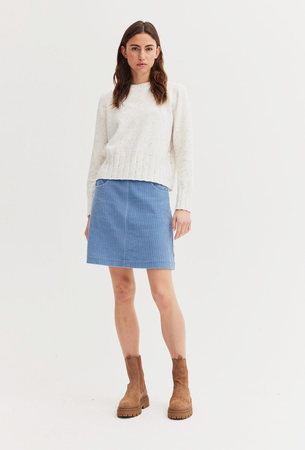 Miękki, przyjemny w dotyku sweter o klasycznym, prostym kroju. Wykonany z dzianiny z subtelnymi, kolorowymi drobinkami, które nadają mu oryginalnego charakteru. Posiada okrągły dekolt wykończony ściągaczem oraz prążkowane wykończenia przy mankietach i dole, co podkreśla jego swobodny, codzienny styl. Idealny na co dzień – pasuje zarówno do jeansów, jak i spódnic, tworząc komfortowe, casualowe stylizacje. Dzięki neutralnemu kolorowi łatwo dopasować go do różnych dodatków i okryć wierzchnich.
