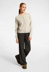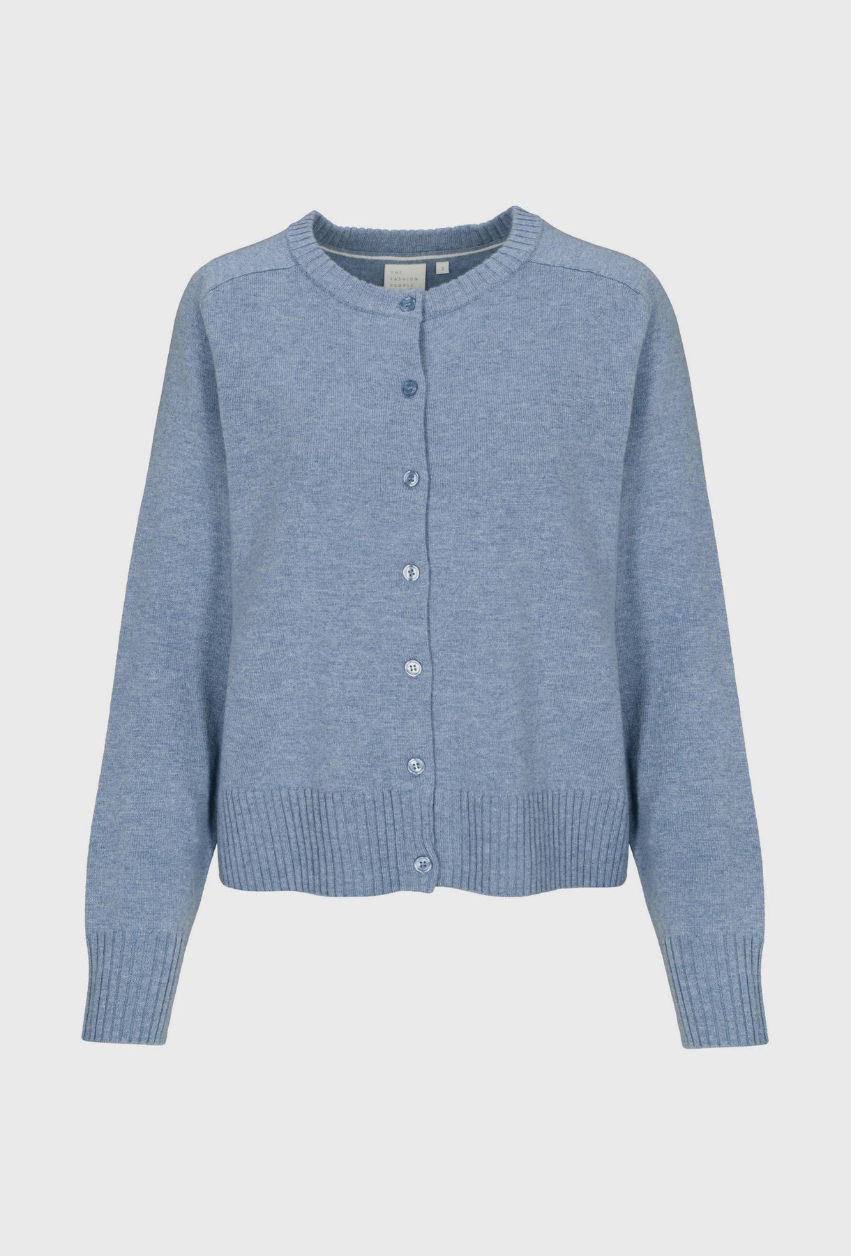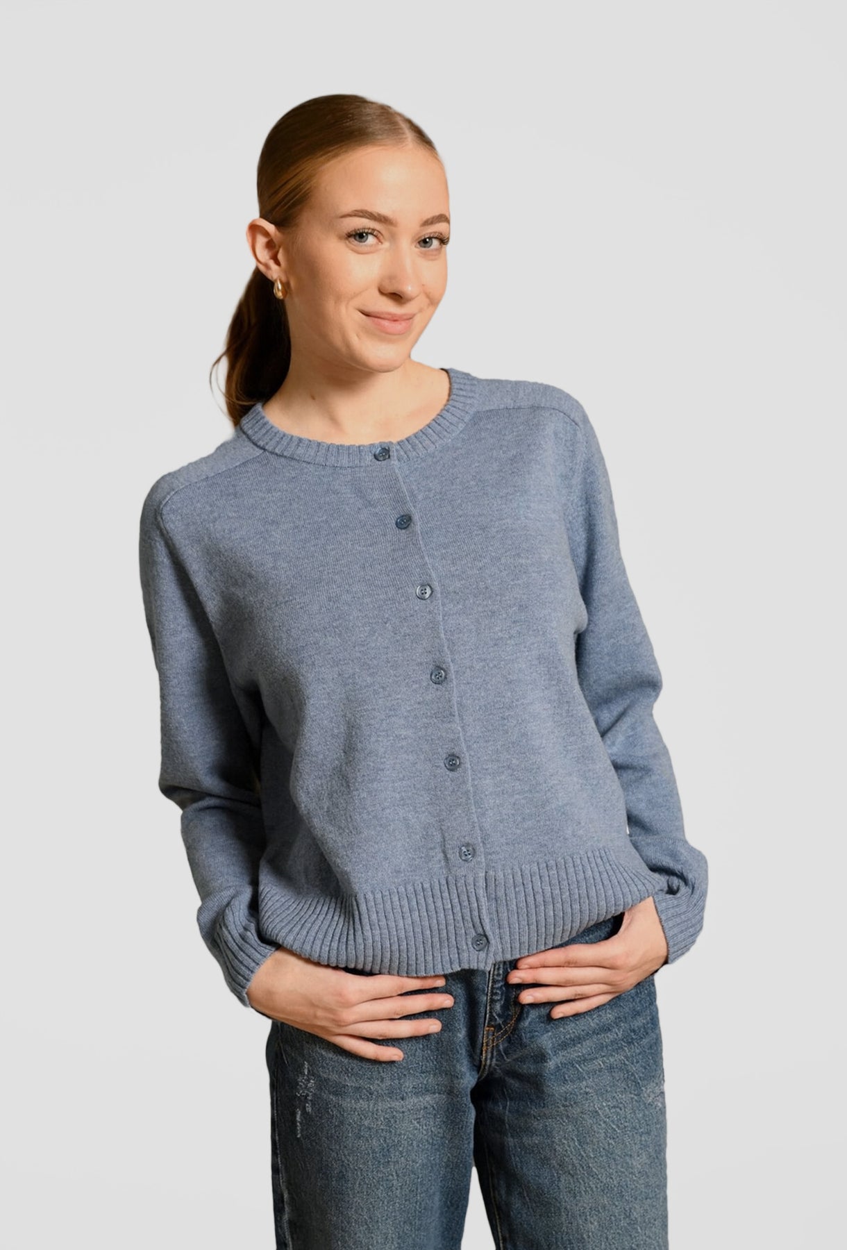 Klasyczny, lekki kardigan w odcieniu jasnego błękitu. Wykonany z miękkiej, przyjemnej w dotyku dzianiny, zapewnia komfort noszenia i uniwersalny charakter. Model posiada okrągły dekolt, długie rękawy oraz zapięcie na guziki w kolorze swetra. Prążkowane wykończenia przy mankietach, dole i dekolcie nadają mu subtelnej elegancji. Idealny jako uzupełnienie codziennych stylizacji – świetnie prezentuje się zarówno w duecie z jeansami, jak i w zestawieniu z sukienką czy spódnicą. Ponadczasowy fason sprawia, że to baza w garderobie na wiele okazji.