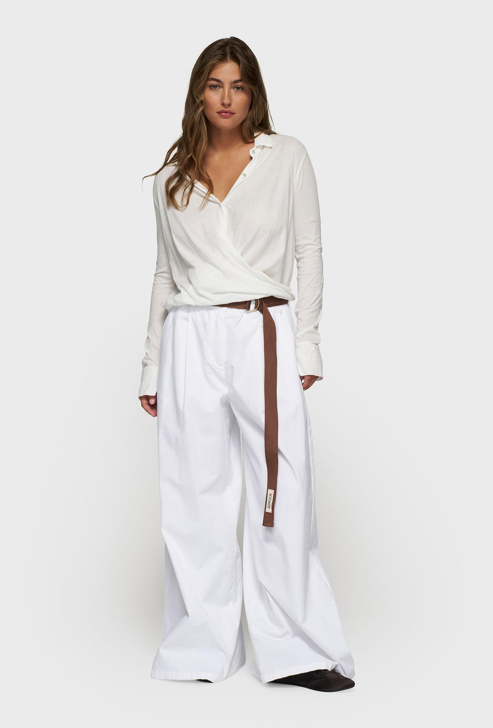 Długie spodnie o szerokim kroju w białym kolorze, ściągane na pasek