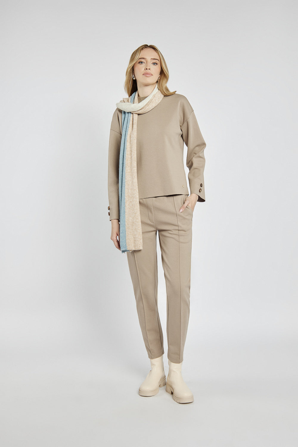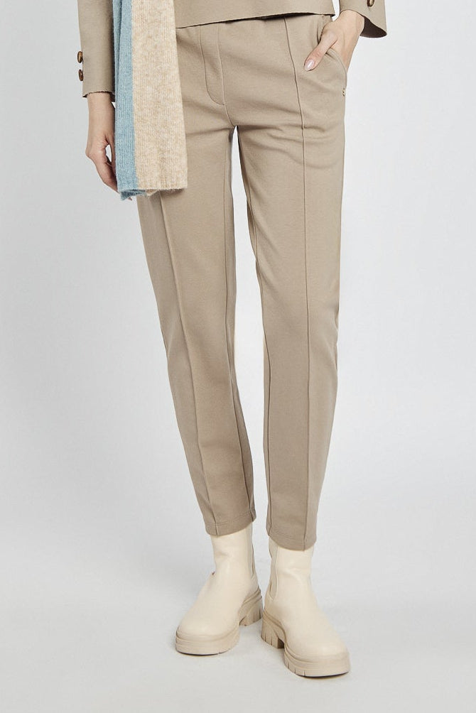 Beżowe damskie spodnie z kantem i gumką w pasie