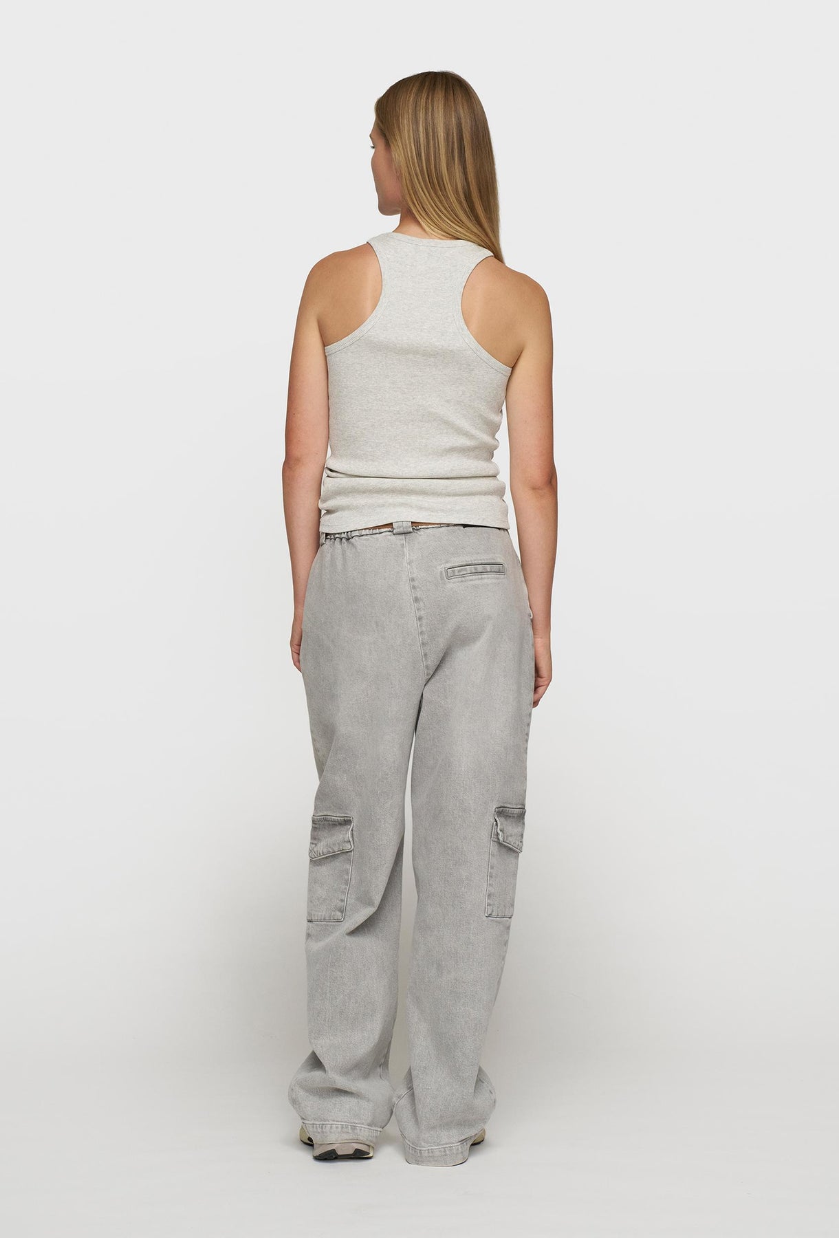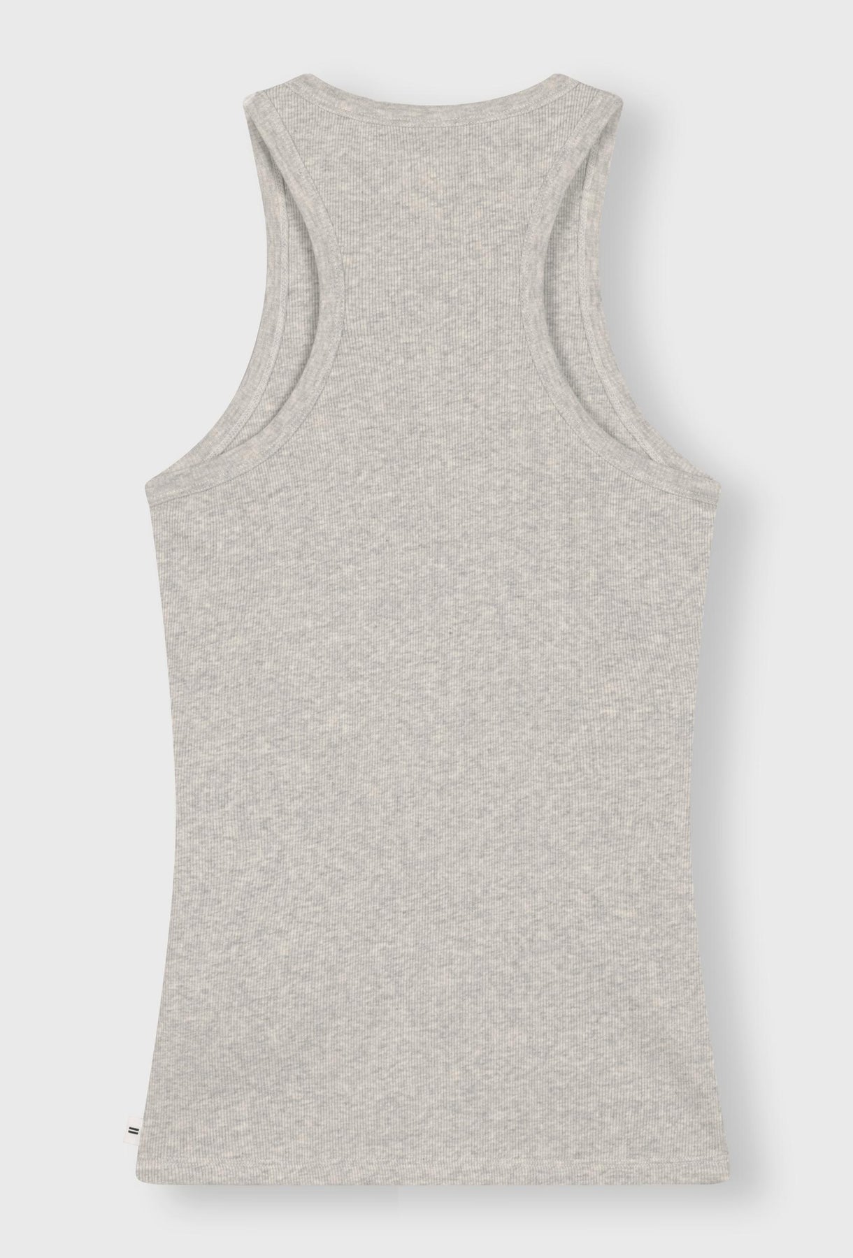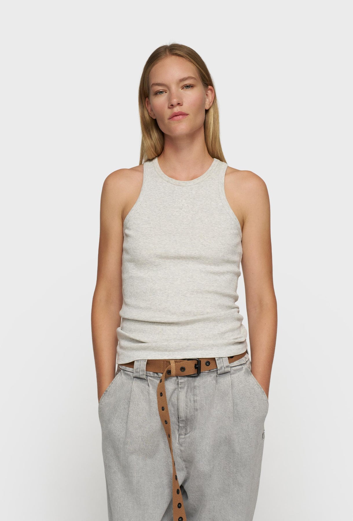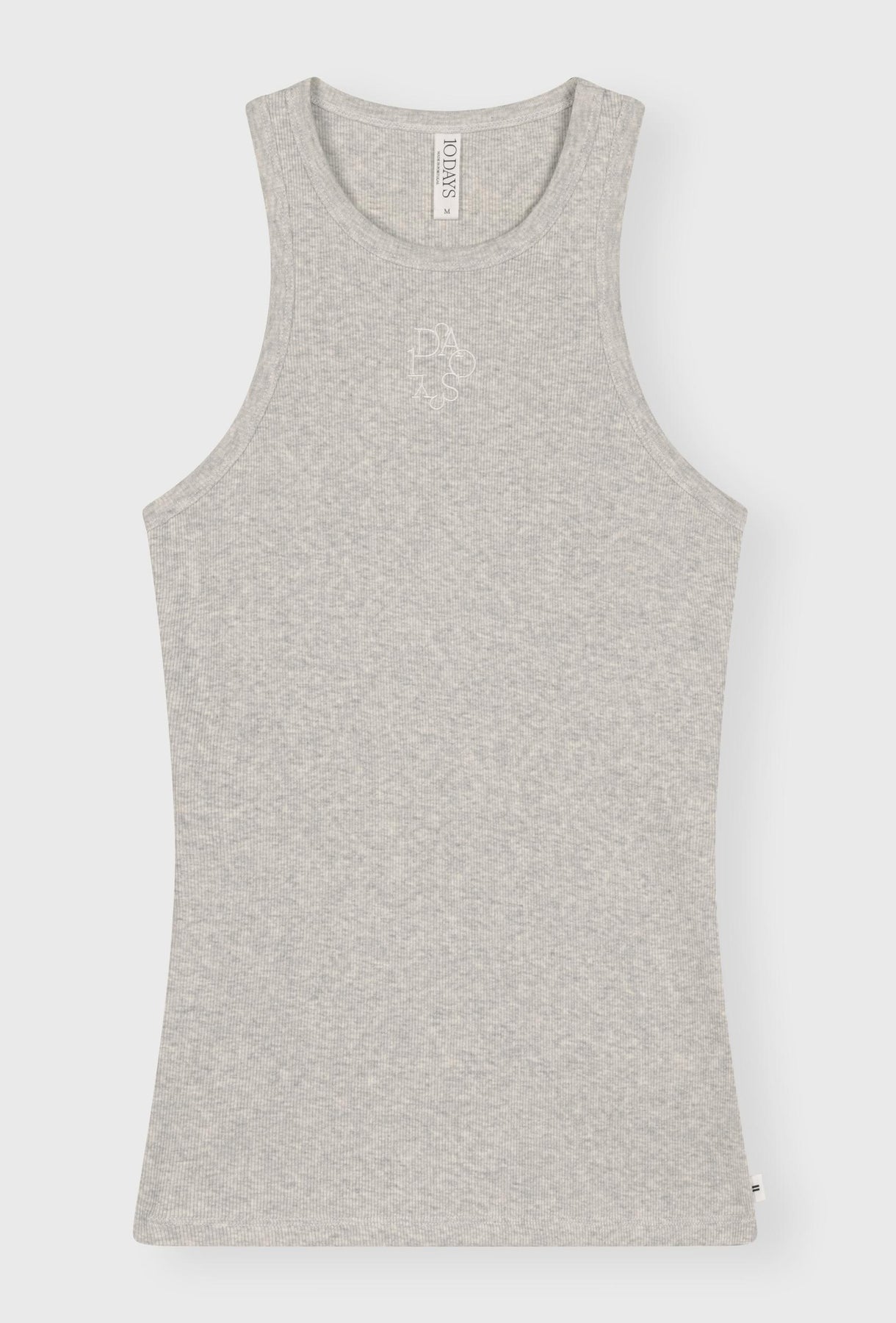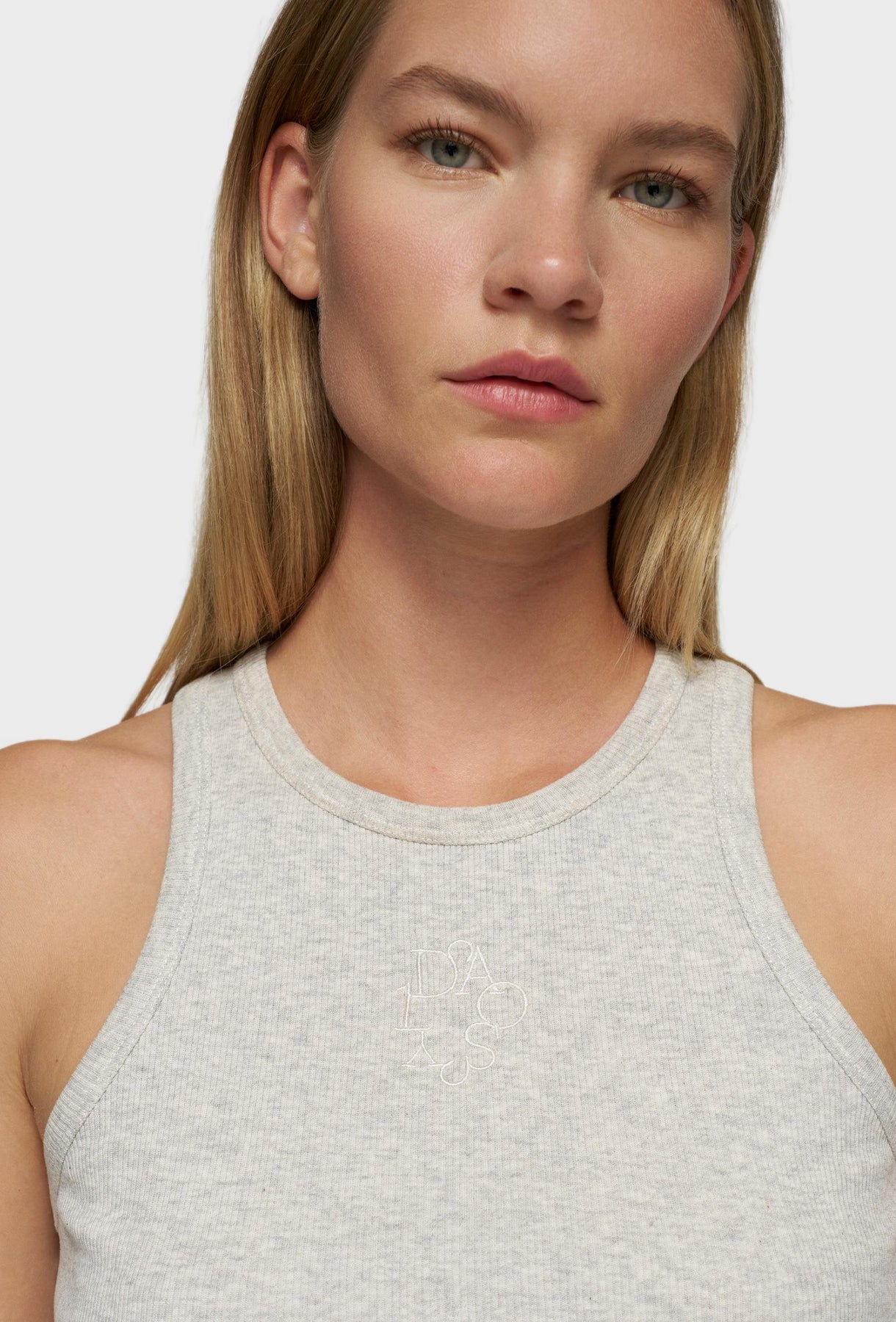 Top na ramiączkach o kroju bokserki wykonany z miękkiej, prążkowanej bawełny z domieszką elastanu, dzięki czemu doskonale dopasowuje się do sylwetki i zapewnia wygodę noszenia. Klasyczny, prosty fason z okrągłym dekoltem sprawia, że jest to uniwersalna baza do wielu stylizacji – zarówno codziennych, jak i sportowych. Subtelne haftowane logo na piersi dodaje całości minimalistycznego charakteru. Naturalny, jasnoszary melanż sprawia, że top łatwo łączy się z innymi elementami garderoby. Idealny do noszenia samodzielnie w ciepłe dni lub jako warstwa bazowa pod koszule, marynarki czy swetry.