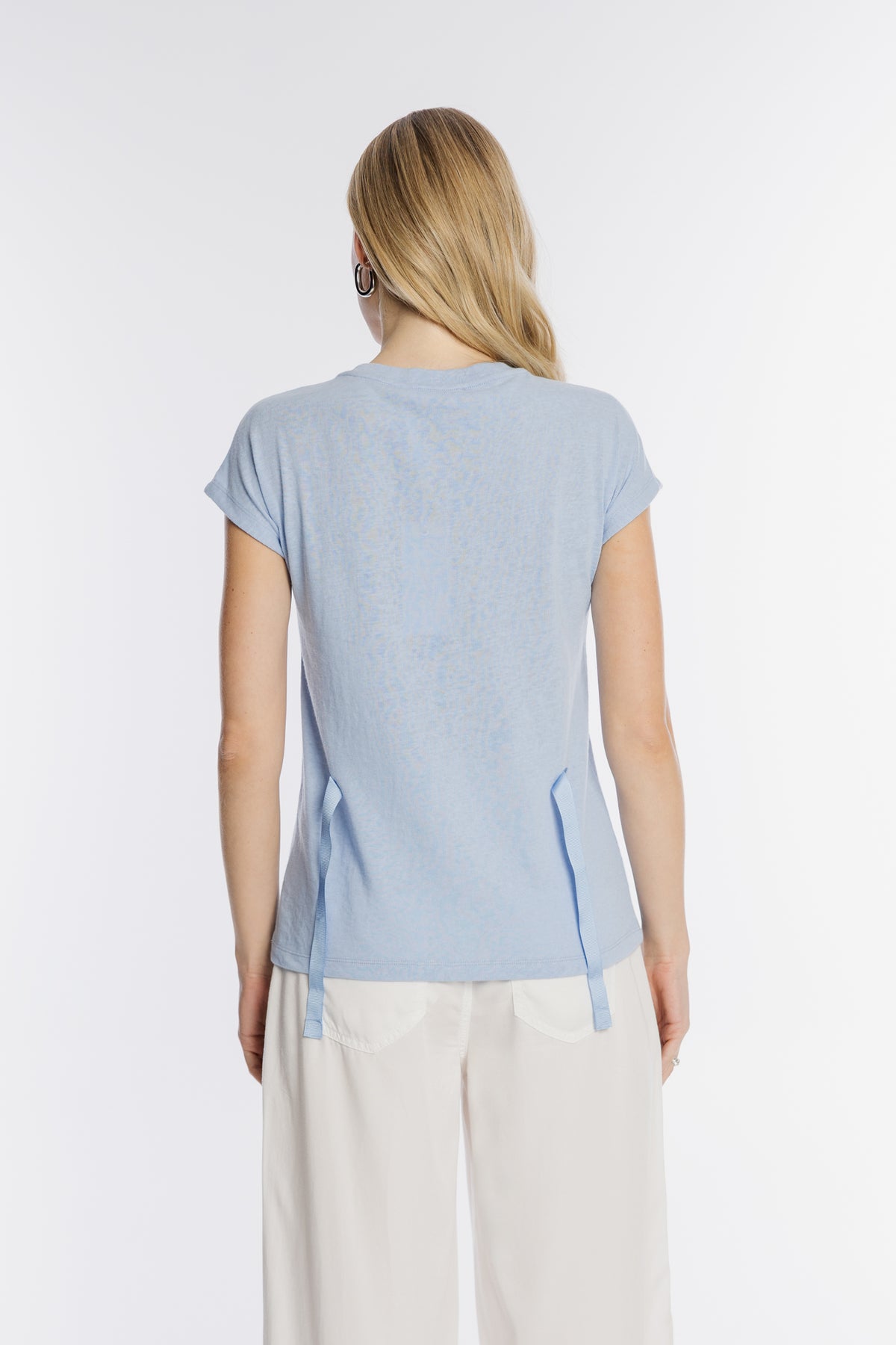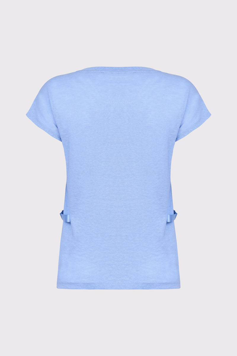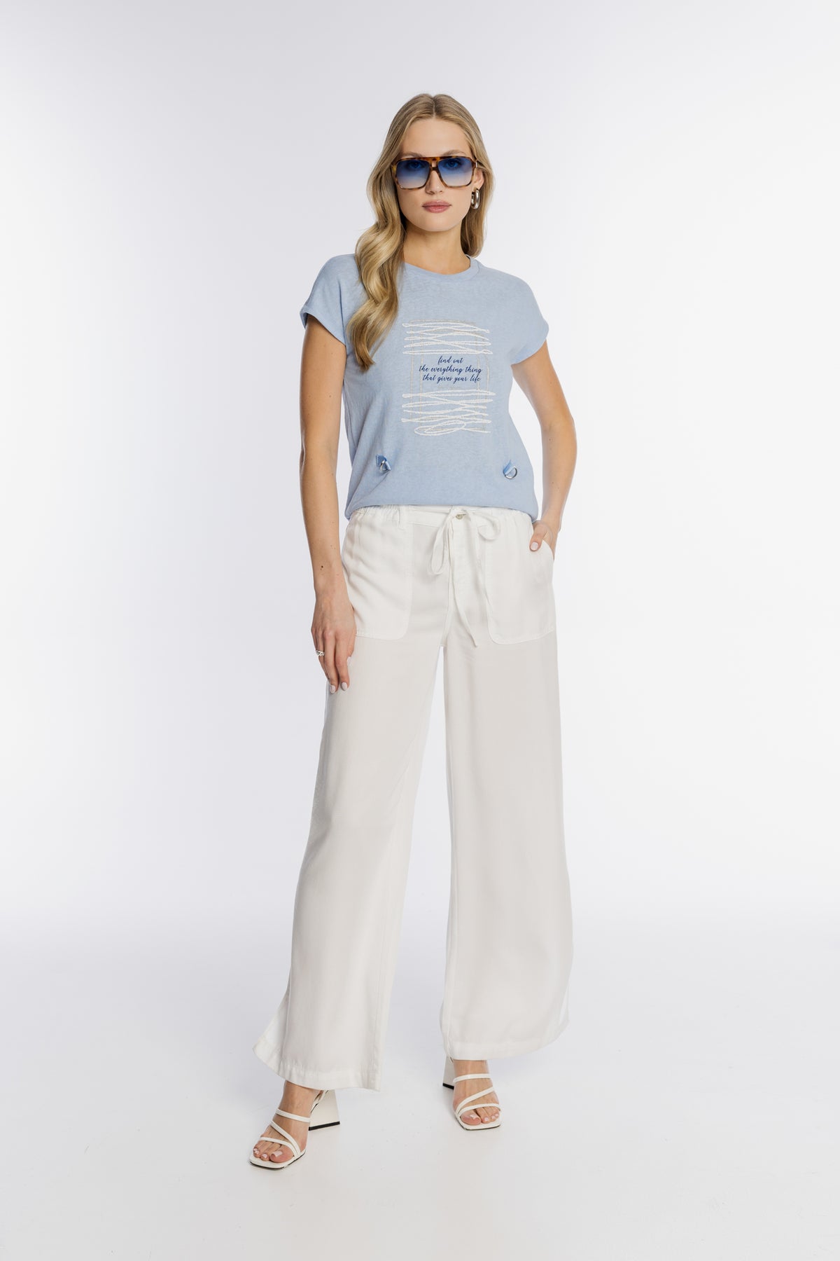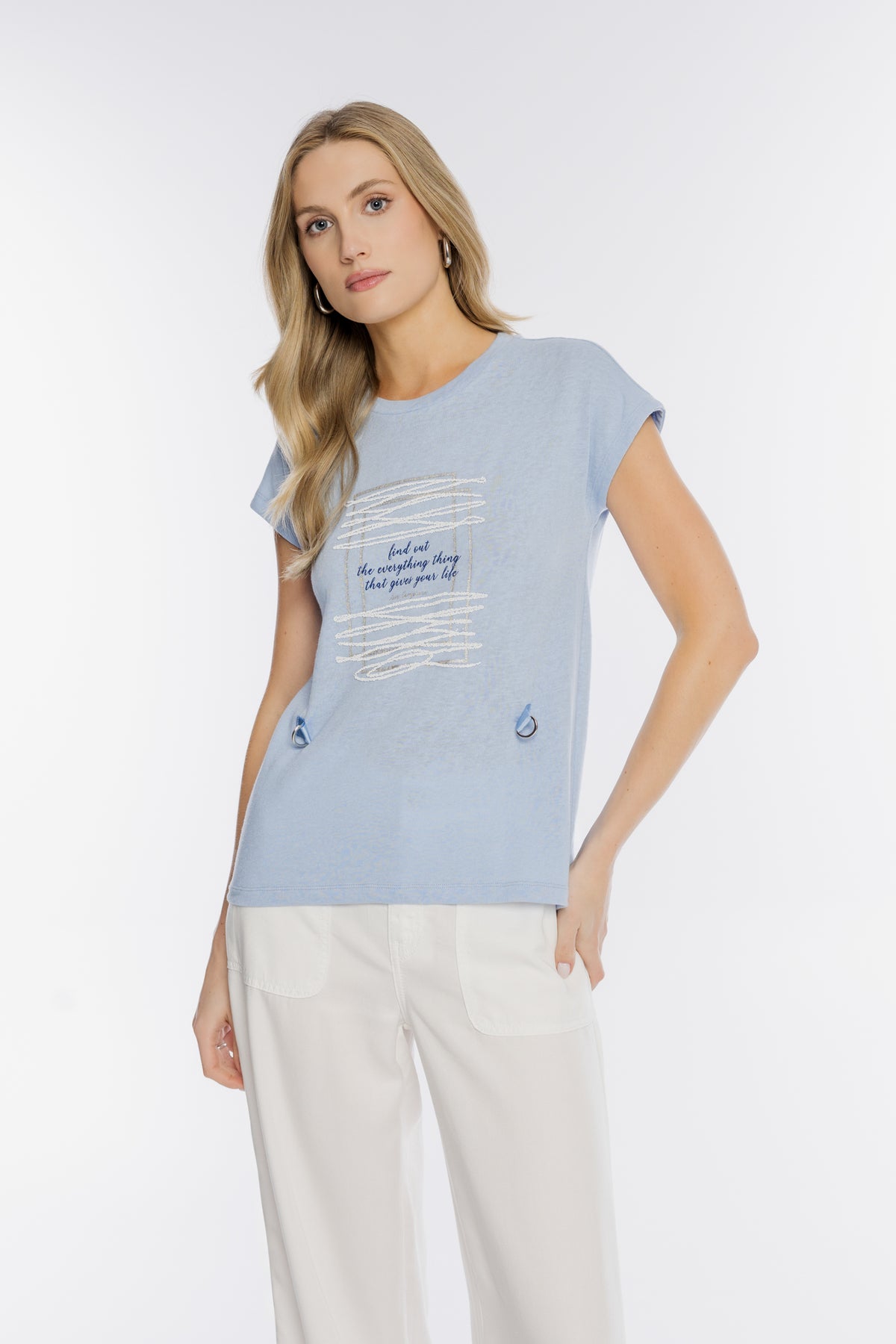 Komfortowy damski T-shirt w błękitnym kolorze, wykonany z miękkiej dzianiny. Front zdobi unikatowy nadruk z napisem oraz połyskującymi detalami. Ciekawym elementem dekoracyjnym są błękitne tasiemki z metalowymi kółeczkami, nadające koszulce nowoczesnego charakteru. Krótki rękaw i okrągły dekolt zapewniają wygodę. To idealna propozycja do letnich stylizacji z białymi spodniami.