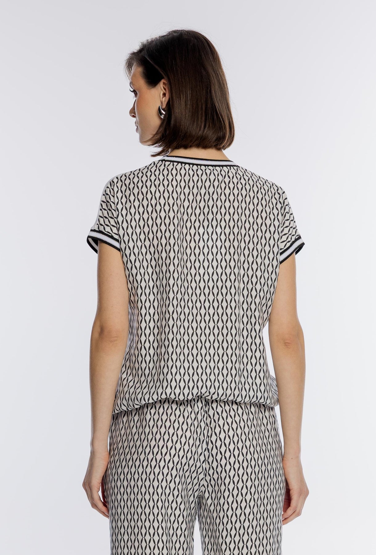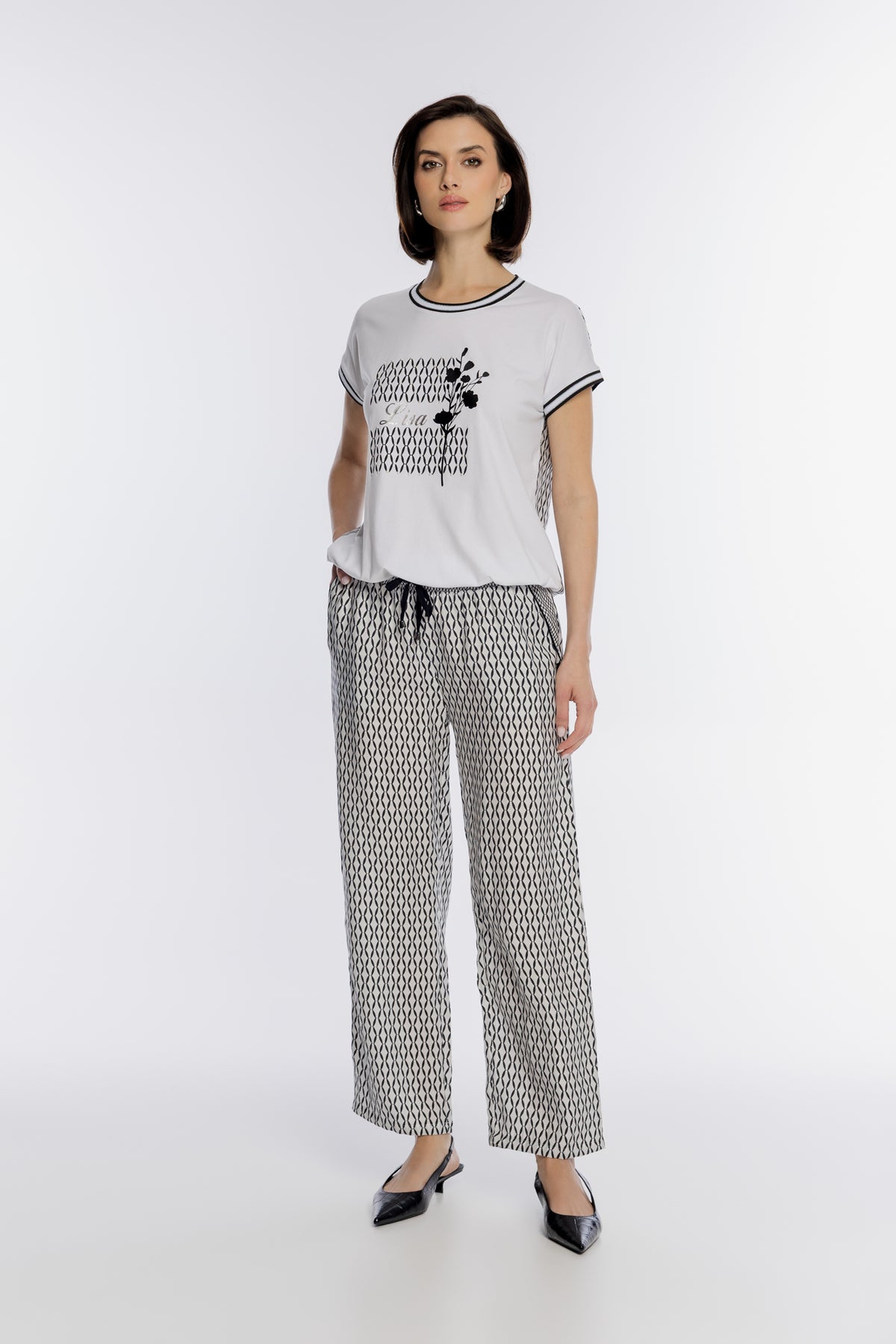 Biały t-shirt z ozdobnym nadrukiem i czarną lamówką