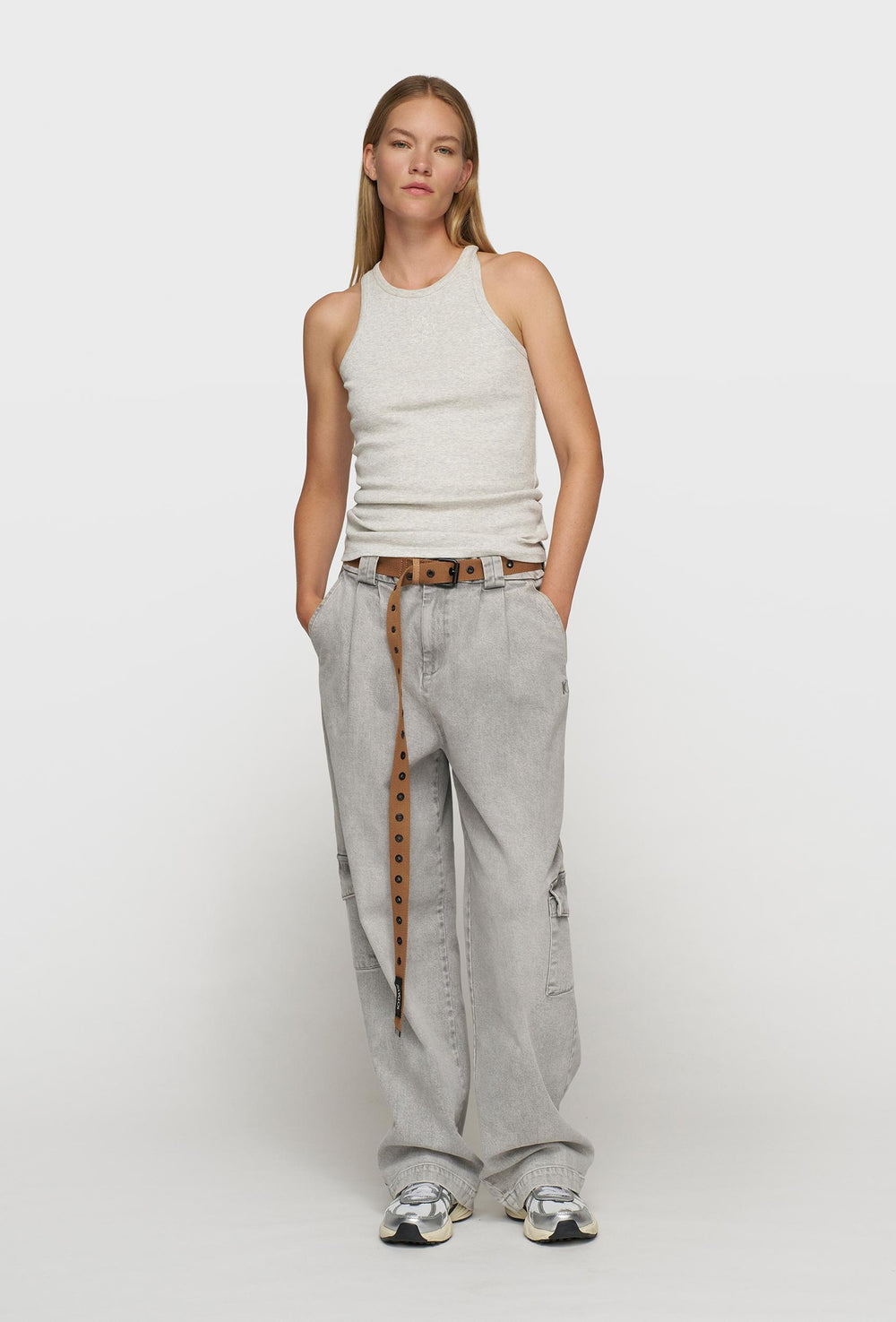 Dopasowany top na ramiączkach z prążkowanej bawełny w kolorze taupe