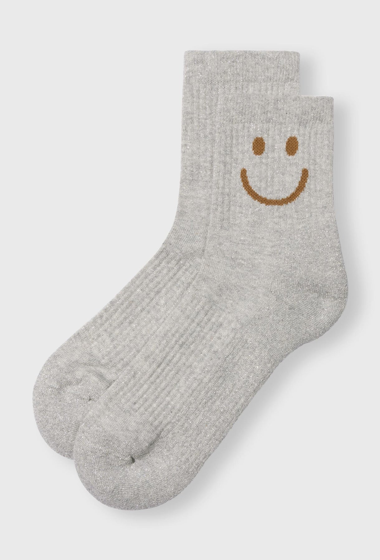 Te skarpetki to wygodne, bawełniane skarpety w kolorze jasnoszarym z delikatnym połyskiem. Wyróżnia je zabawny, brązowy nadruk w kształcie uśmiechniętej buźki umieszczony z boku, tuż nad kostką. Mają prążkowaną strukturę, co sprawia, że dobrze trzymają się na nodze, nie uciskając jej zbyt mocno. Idealne do codziennych stylizacji – dodają im lekkości i humorystycznego akcentu. Sprawdzą się zarówno do sneakersów, jak i w domowych, casualowych zestawach.