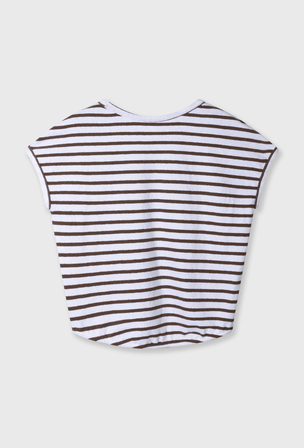 Brązowo-biały T-shirt w paski z haftowanym logo